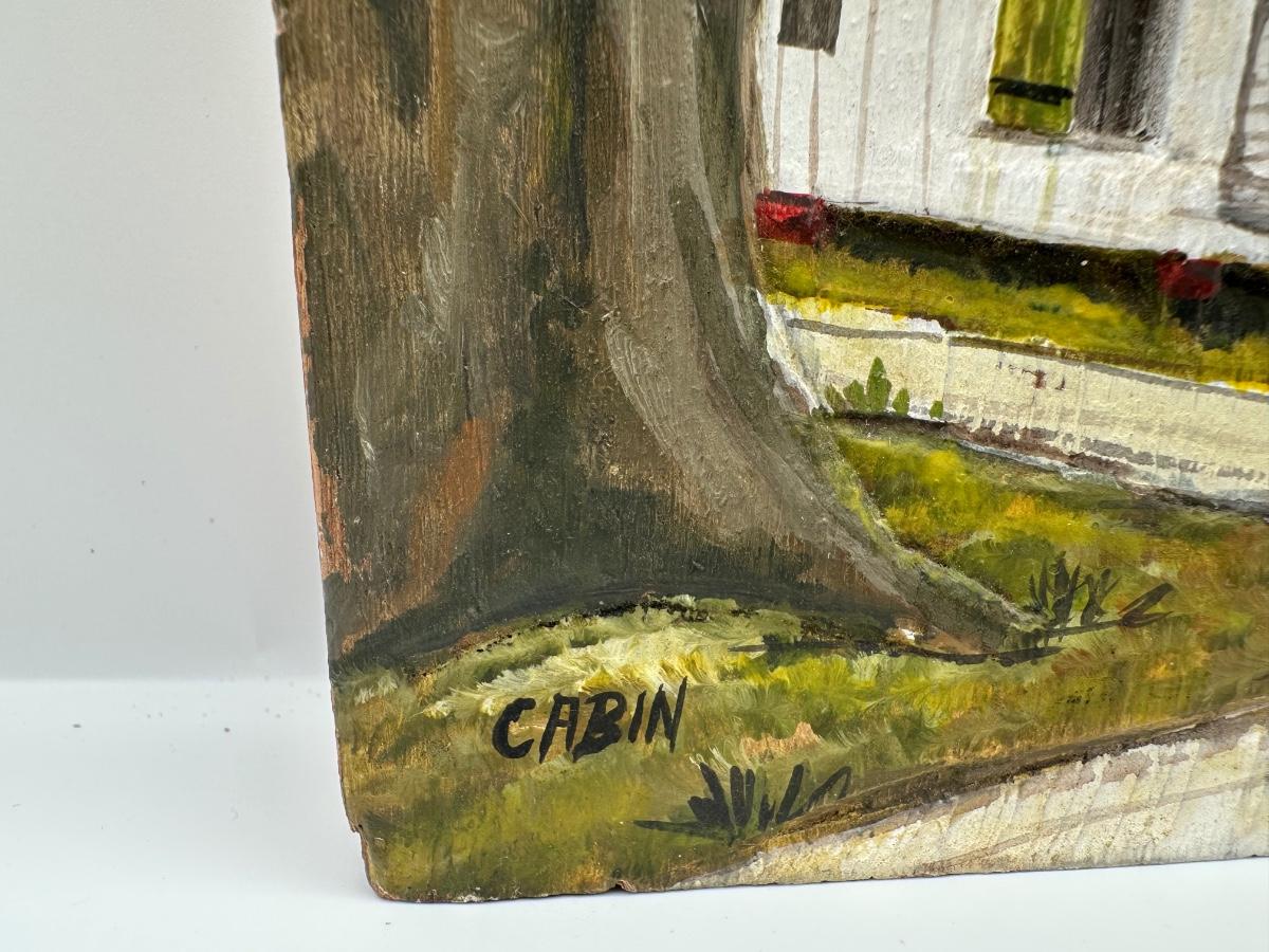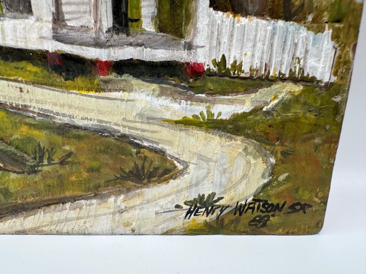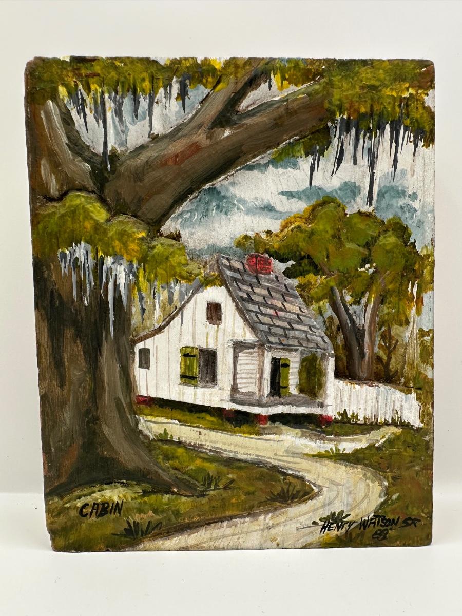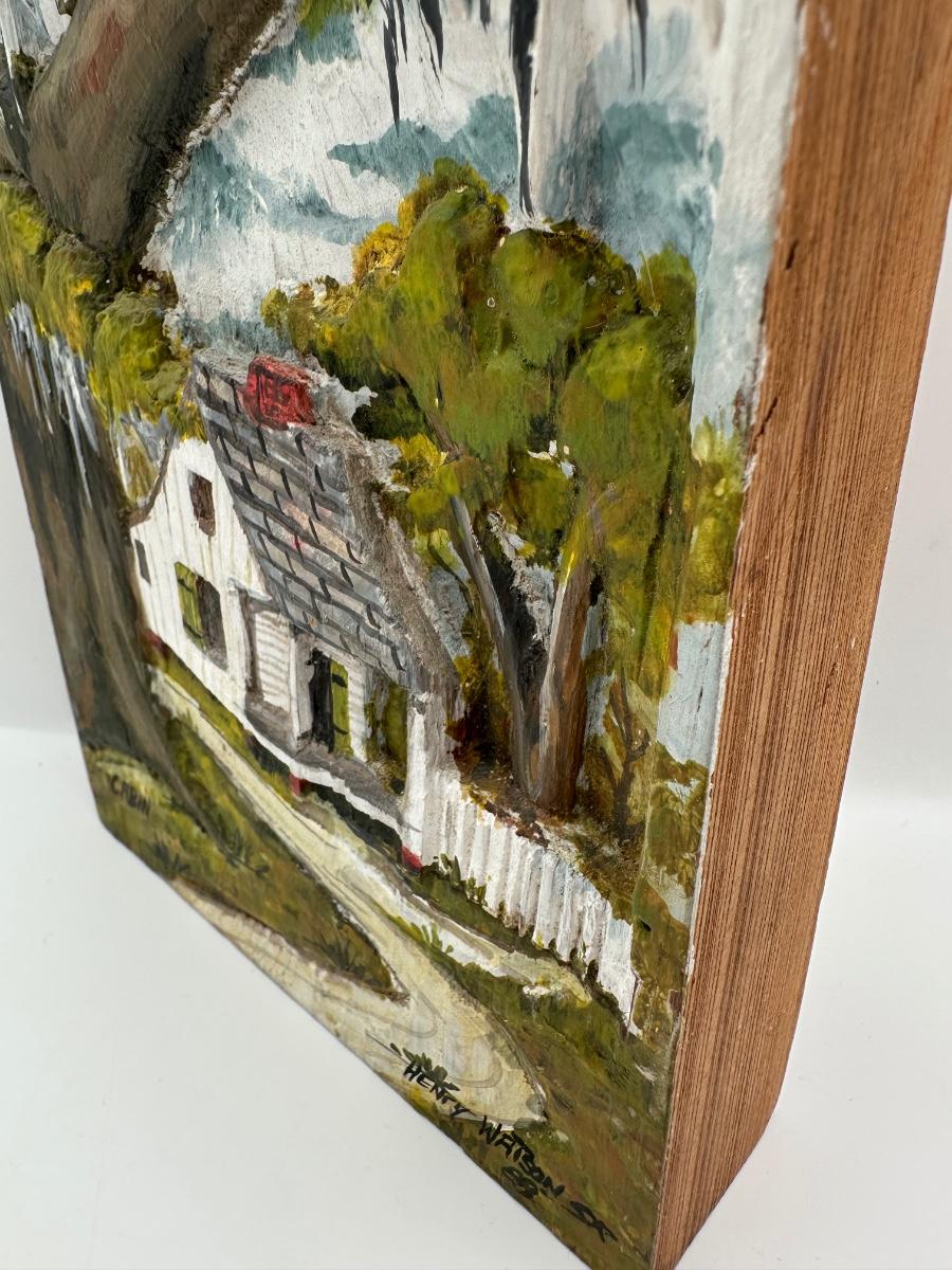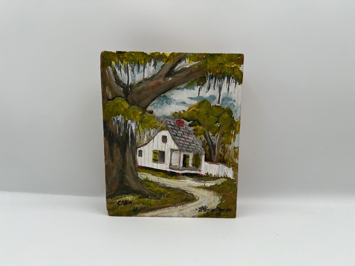 Henry Watson “Cabin” Oil on Carved Cypress, 1988