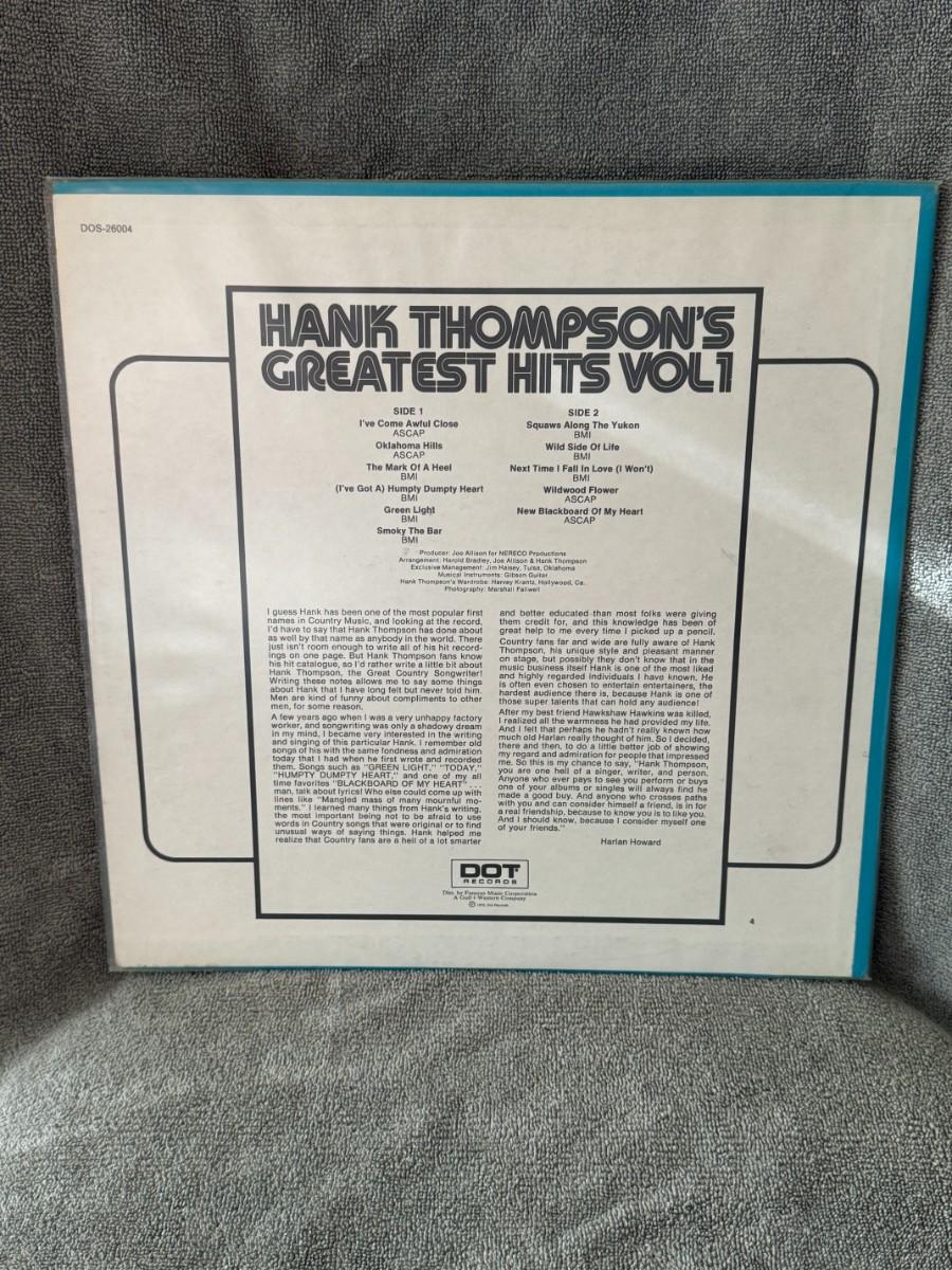Album Details: This compilation album features some of Hank Thompson's most famous songs, released on the Dot Records label in 1972. The catalog number is DOS-26004.