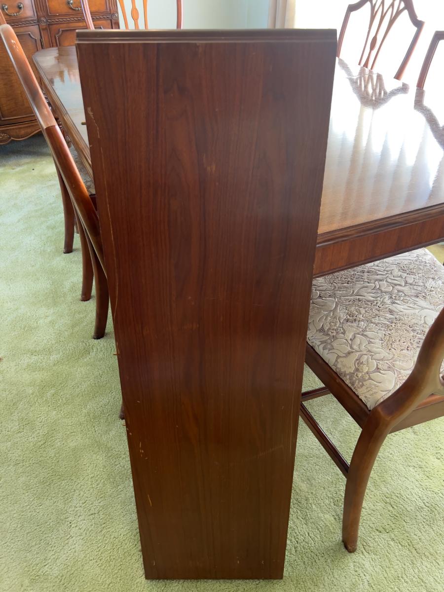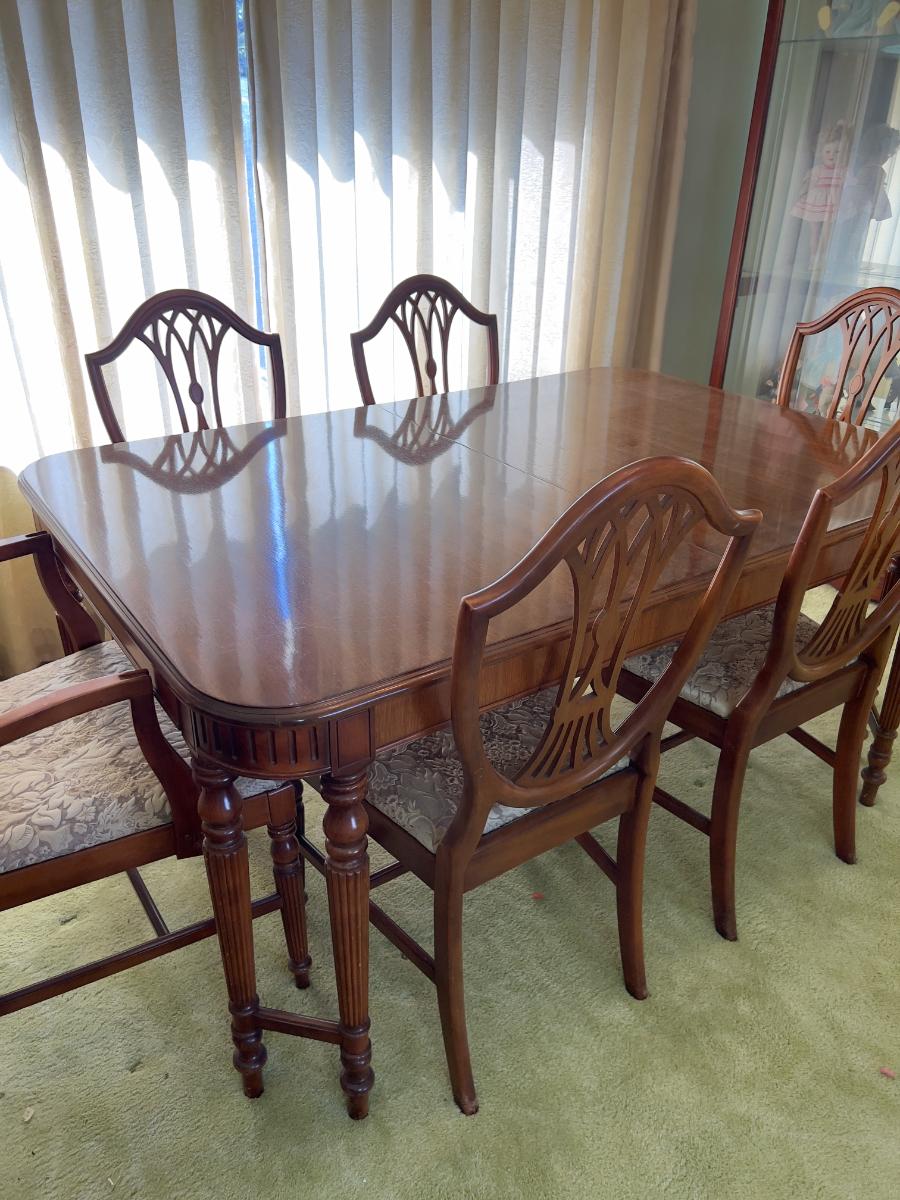 Very Good Condition! Has 1 Leaf and 6 chairs. Measures 62 X 42. Leaf is another 12" for 74" Total Length.