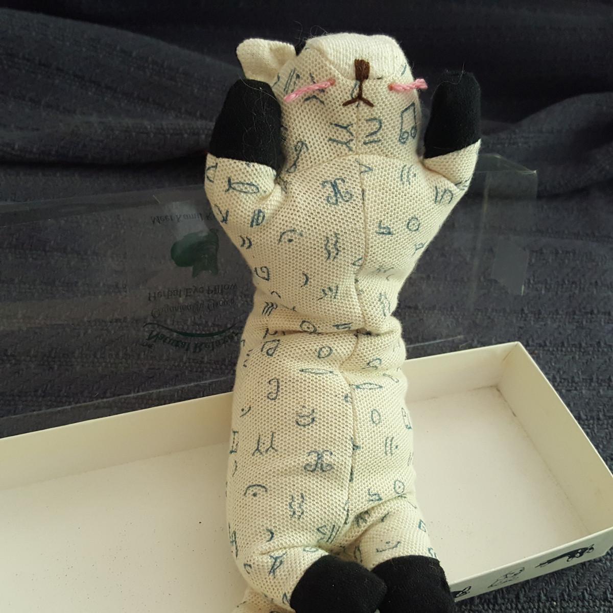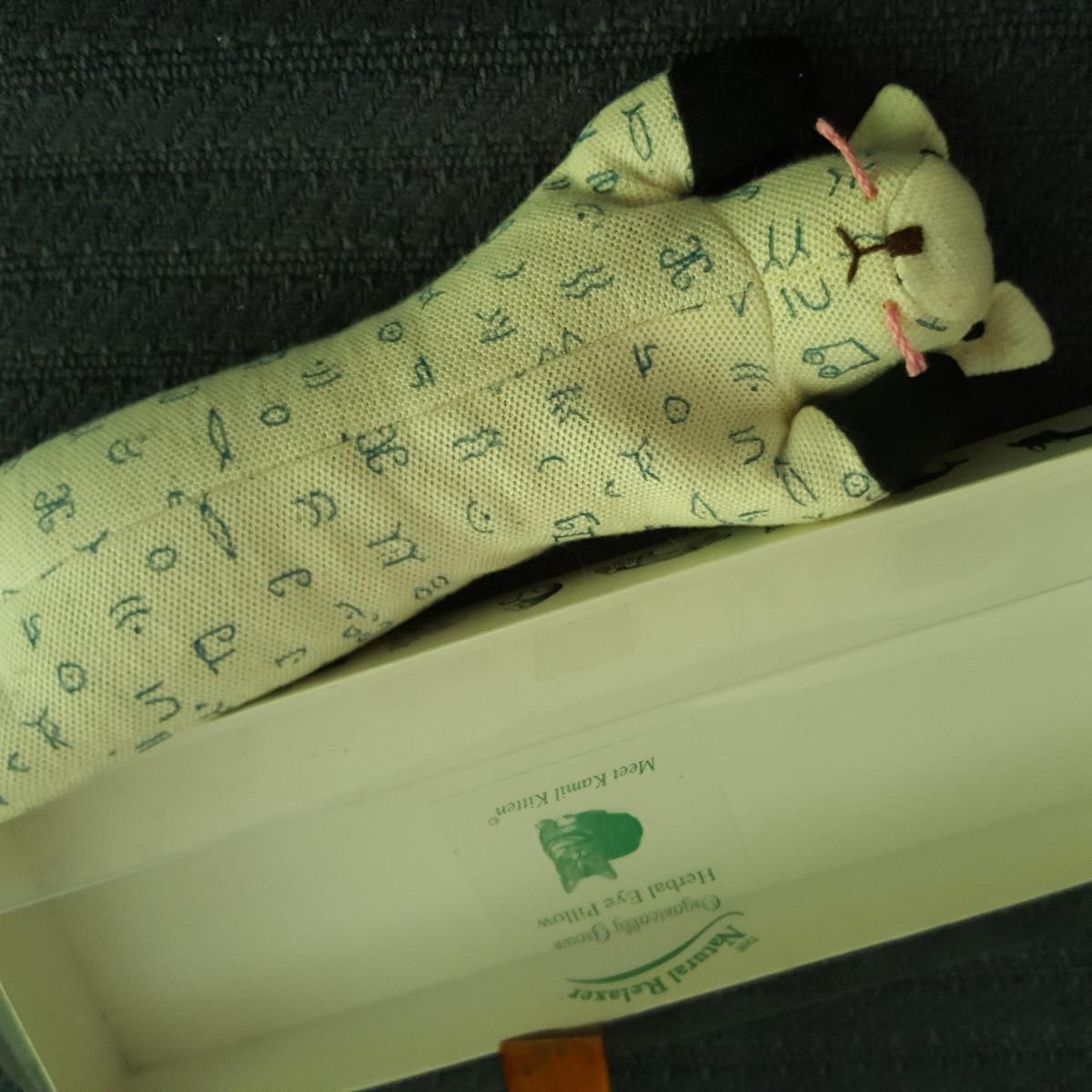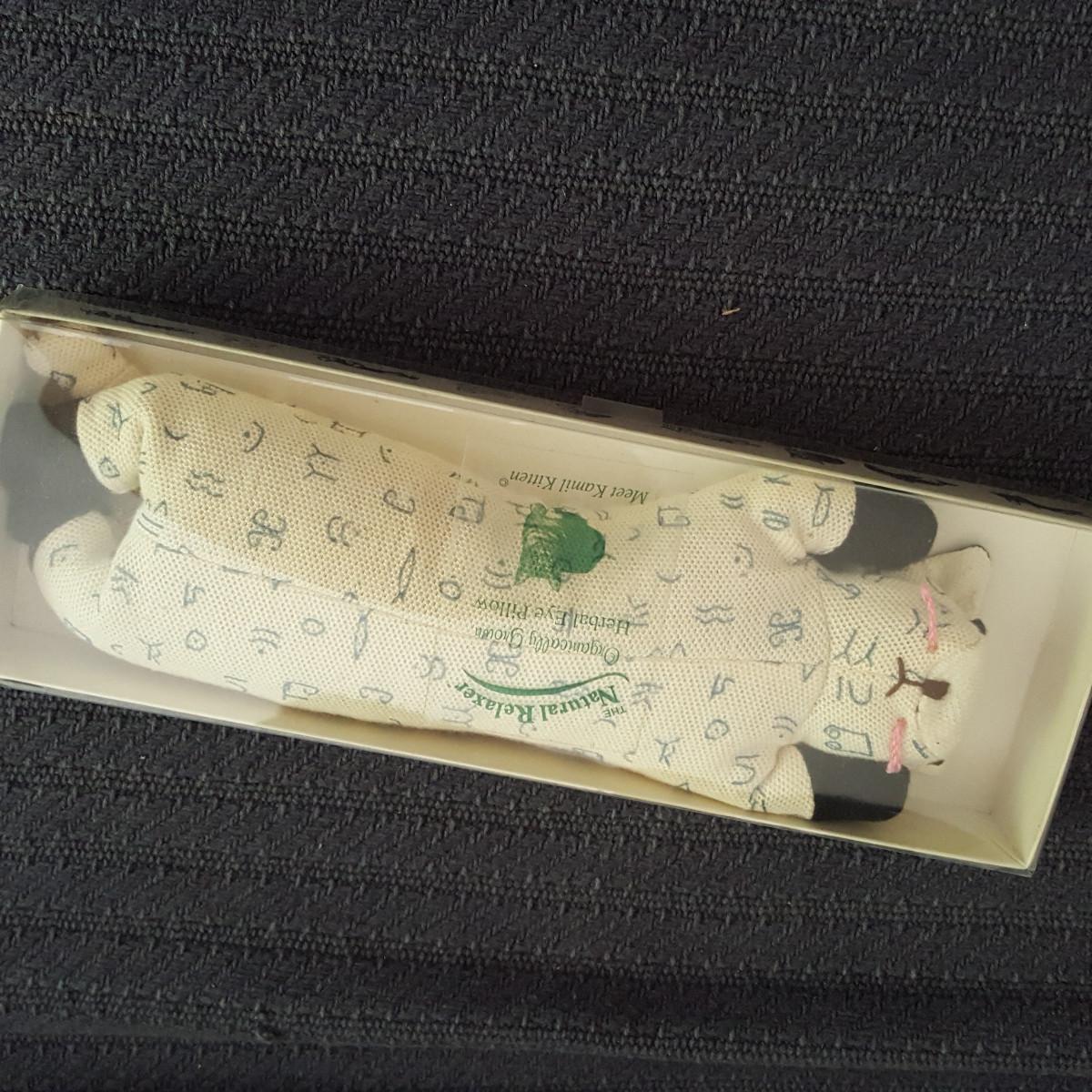 This auction lot is for an Herbal Eye Pillow The pillow is named Kamil Kitten and shaped as such. It measures about 9-inches long. it is filled with an organically produced filling. This item is new, old stock and is part of a liquidation we are doing for a lady who owned a large herb catalog business in the early 80s and these were part of her stock - which over time, as the catalog changed - got shoved to the back of her basement unsold.
