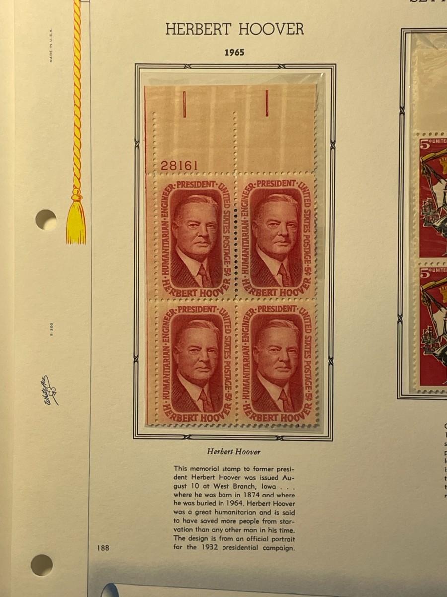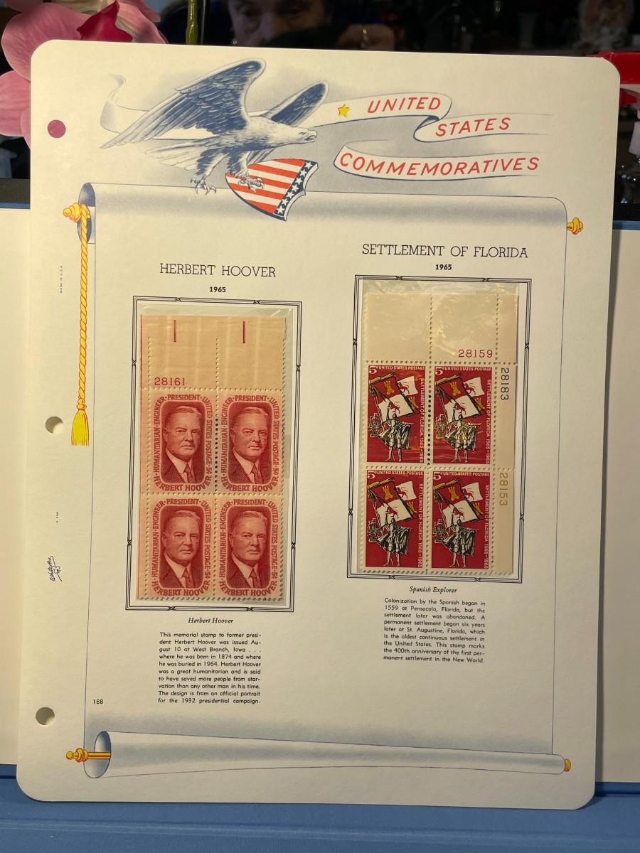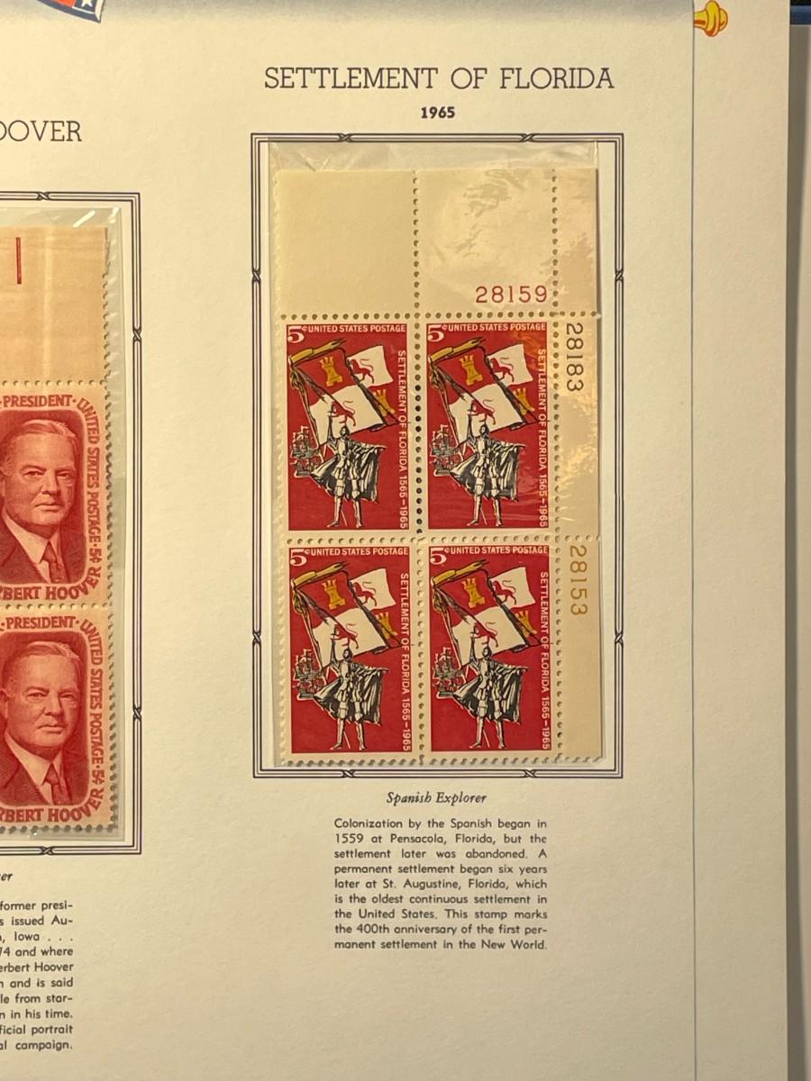 Herbert Hoover & Settlement of Florida 1965 Mint Condition US Stamp Plate Blocks Page as Pictured. Only One $5 Shipping Charge for 1 or 100 Pages Won.