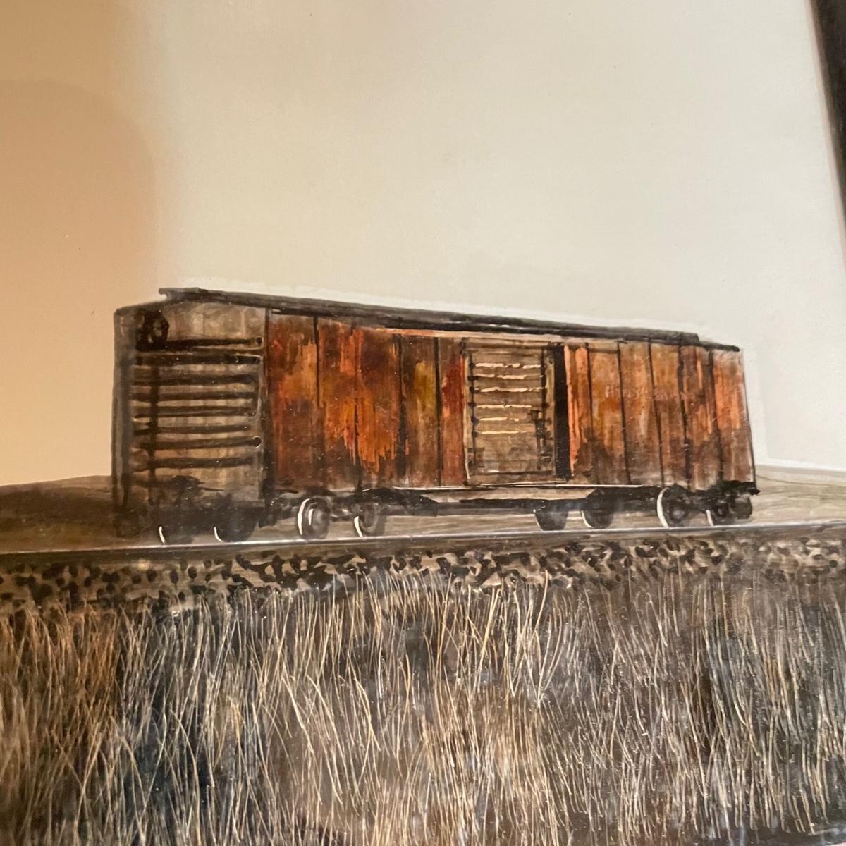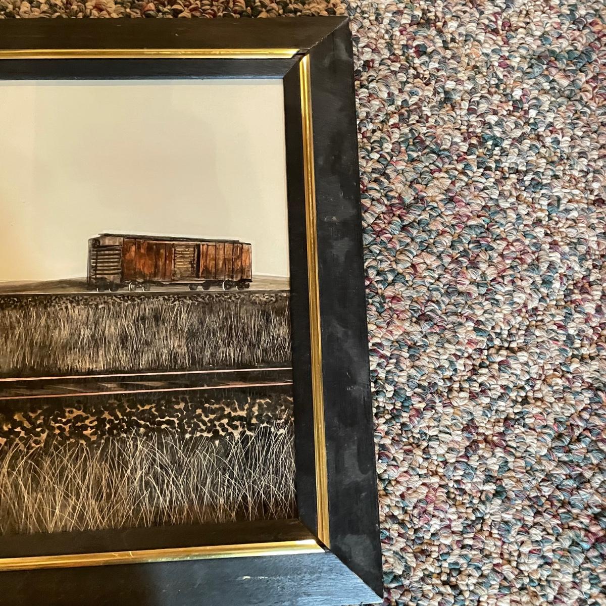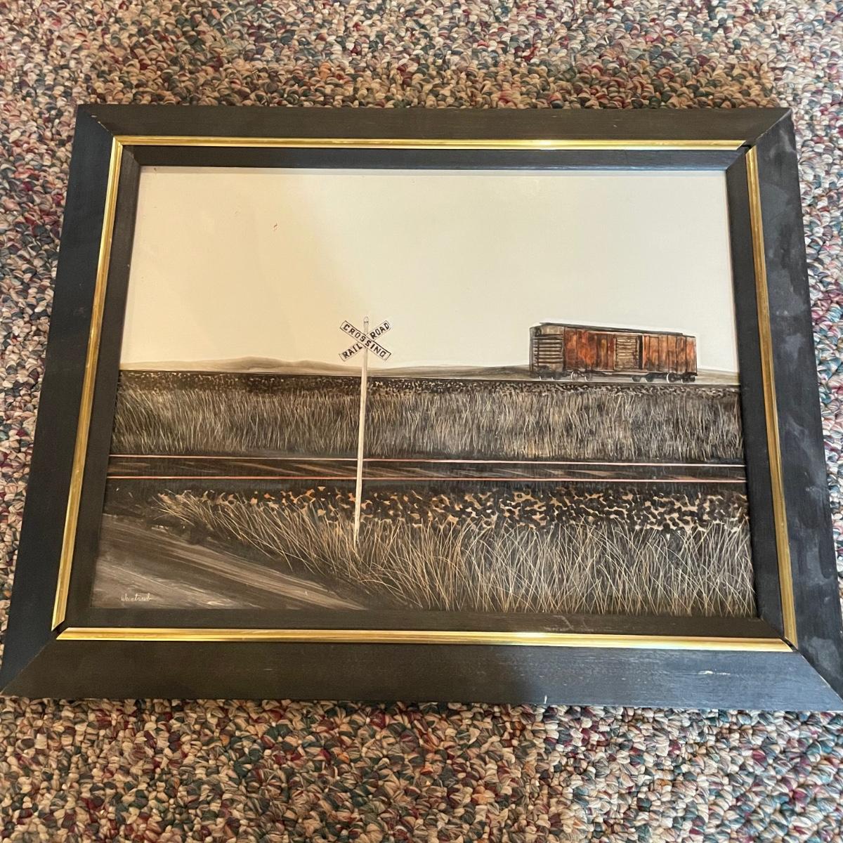 Signed and framed art by Herbert Weintraub, who is known for his acrylic paintings. Art has a unique sheen and delicate lines, making it appear to be a mix of mediums. Art sits behind glass in a black painted wooden frame measuring 19.5” x 15.5”. Some of the gold trim has separated. Shipping available. Please call UPS with dimensions at 828-252-6930 for a shipping quote prior to bidding.