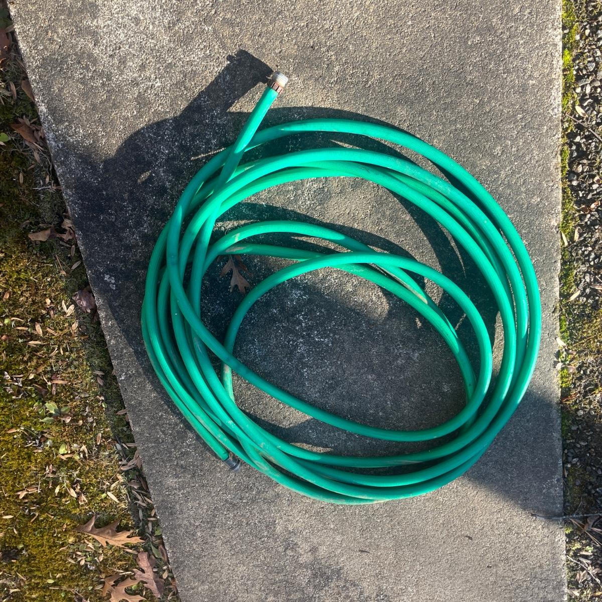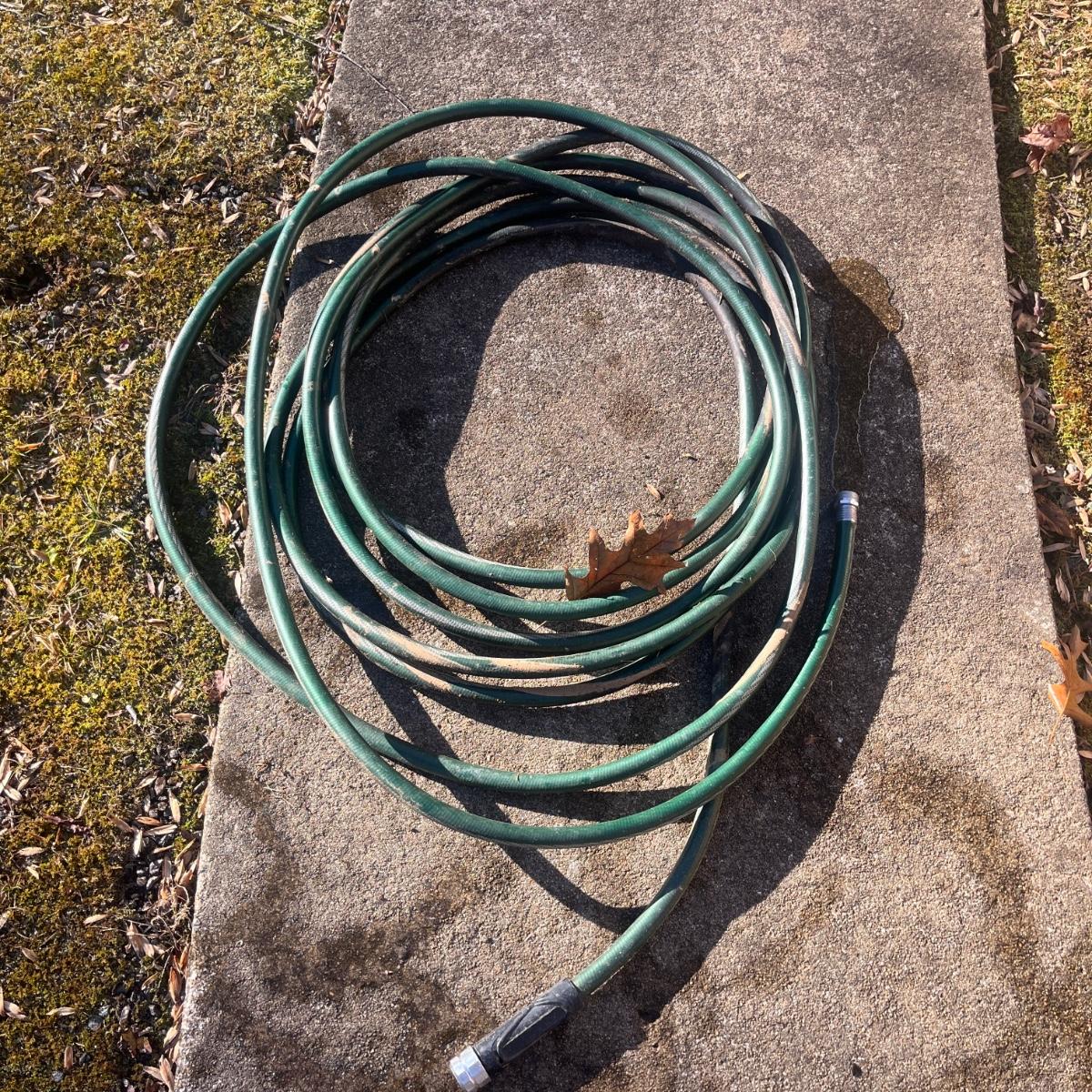 Lot includes a Hercules stainless steel hose, two garden hoses and two plastic spray nozzles.