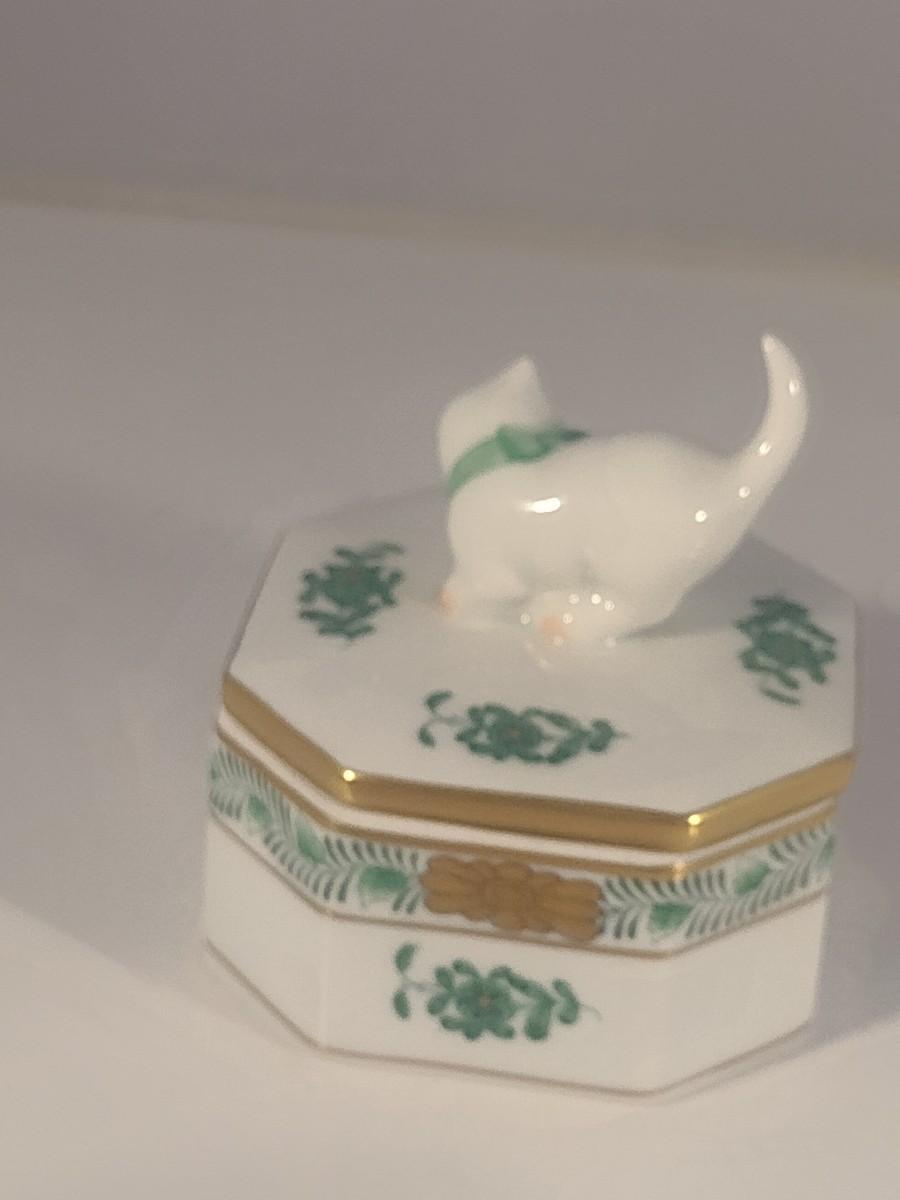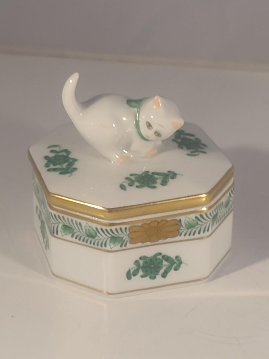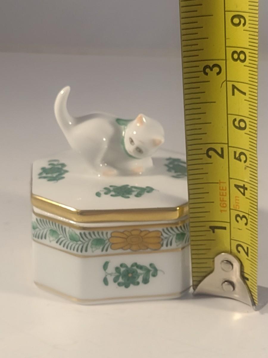 Herend Ceramic Lidded Hexagonal Trinket Box with Kitten Finial