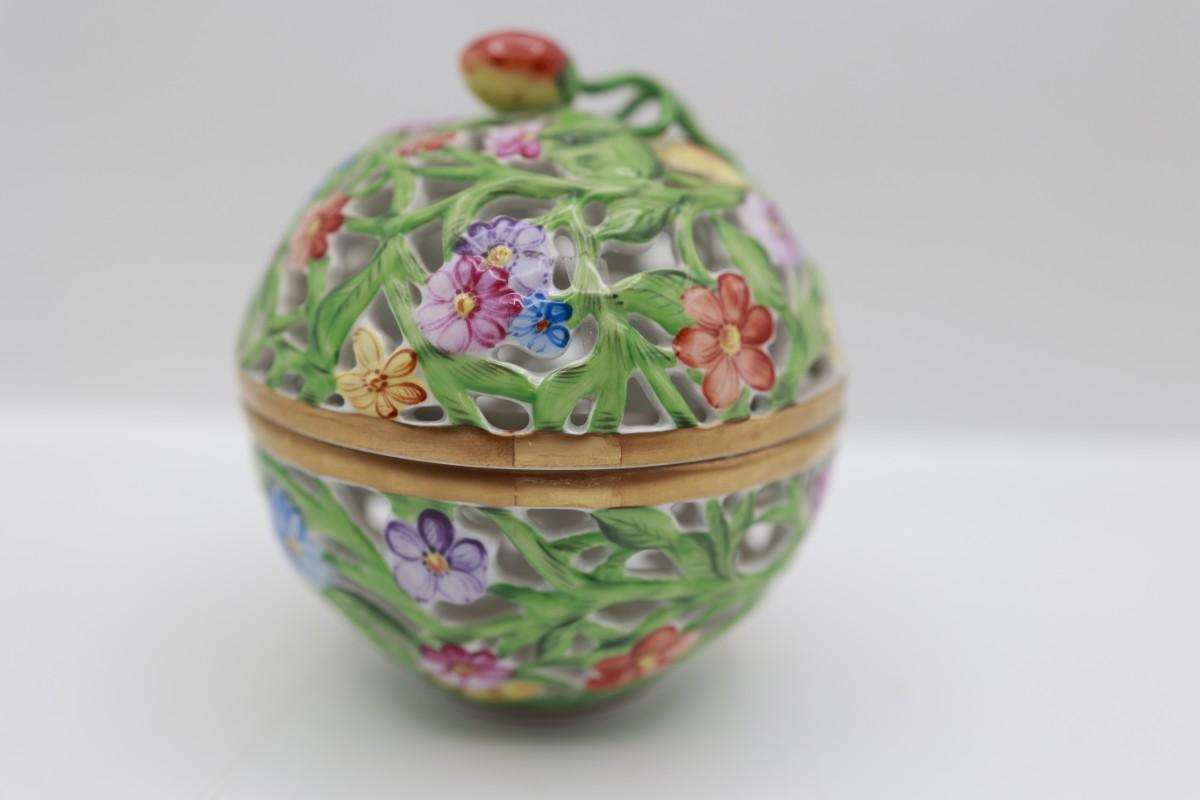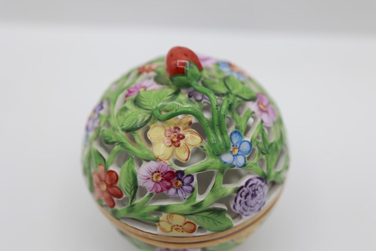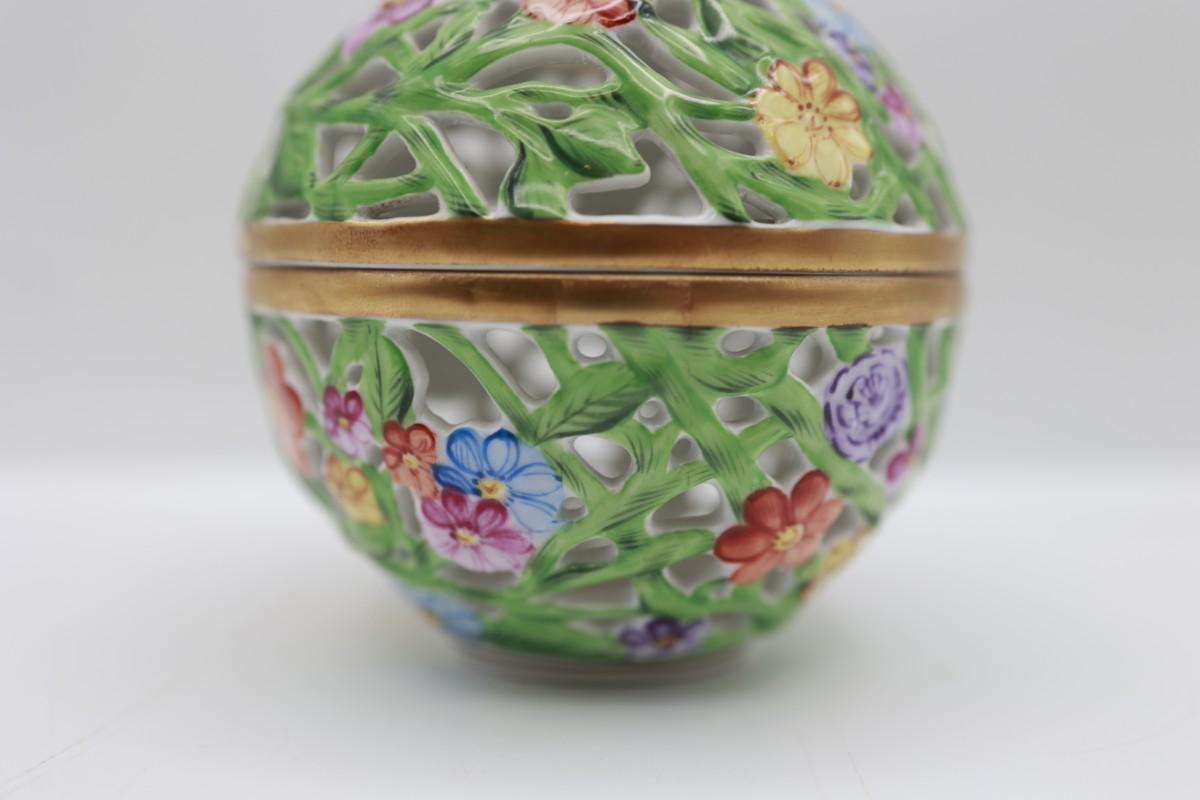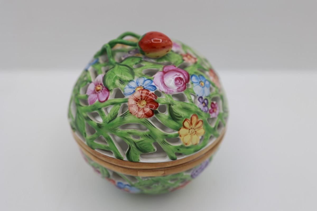 Herend Porcelain Bonbonnière, specifically a round, openwork or reticulated box with a lid, featuring colorful hand-painted. Bonbonnières are small porcelain boxes used for storing candies, jewelry, or other personal items.