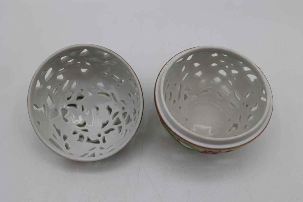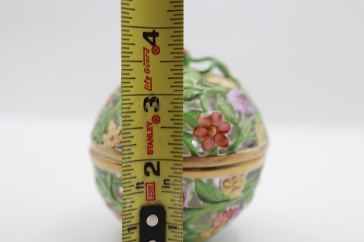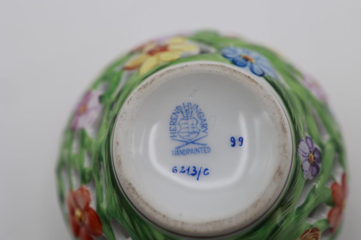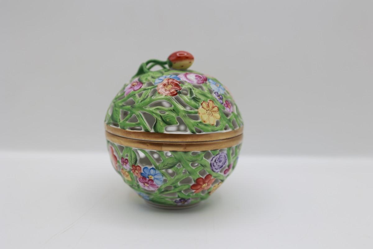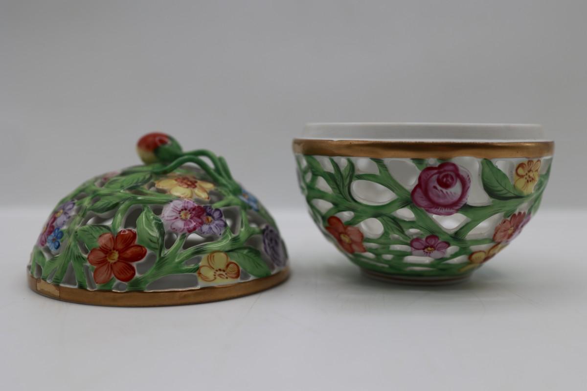 Herend Porcelain Bonbonnière, specifically a round, openwork or reticulated box with a lid, featuring colorful hand-painted. Bonbonnières are small porcelain boxes used for storing candies, jewelry, or other personal items.