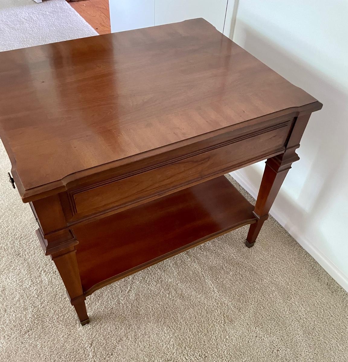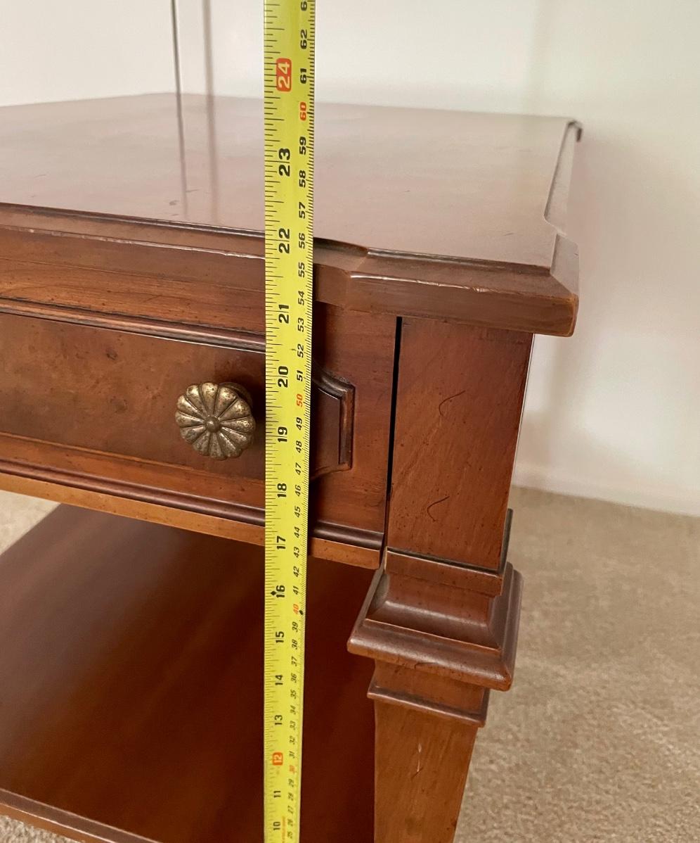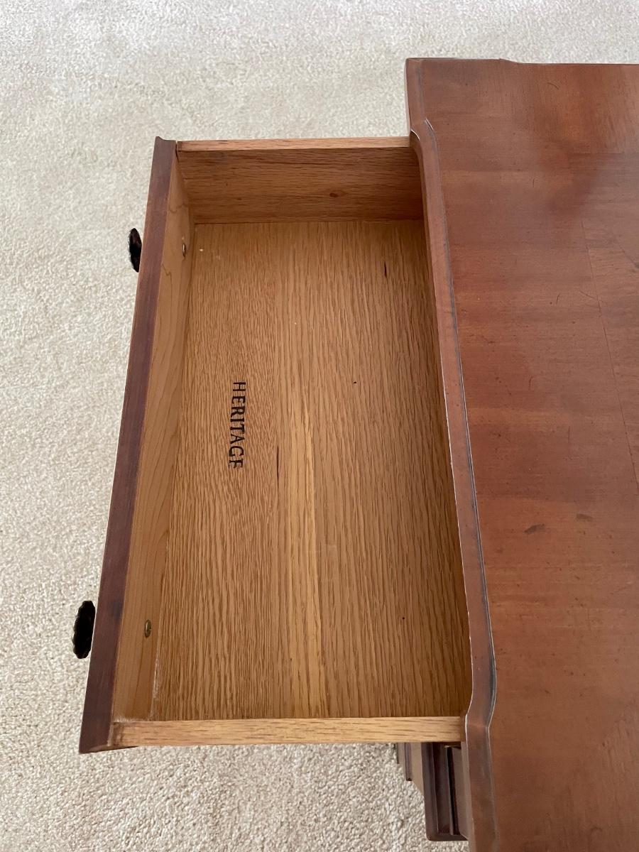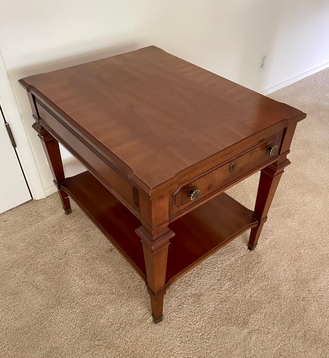 End table by Heritage, has on full-length drawer and a shelf at the bottom. Dimensions as noted in photos. *PICK UP IN ARCADIA SATURDAY MARCH 25TH BETWEEN 9am & 11am*
