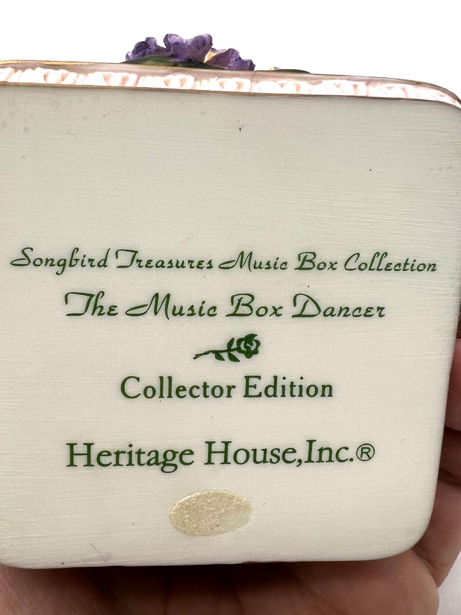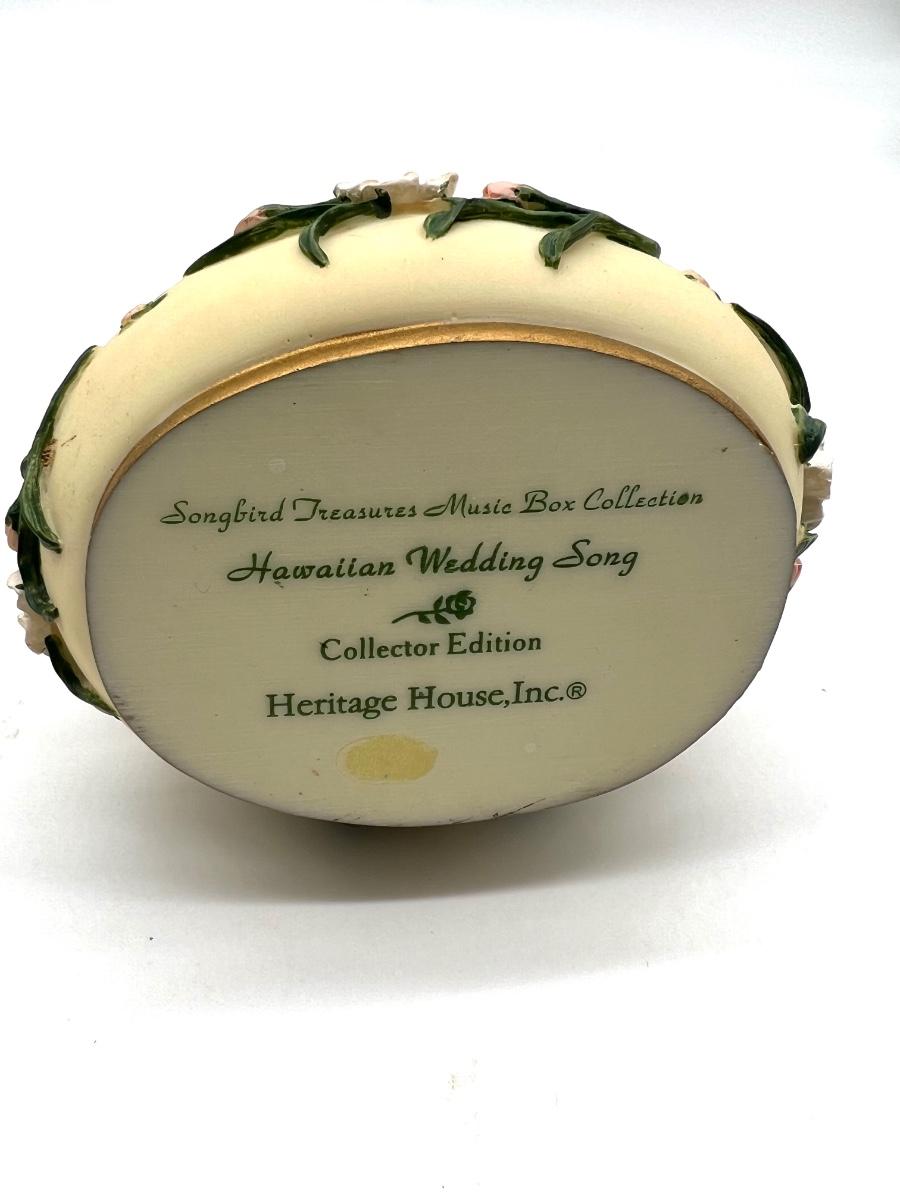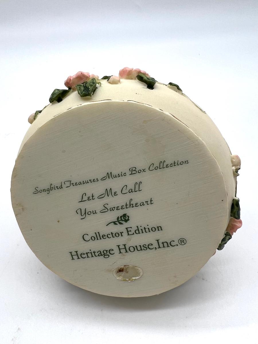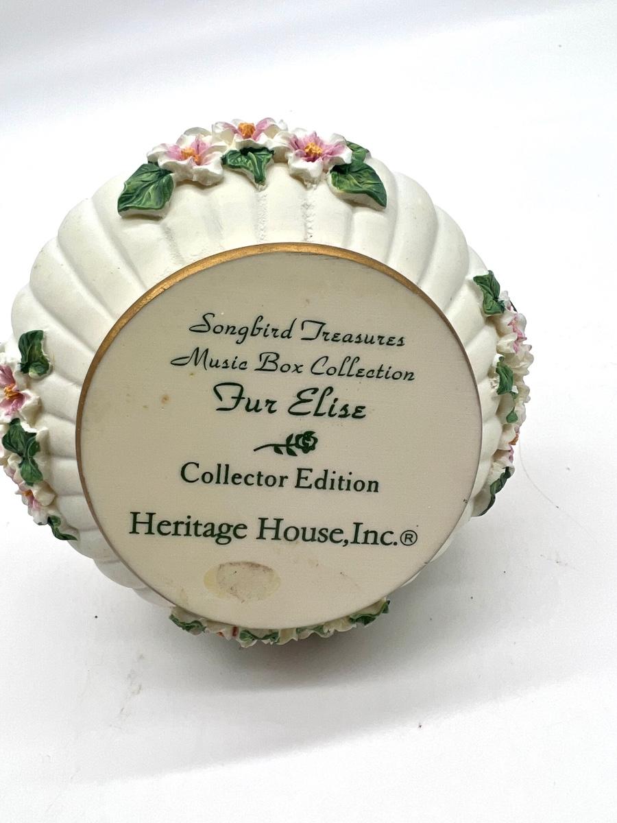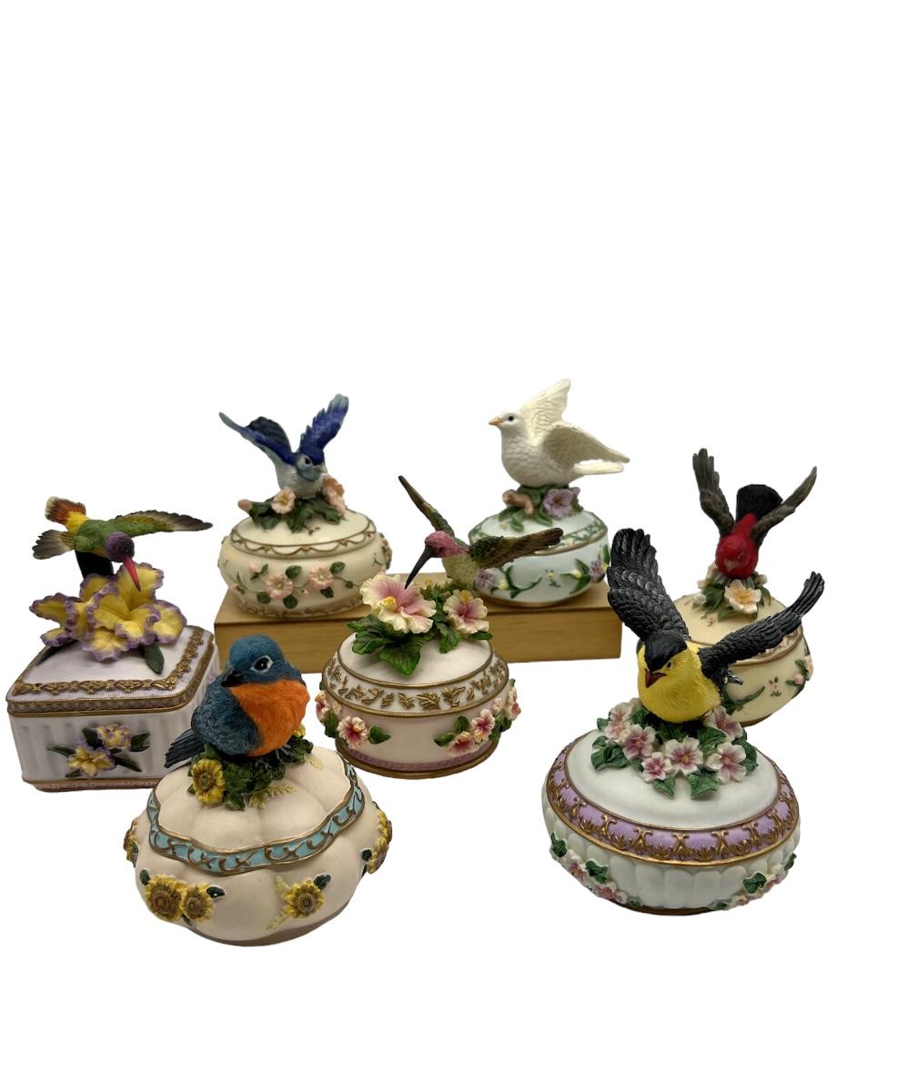 7 HERITAGE HOUSE musical boxes that open for those special trinkets. All music boxes work. Each measures approximately 5 inches tall.