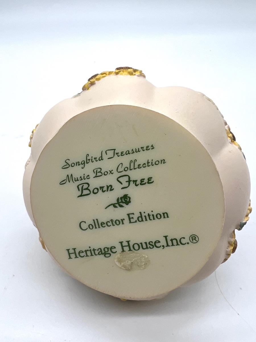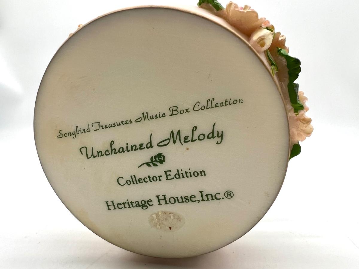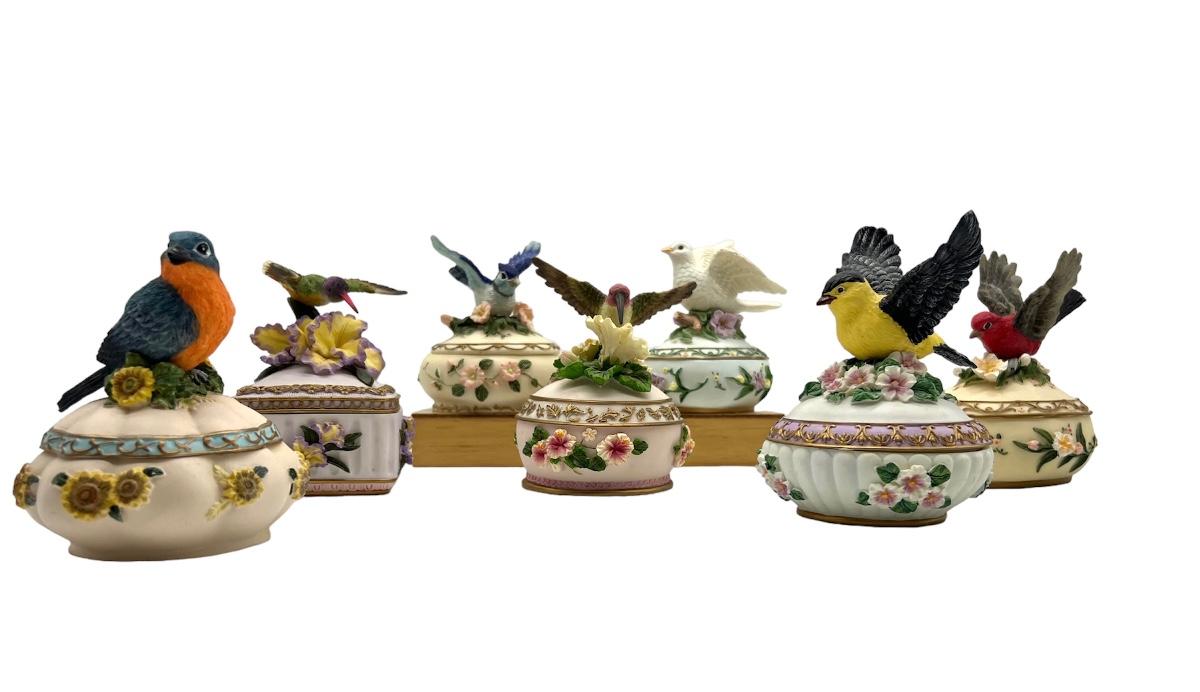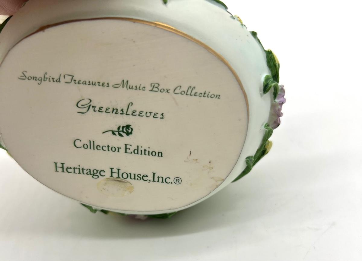 7 HERITAGE HOUSE musical boxes that open for those special trinkets. All music boxes work. Each measures approximately 5 inches tall.