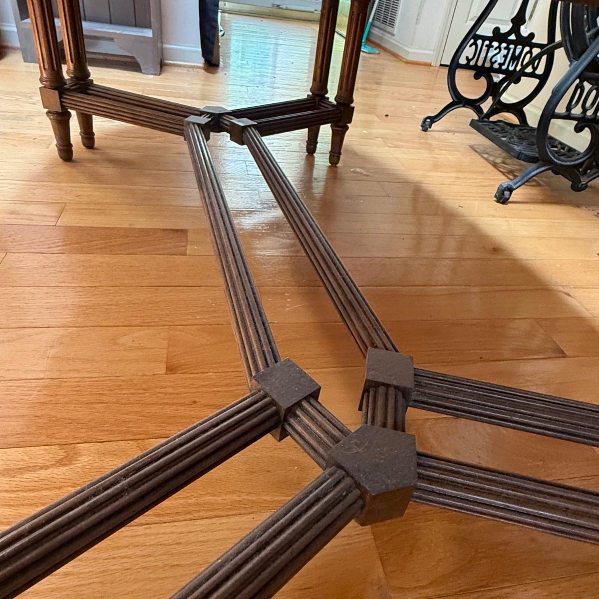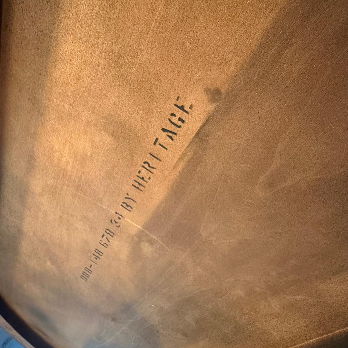 Scalloped oval wooden coffee table with inlaid design top surface. Appears to be solid wood. Table is labeled ‘Heritage’, likely indicating Drexel Heritage. Table measures 56” x 32” x 17.25”H. Some areas of wear are seen on the surface.