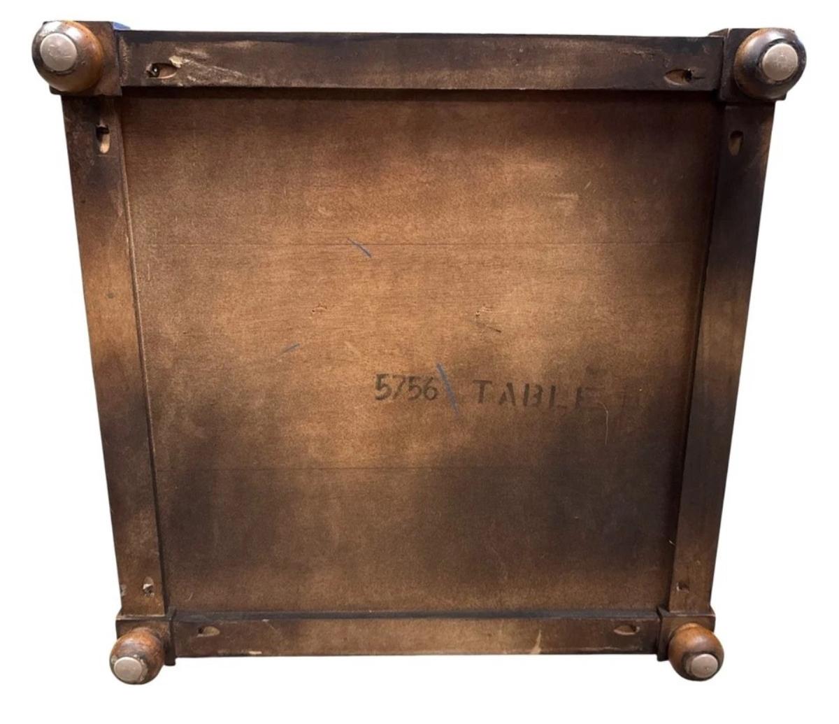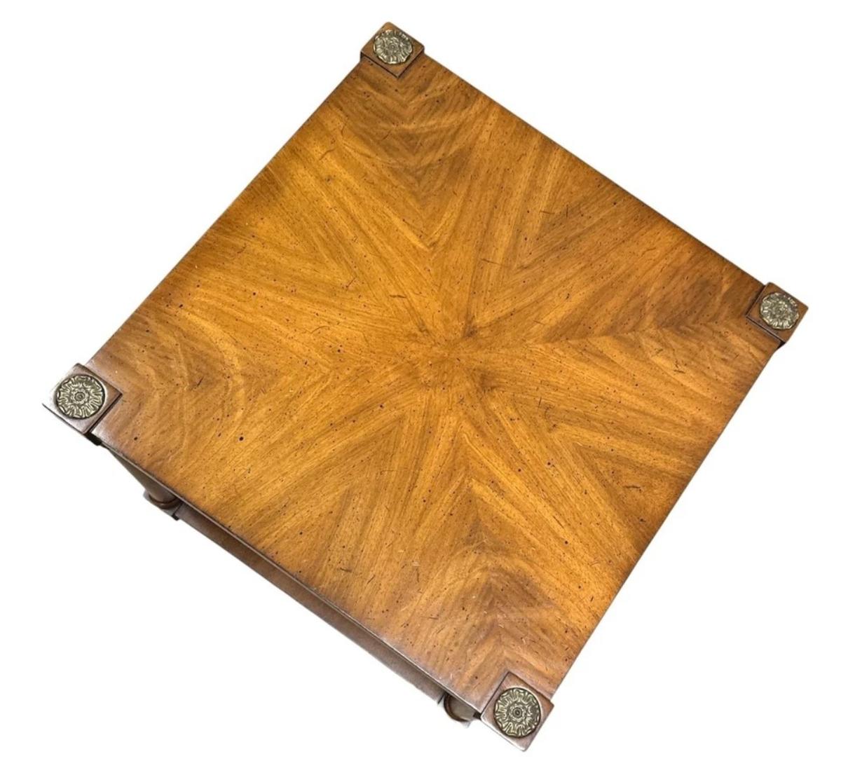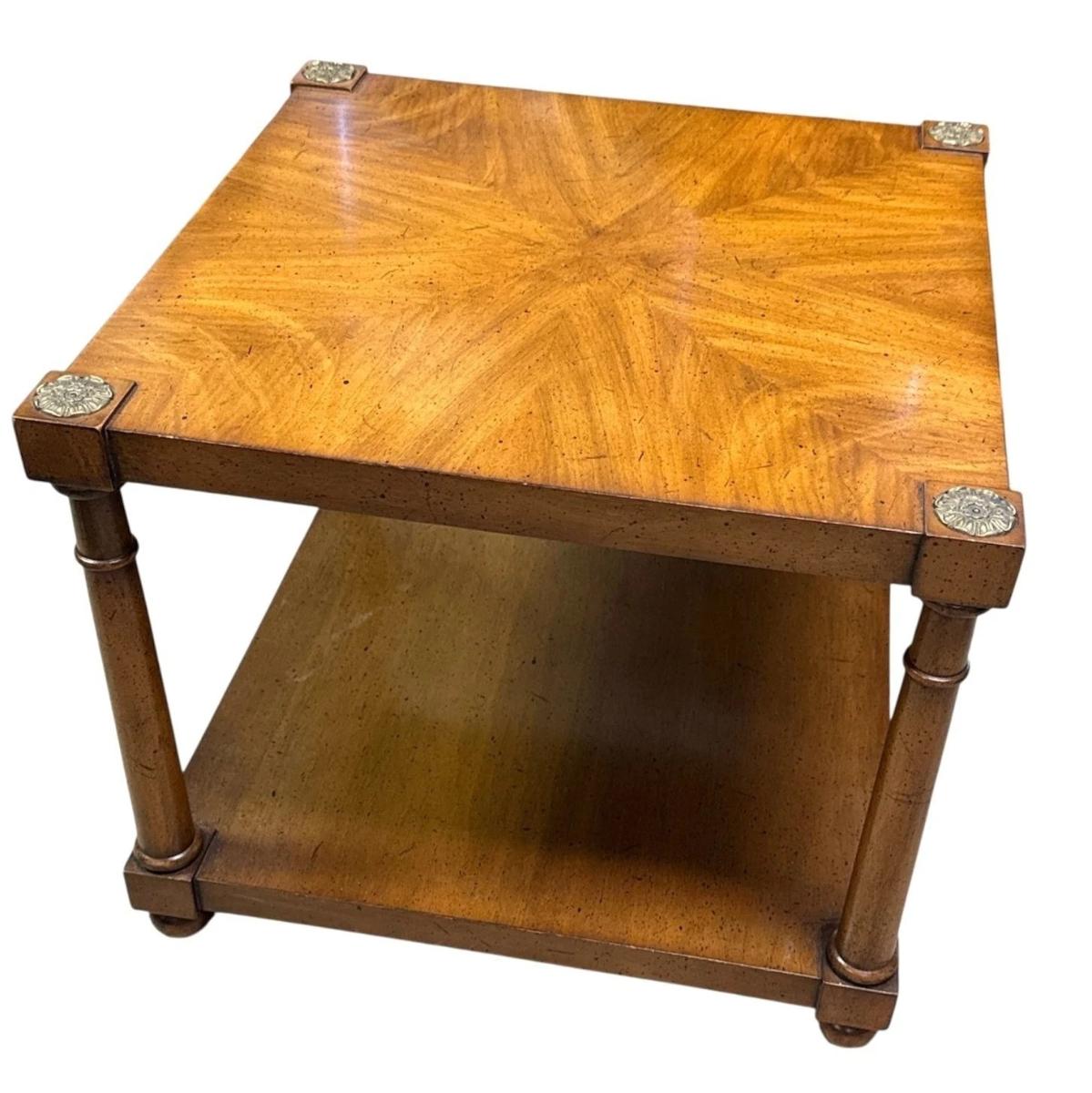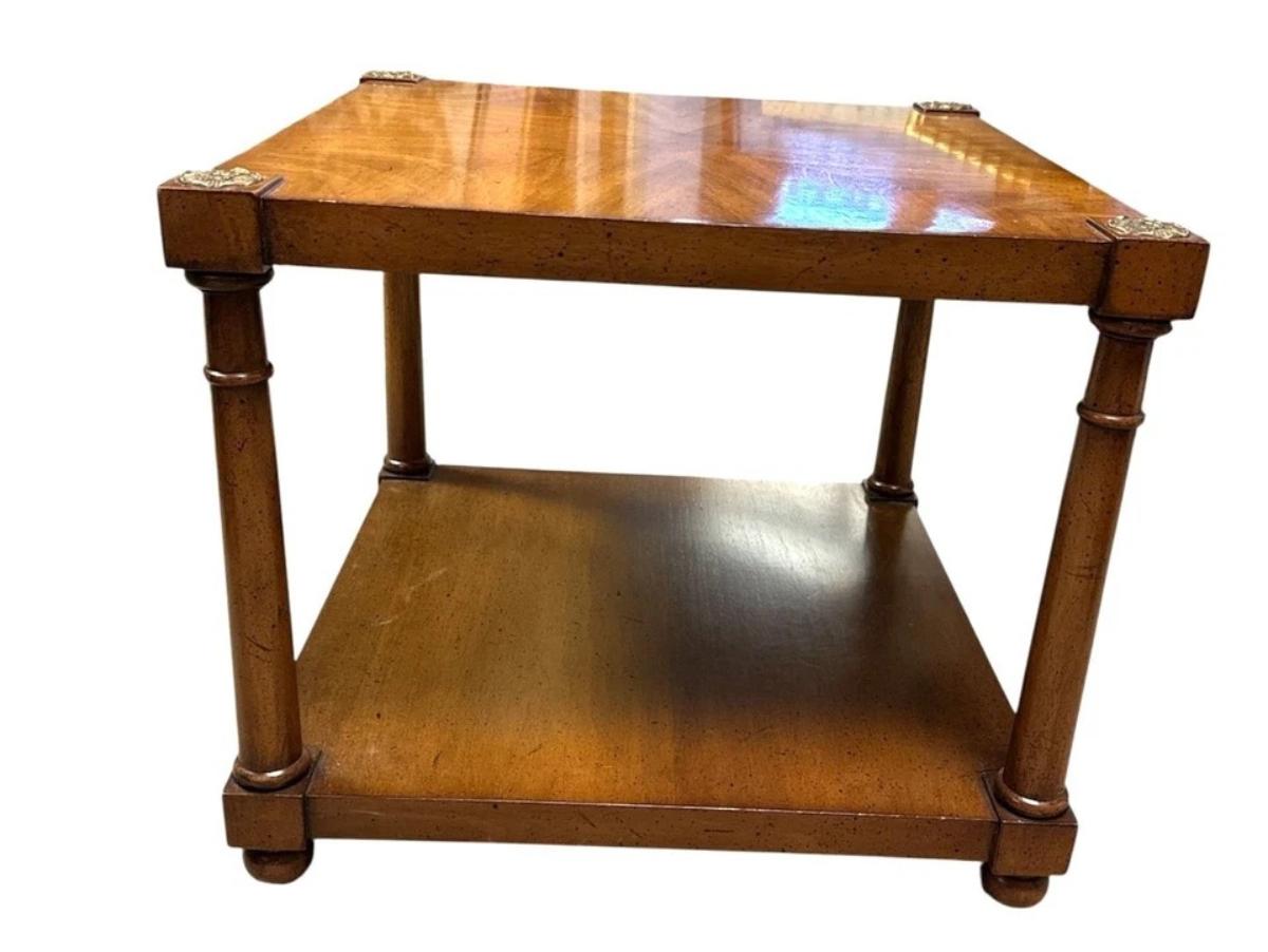 Vintage Heritage Henredon Unsigned Square 2-Tier Traditional Style Lacquered Walnut Wood Square End/Side Table #5756 20th Century with Decorative Brass Capped Medallions