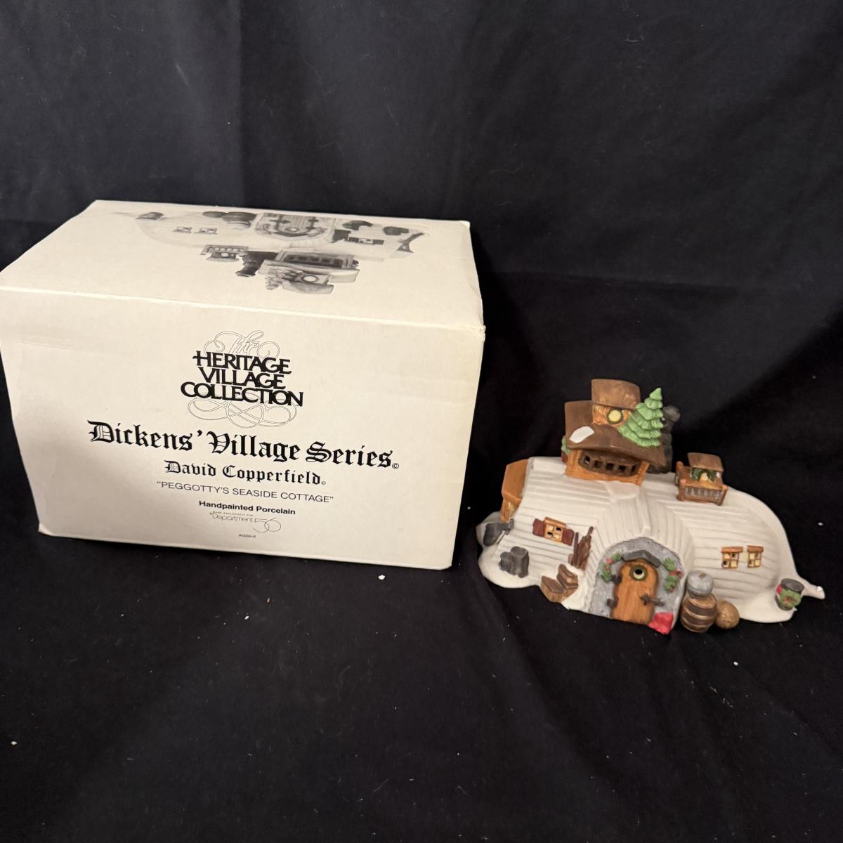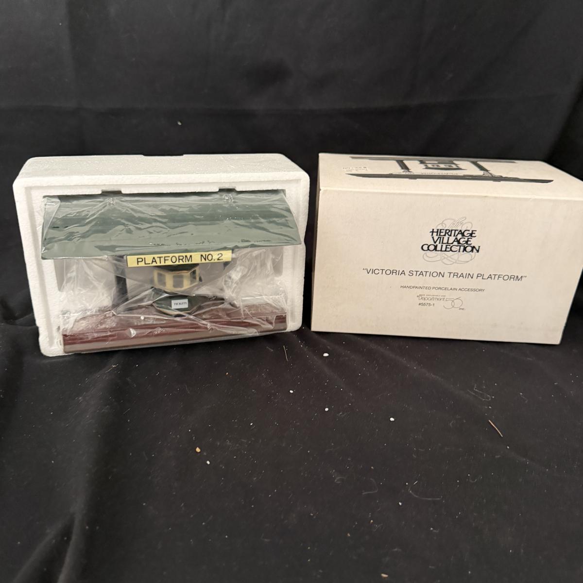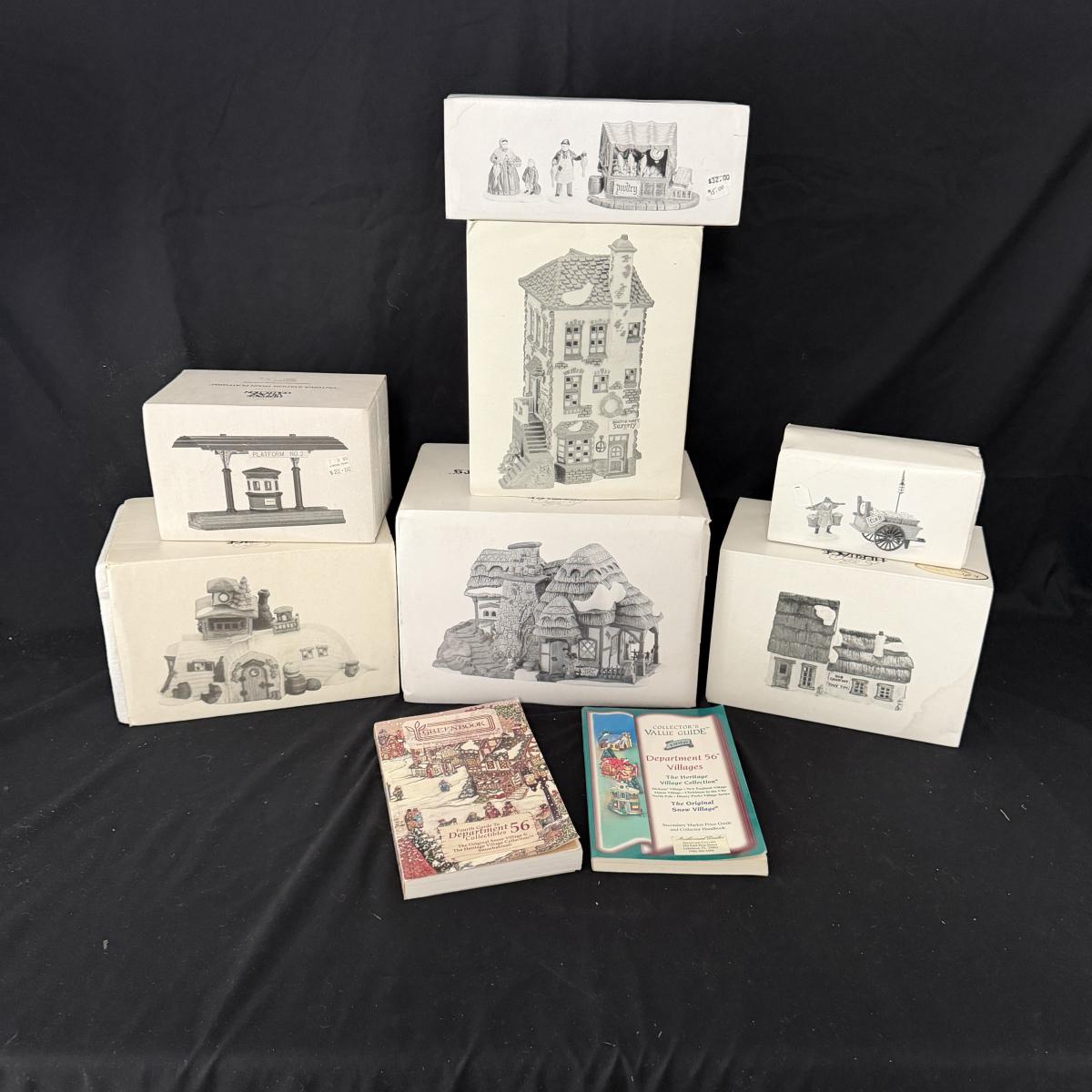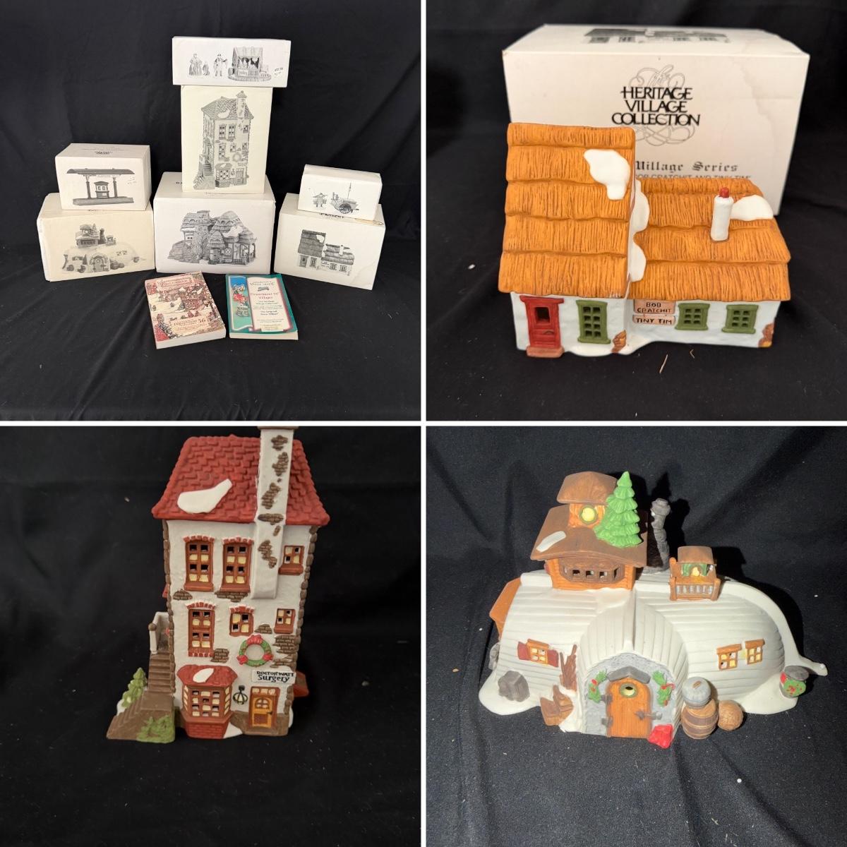Lot contains seven boxes of Heritage Village collection. Includes four from the Dickens Village series and three boxes with accessories. Largest piece measures 10” x 6@ x 6”H. None of the lights powered on when plugged and appear to need new bulbs.
