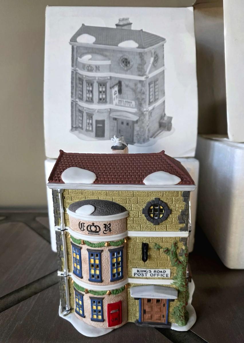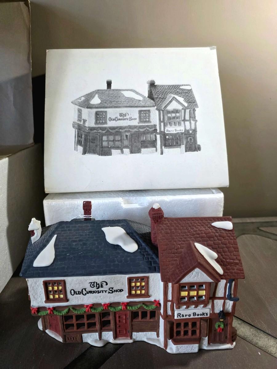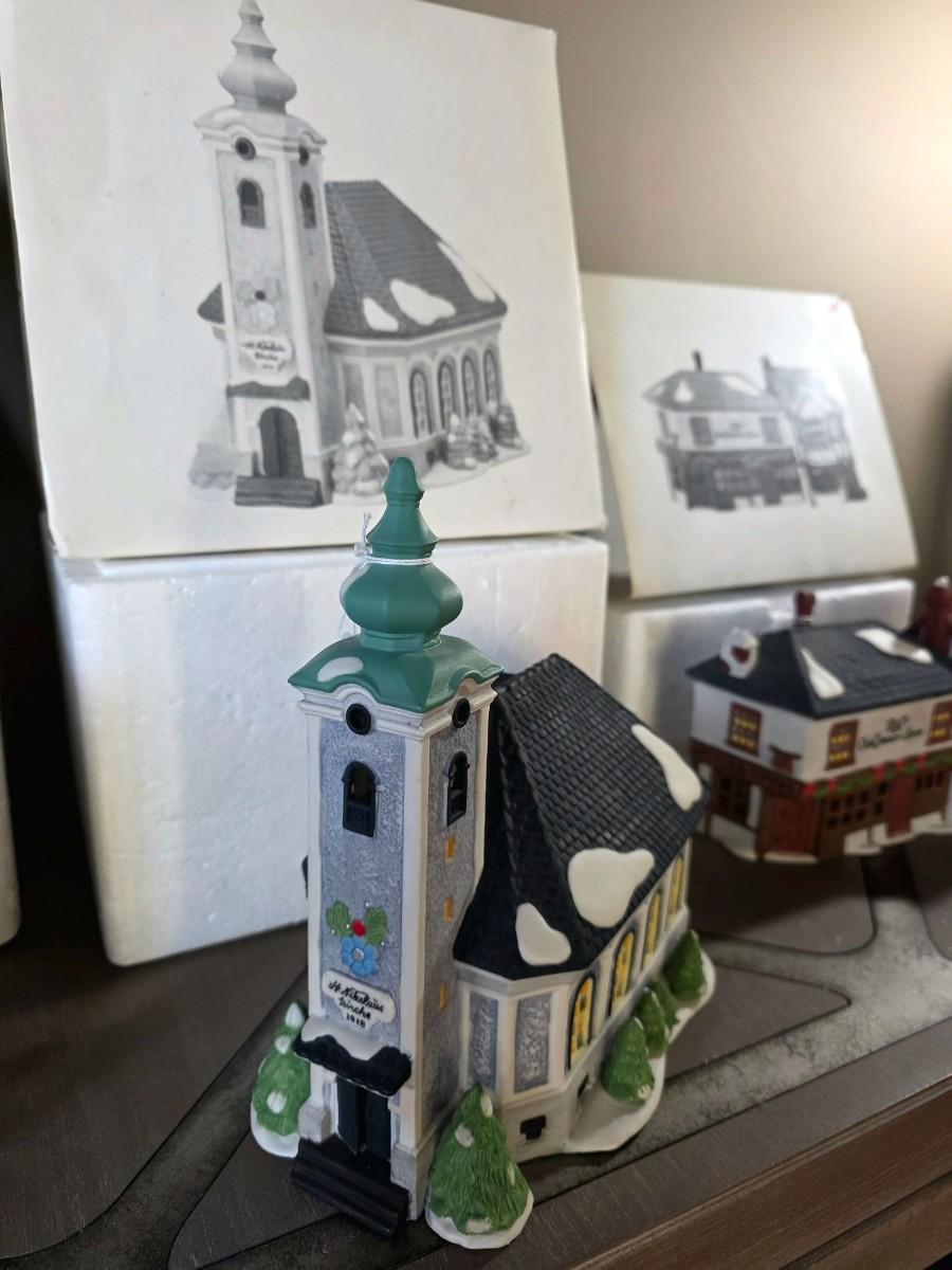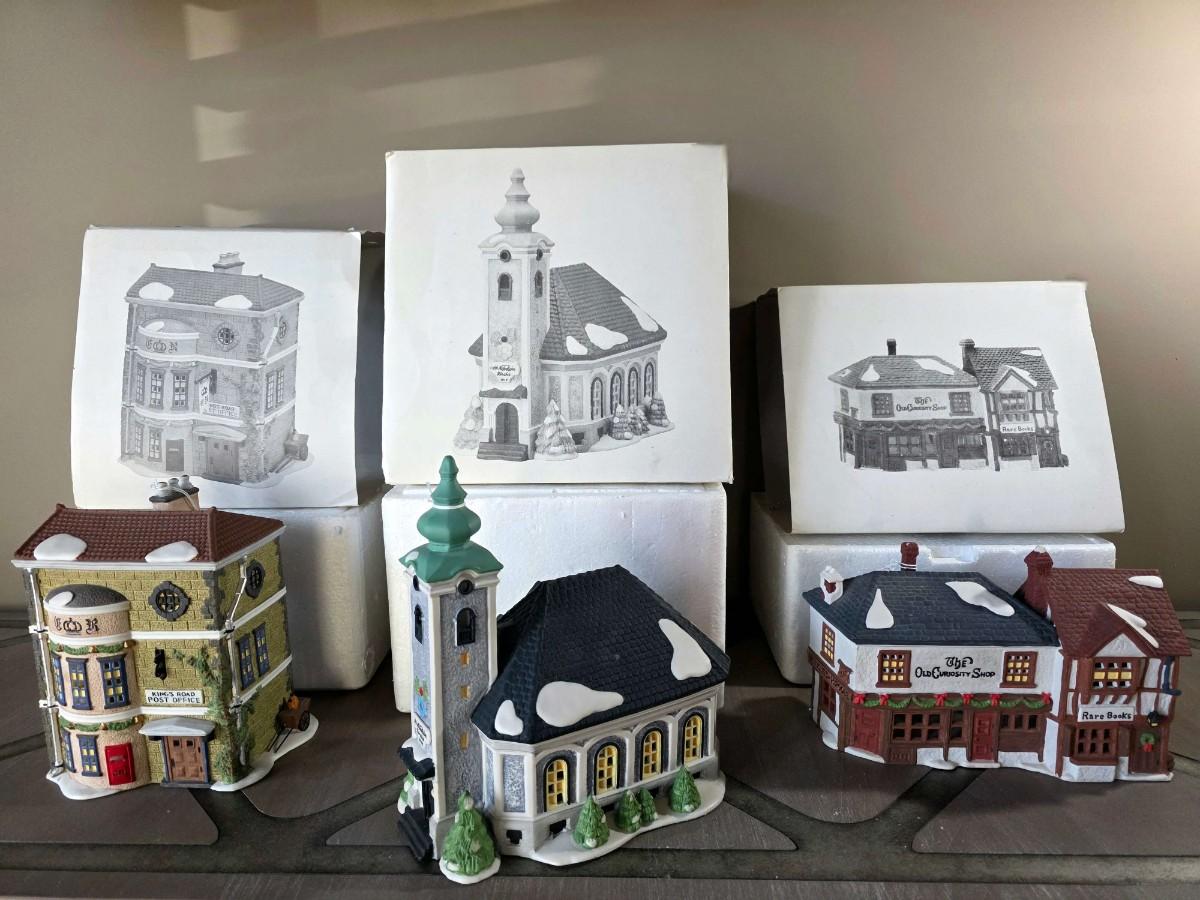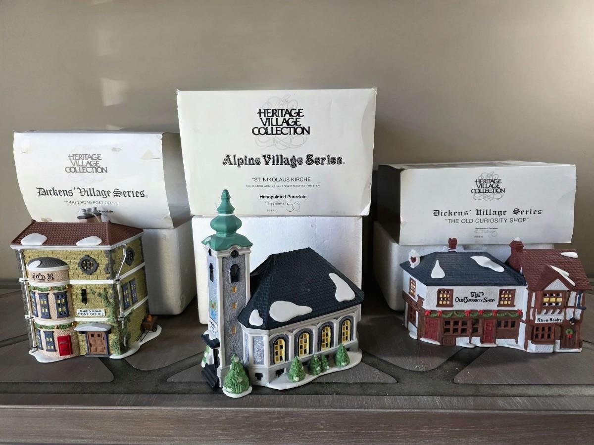 Dept. 56 Heritage Village Collection includes "King's Road Post Office," "St. Nikolaus Kirche," and "The Old Curiosity Shop" in their original boxes.