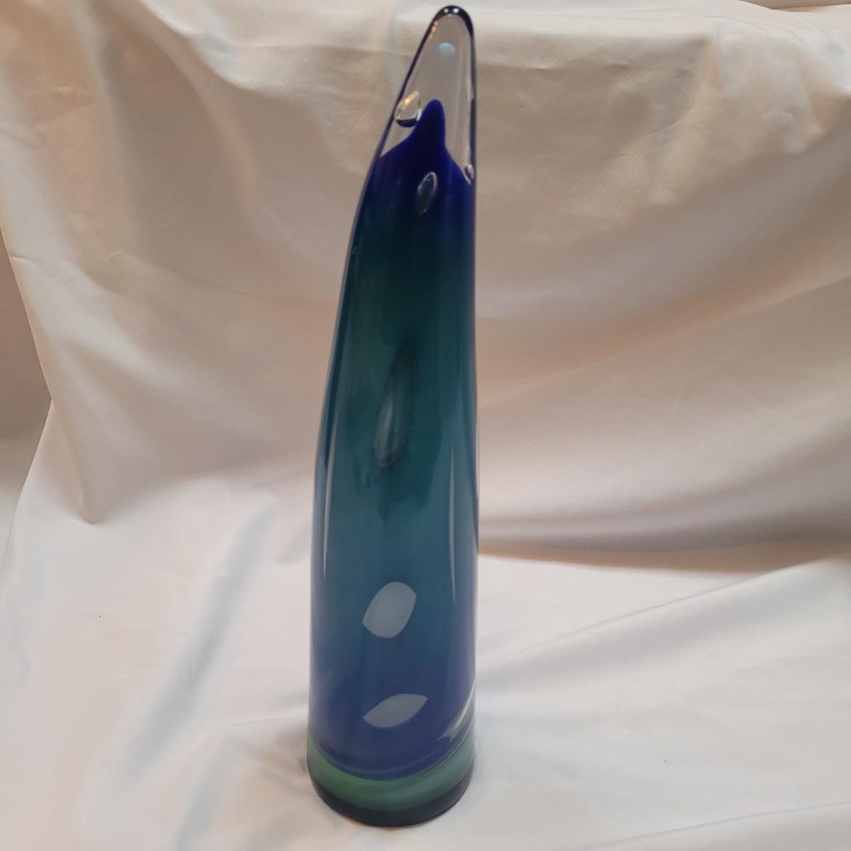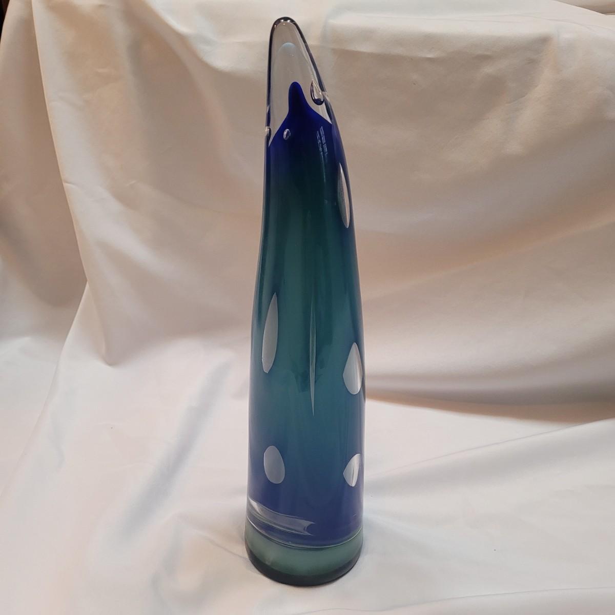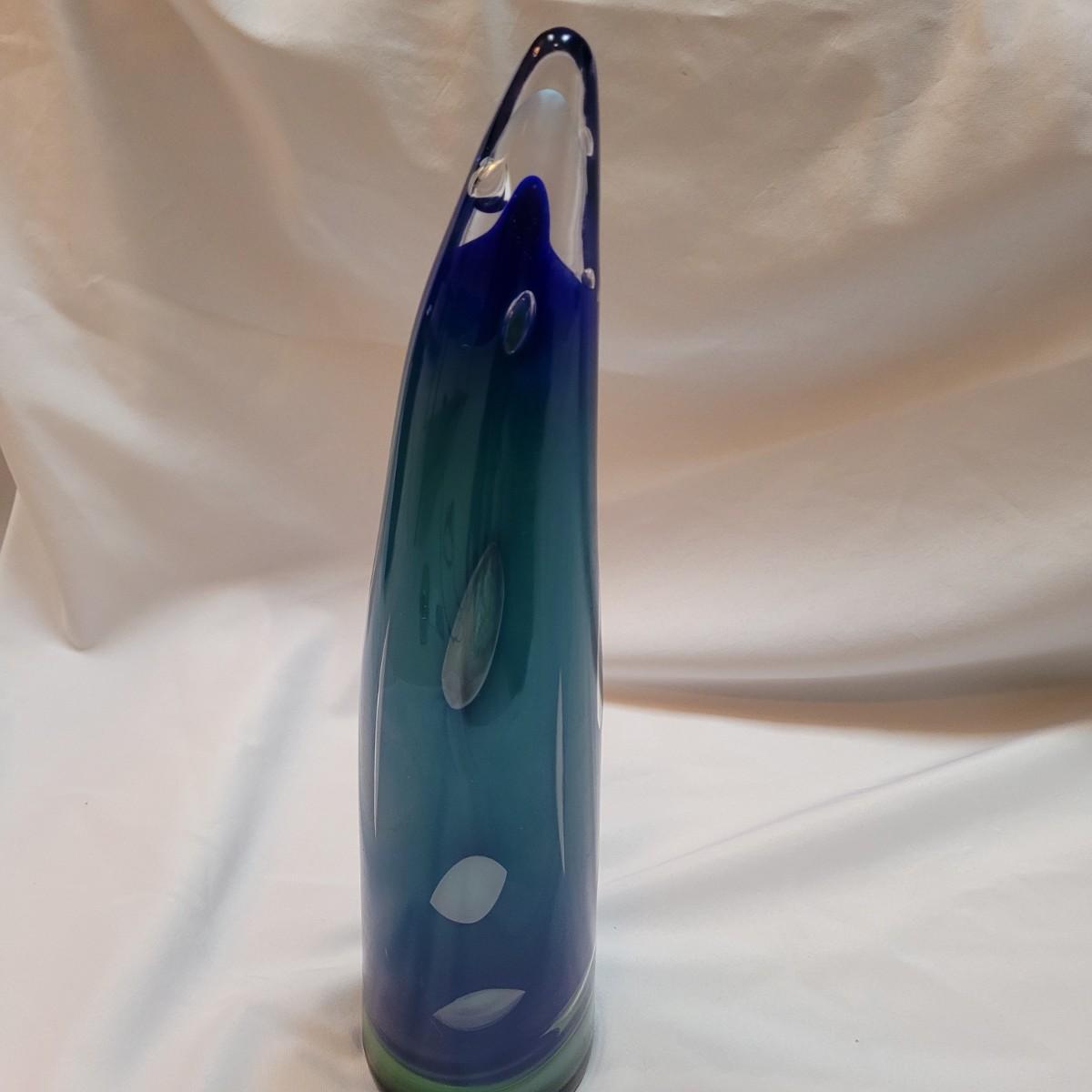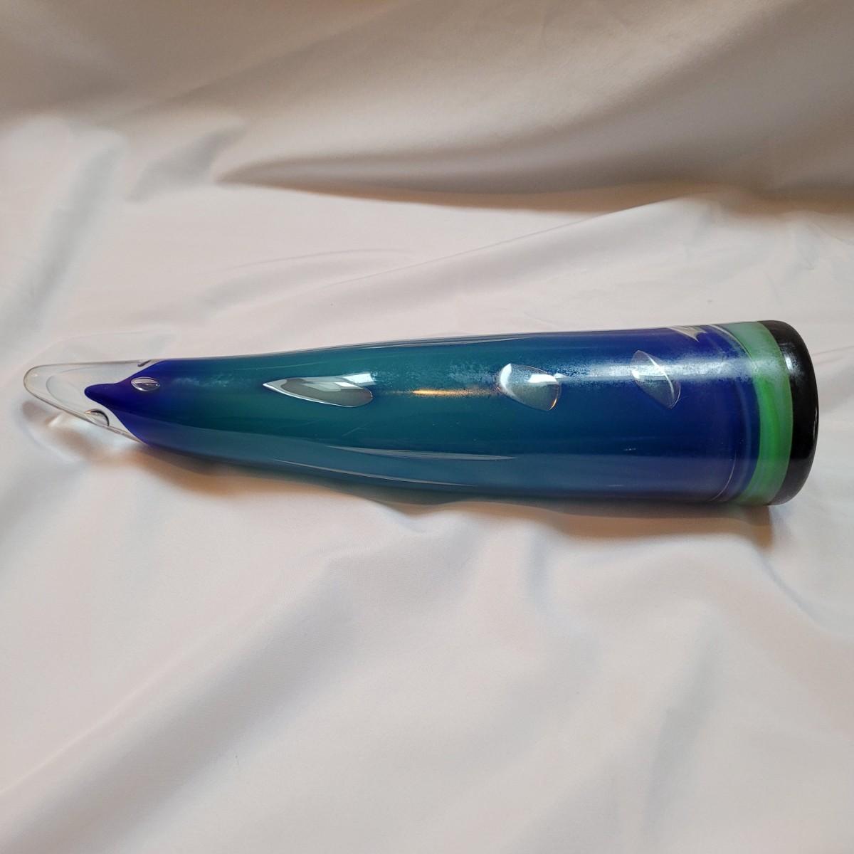 Herman Gatterer original glass sculpture that is signed on the bottom. This piece is a tall cone shape featuring beautiful blue and green ocean like colors. Also, features purposeful bubbles that add depth. This piece is hollow, but thick and sturdy. Item measures 3"D x 19"H.