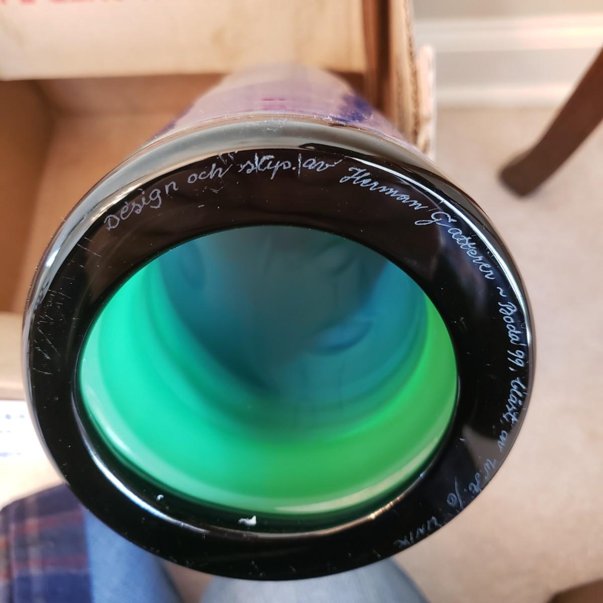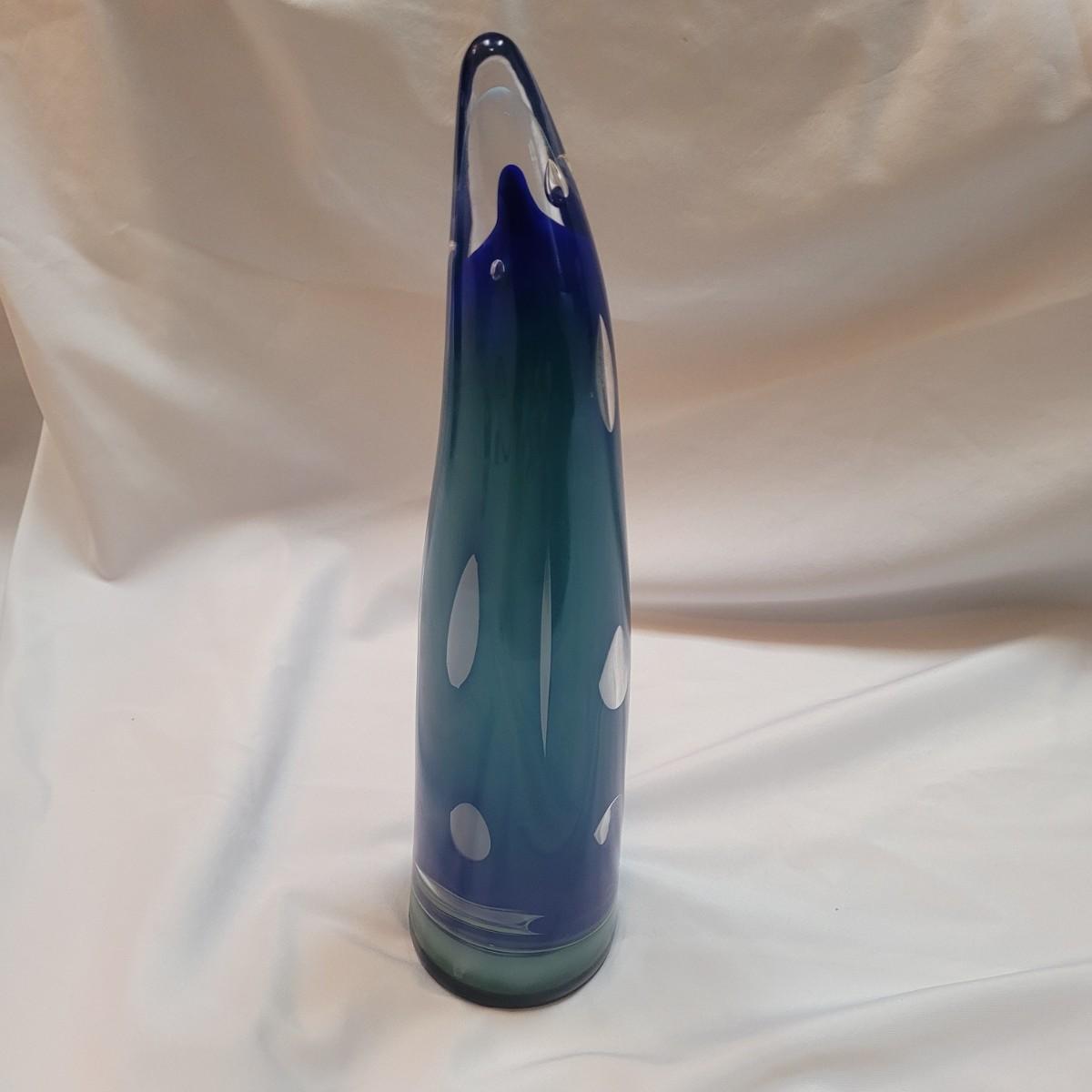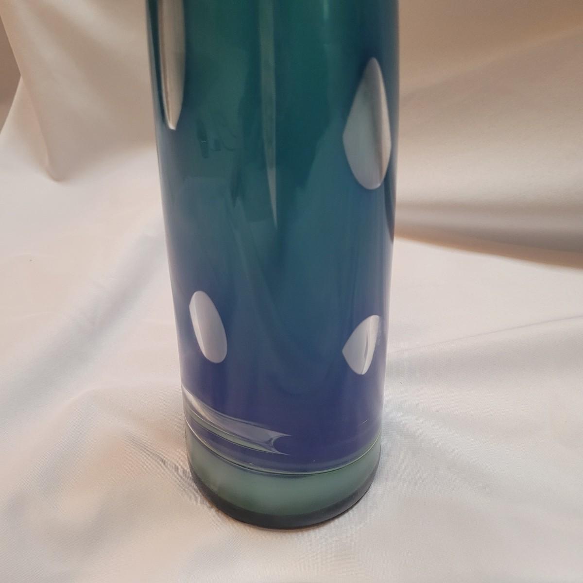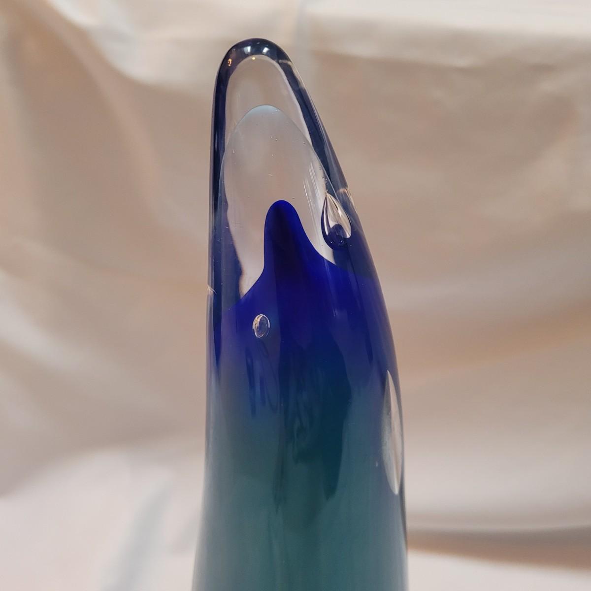 Herman Gatterer original glass sculpture that is signed on the bottom. This piece is a tall cone shape featuring beautiful blue and green ocean like colors. Also, features purposeful bubbles that add depth. This piece is hollow, but thick and sturdy. Item measures 3"D x 19"H.
