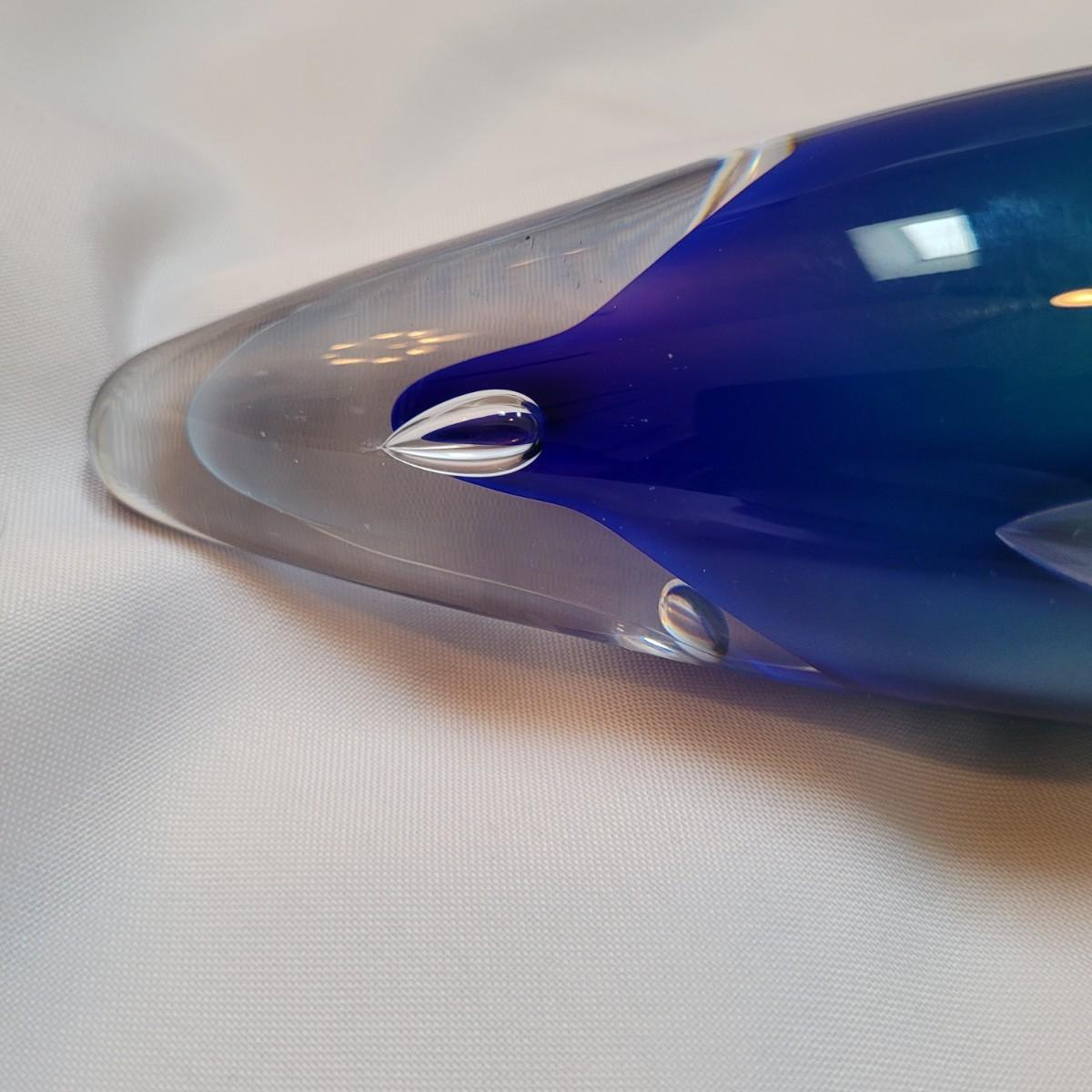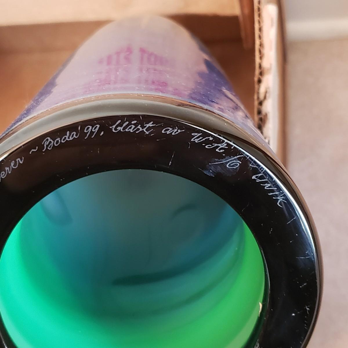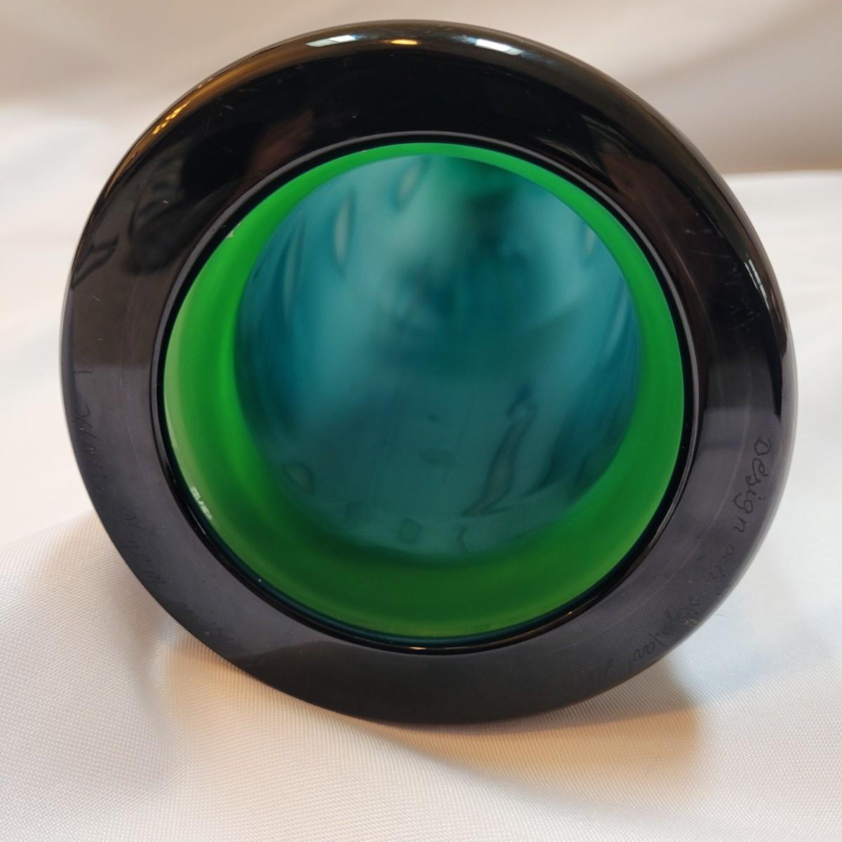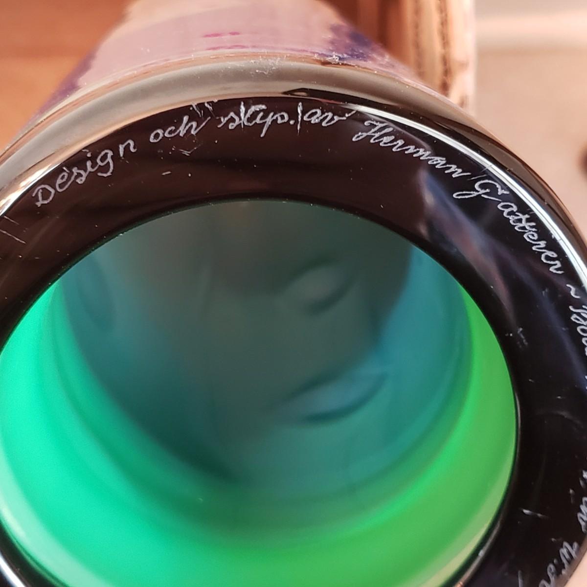 Herman Gatterer original glass sculpture that is signed on the bottom. This piece is a tall cone shape featuring beautiful blue and green ocean like colors. Also, features purposeful bubbles that add depth. This piece is hollow, but thick and sturdy. Item measures 3"D x 19"H.