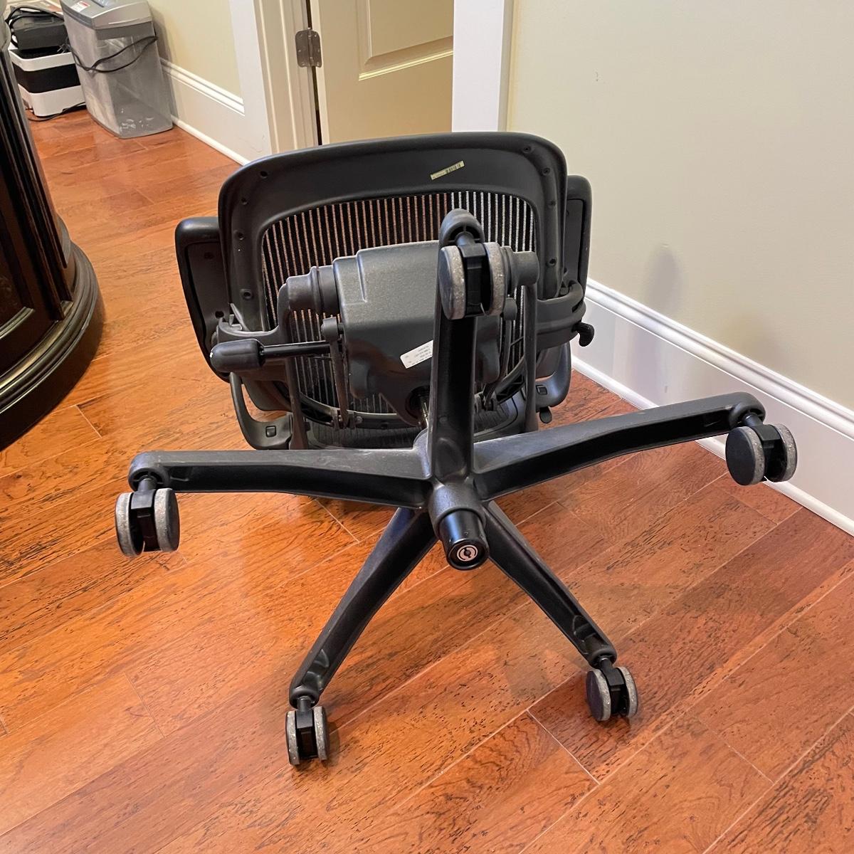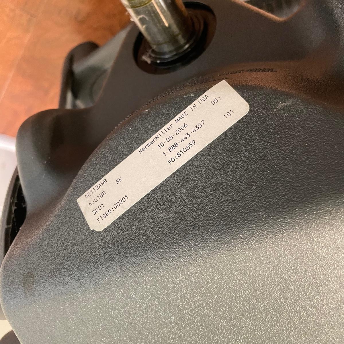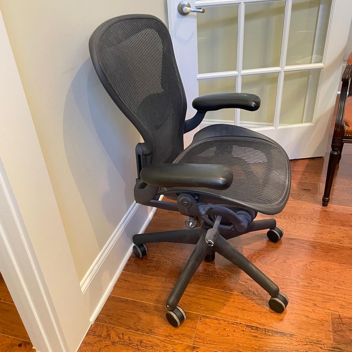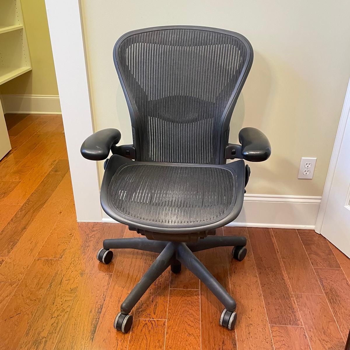 Nice charcoal and black Herman Miller office chair. Wheels roll smoothly and chair is adjustable. As pictured, chair measures 25” x 25” x 39” with a seat height at 21”. This has the original label under the seat that says it was manufactured in 2006. Has the two bumps on back indicating a size “B”. Local pick up only