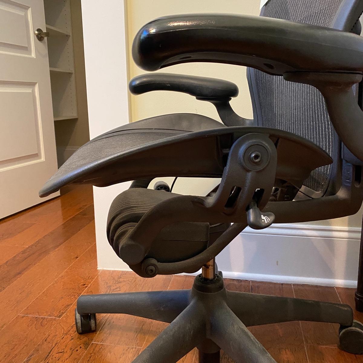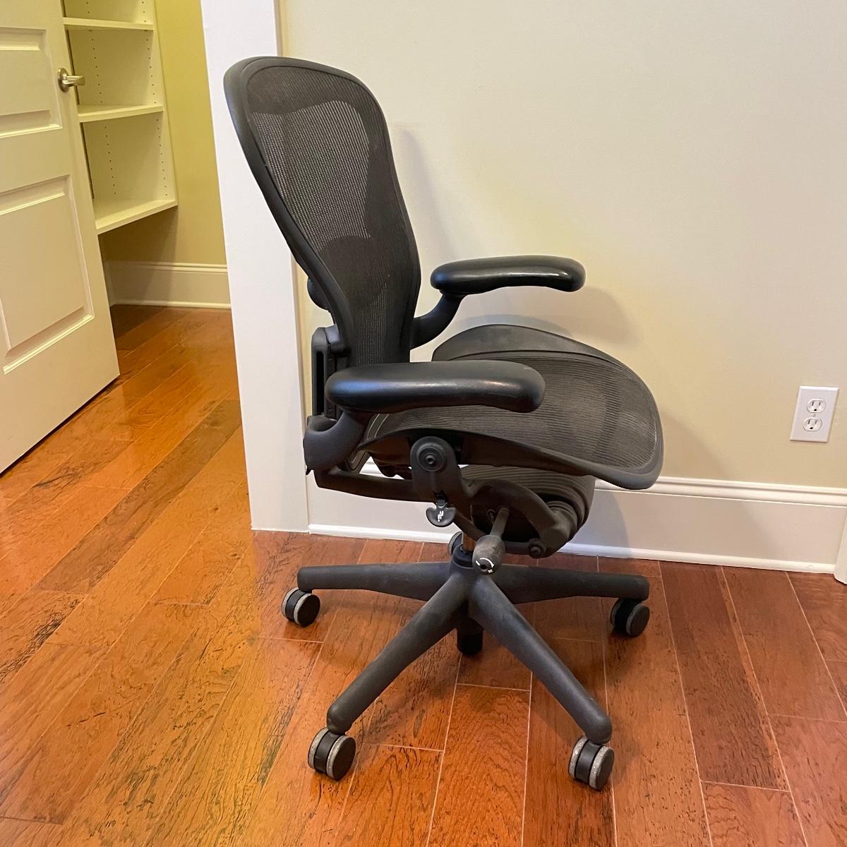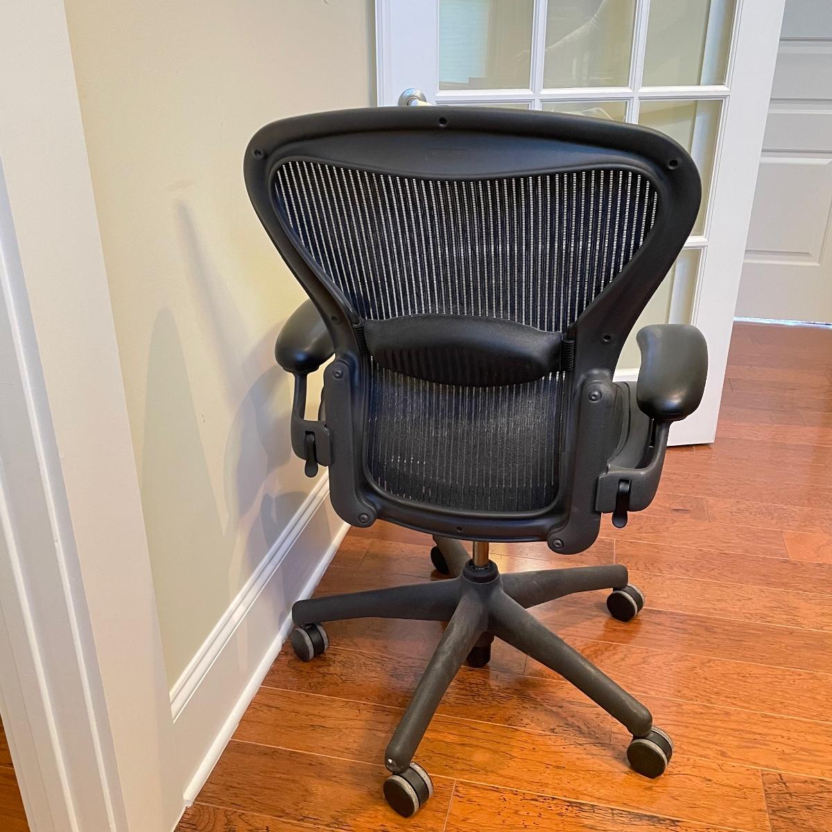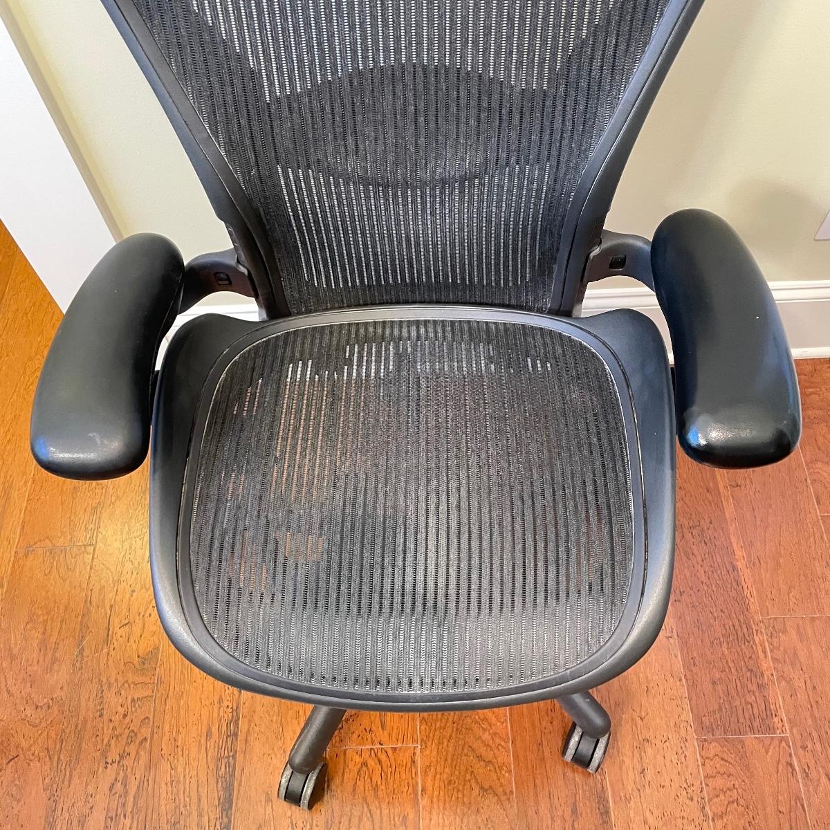 Nice charcoal and black Herman Miller office chair. Wheels roll smoothly and chair is adjustable. As pictured, chair measures 25” x 25” x 39” with a seat height at 21”. This has the original label under the seat that says it was manufactured in 2006. Has the two bumps on back indicating a size “B”. Local pick up only