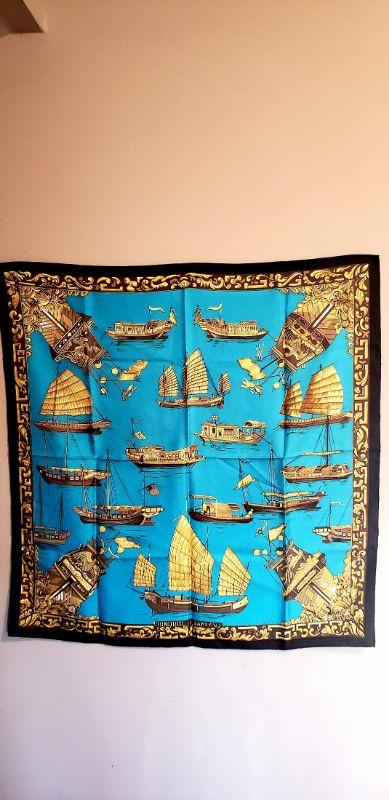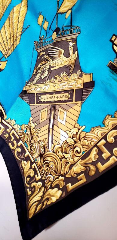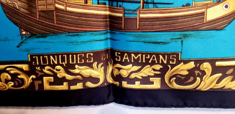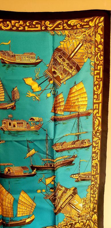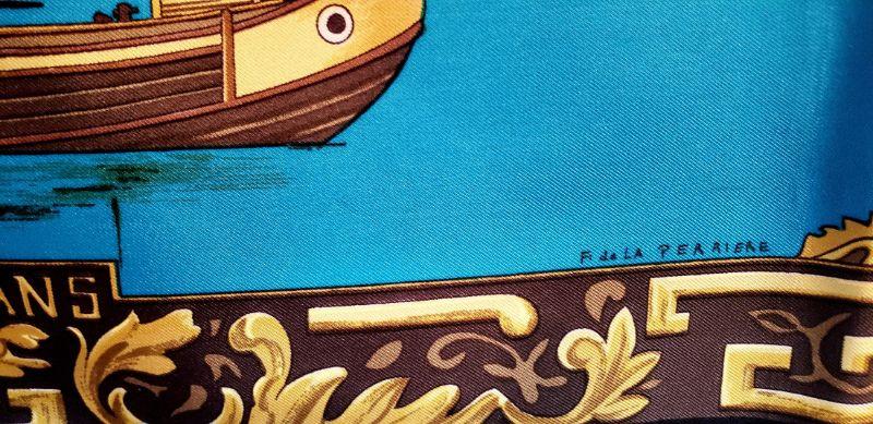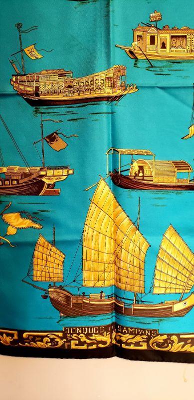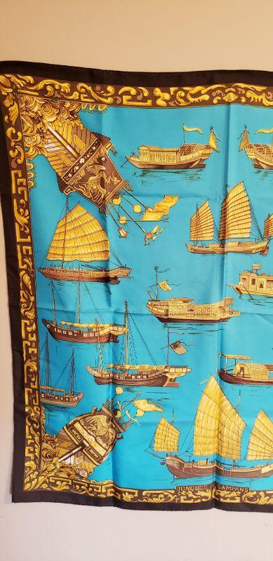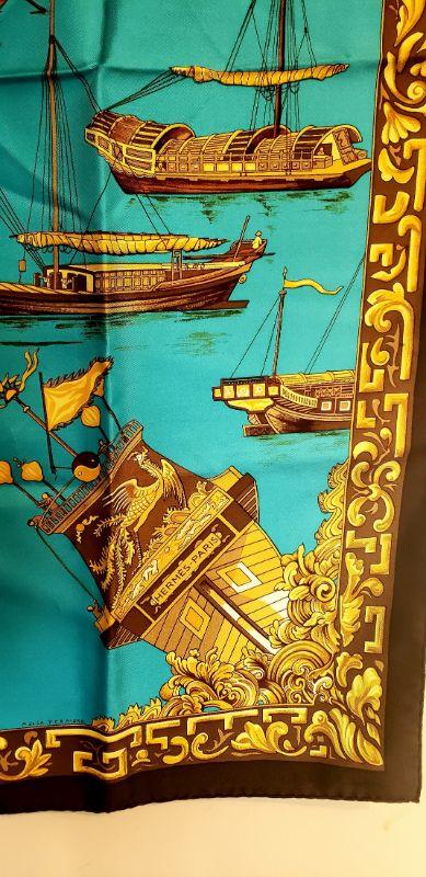 Aqua gold and brown Jonques et Sampans silk Hermes scarf Signed and designed by Frabcoise de La Perriere in 1966. This one became synonymous with Hermes because it was re issued.