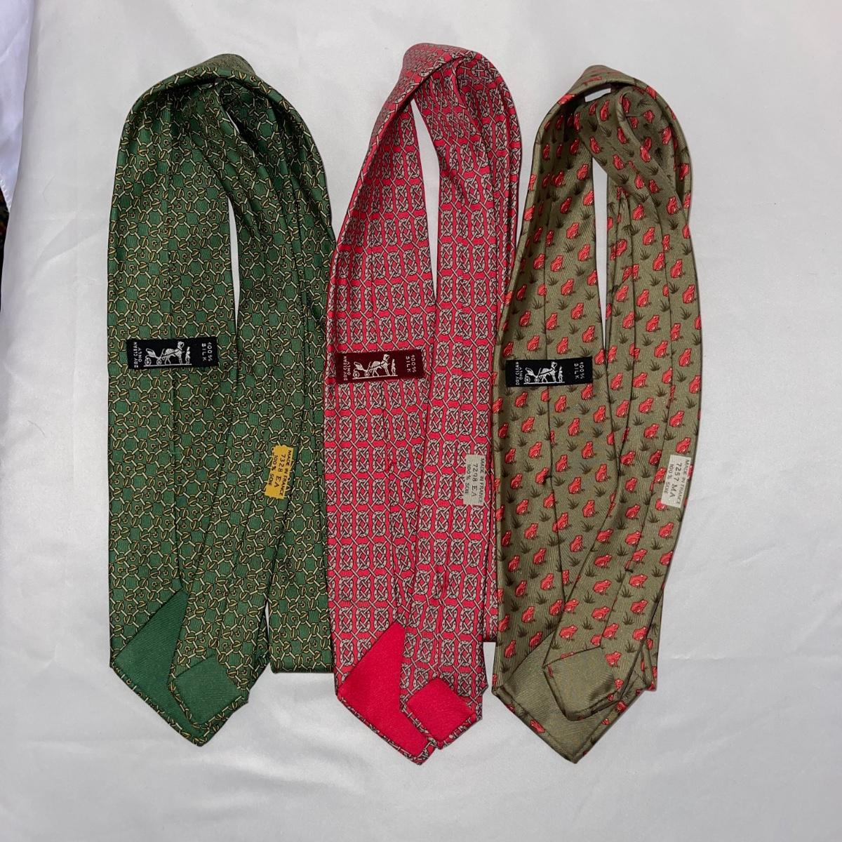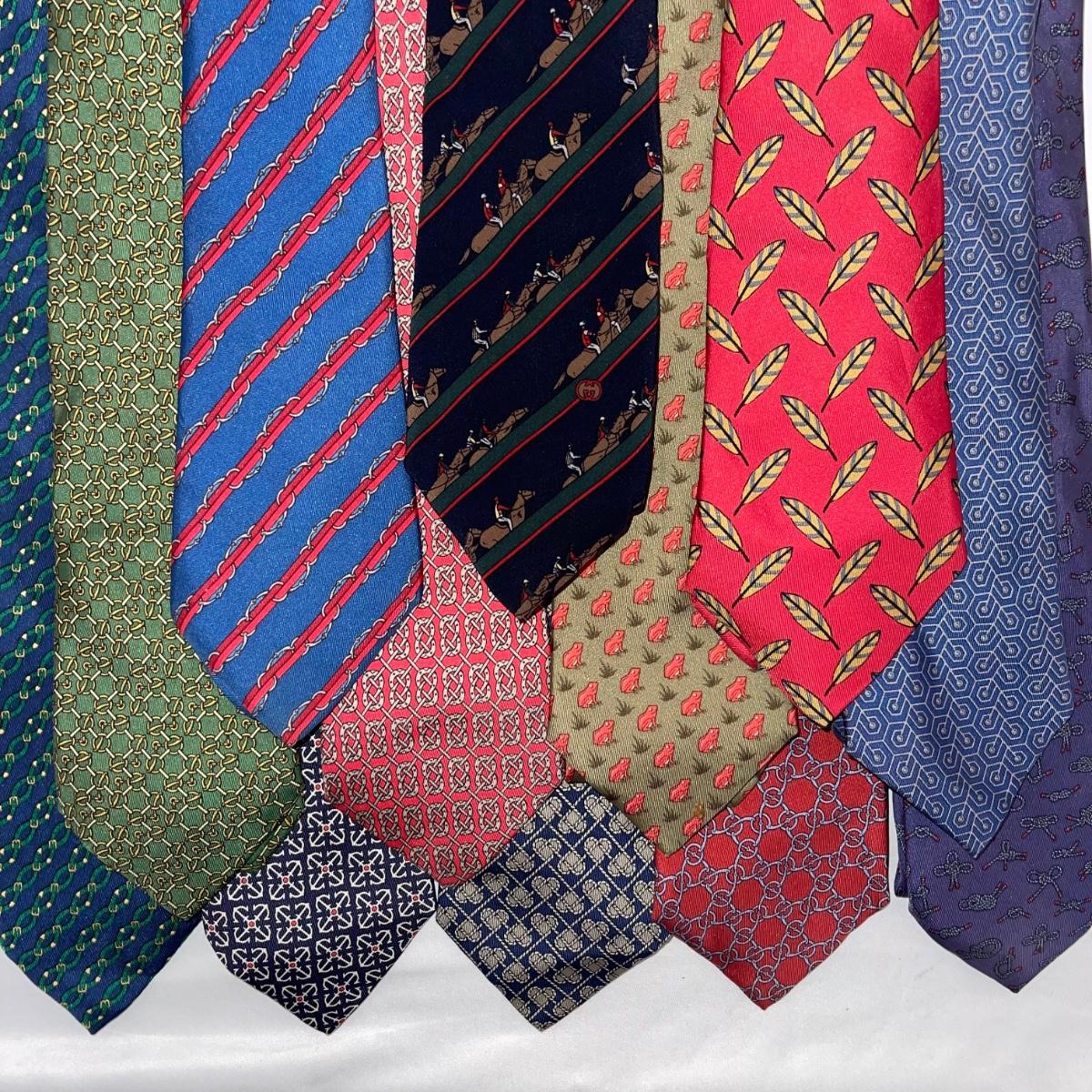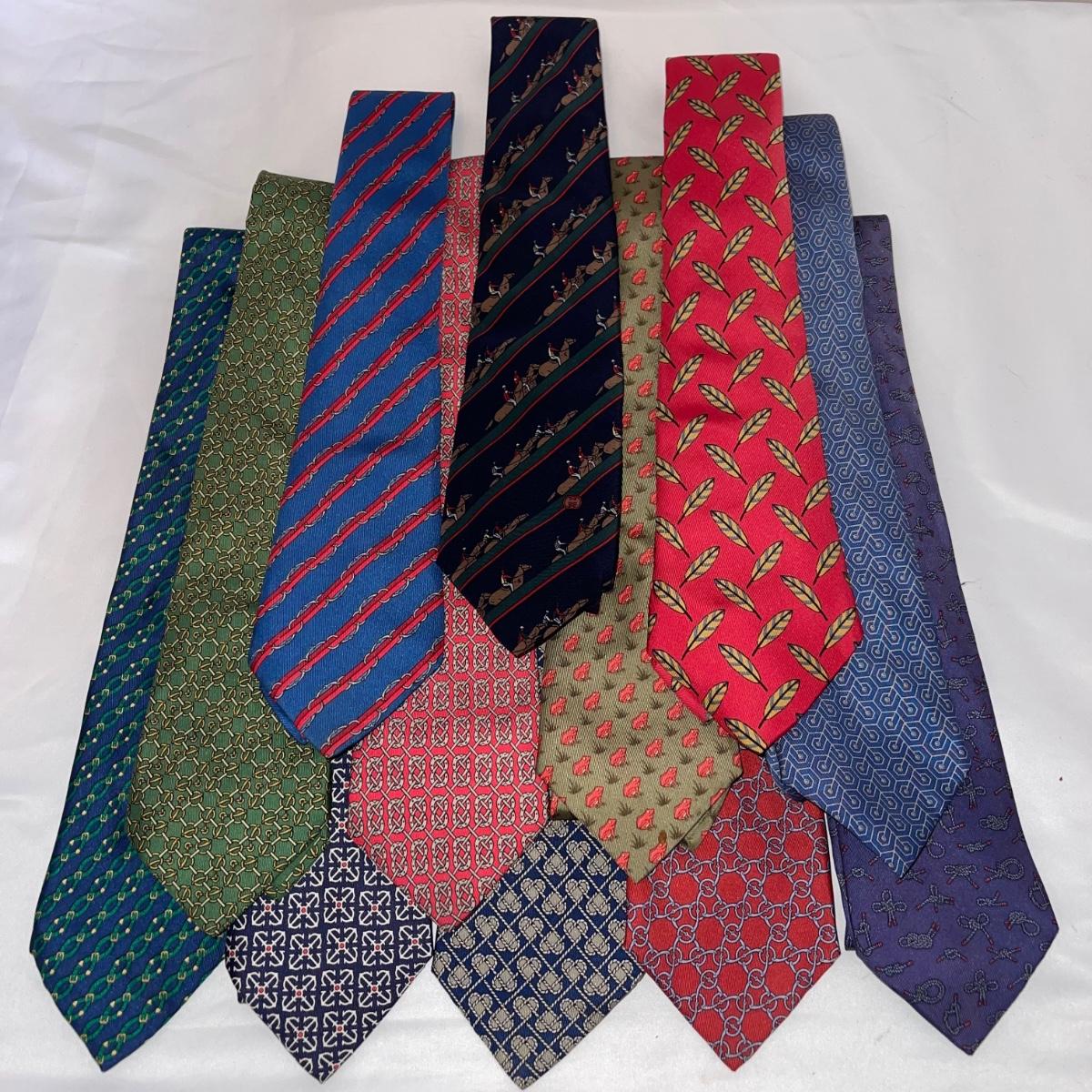 Eleven Hermes and one Gucci silk neck ties. One of the Hermes ties does not have a tag. The Gucci tie is decorated with equestrian imagery.