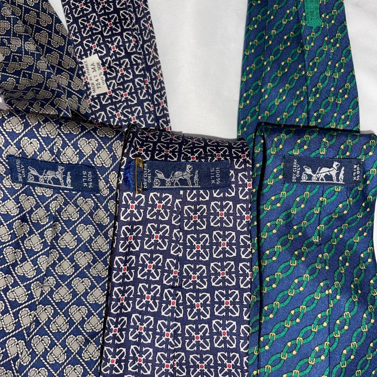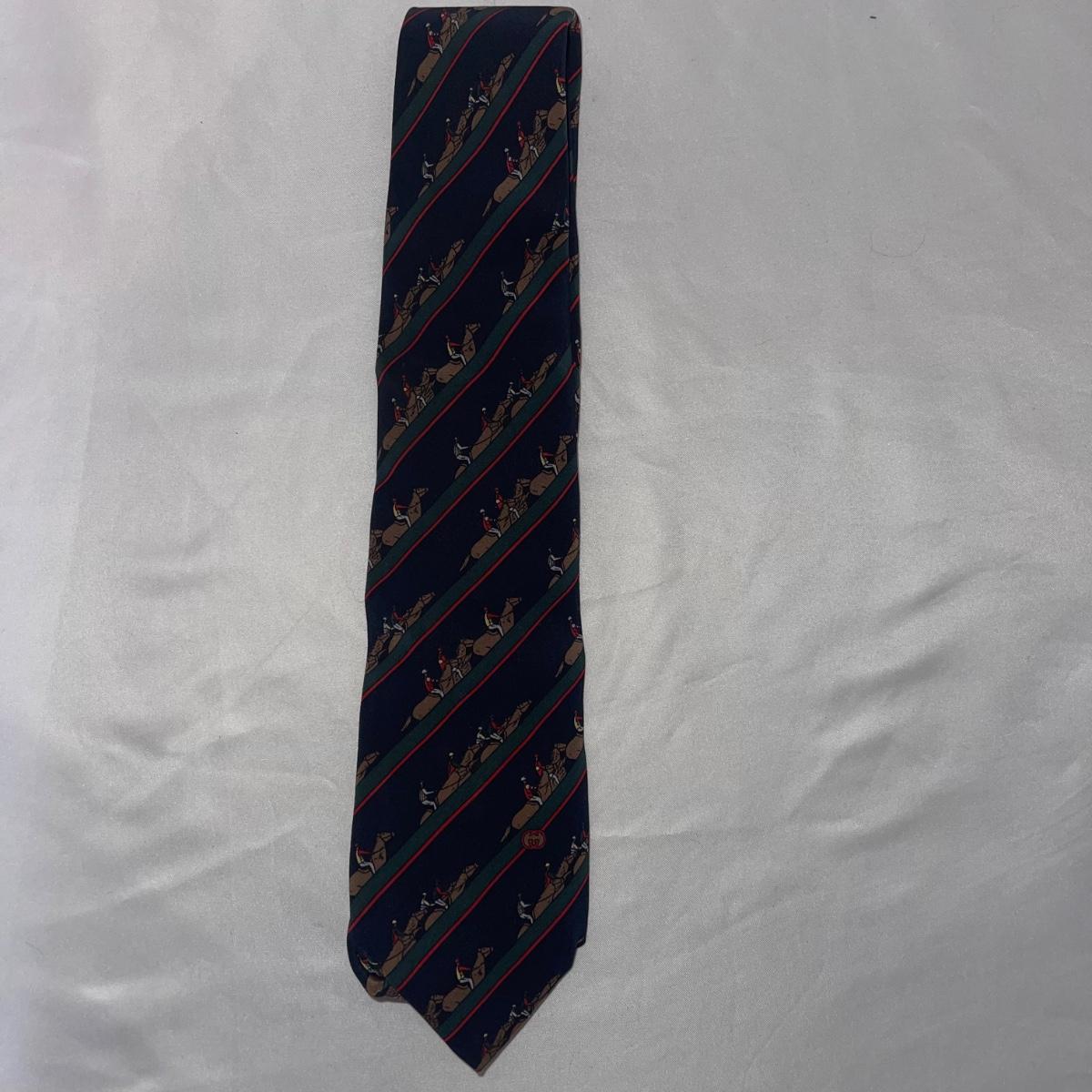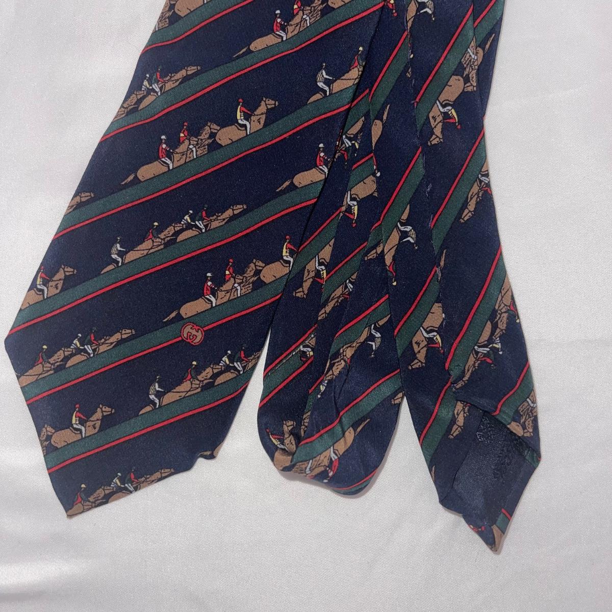 Eleven Hermes and one Gucci silk neck ties. One of the Hermes ties does not have a tag. The Gucci tie is decorated with equestrian imagery.
