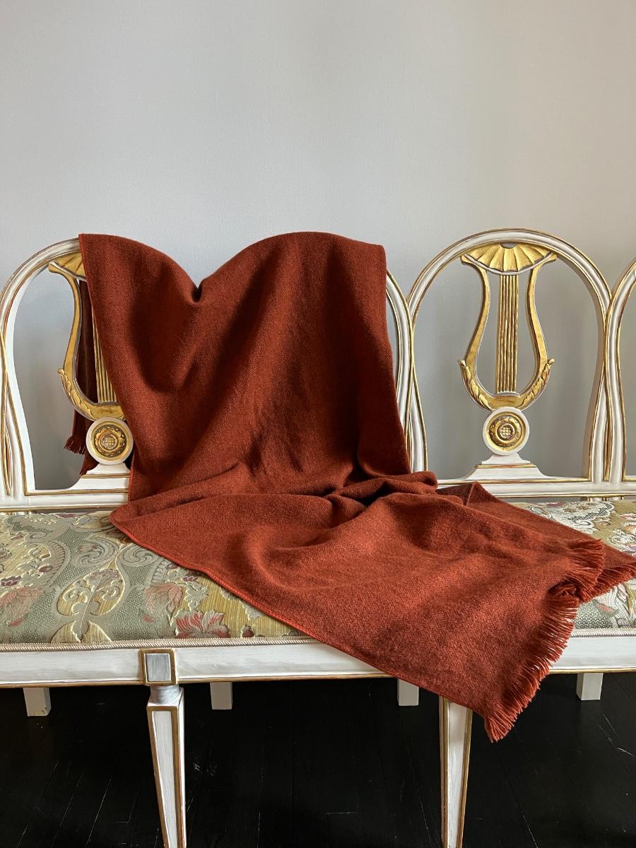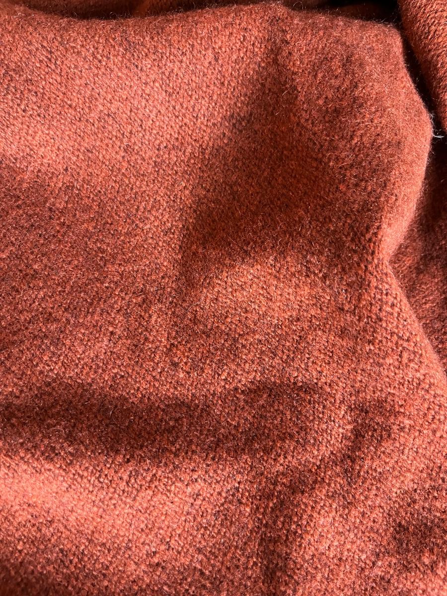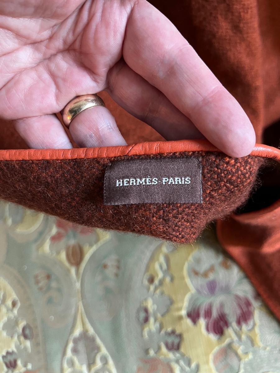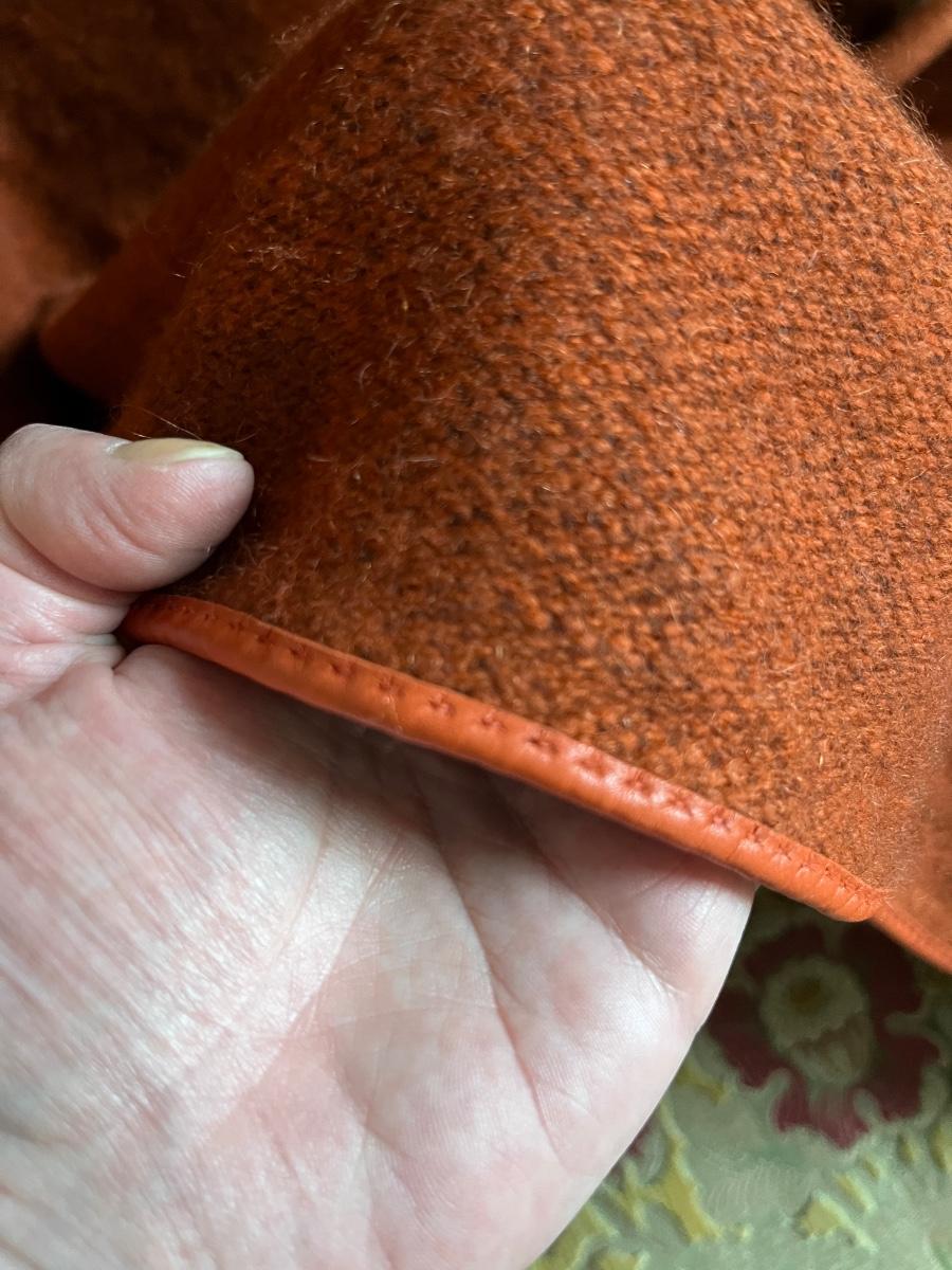 Hermes rectangular stole, orange and brown double woven, edged in orange leather with fringed edge, 27” x 80”