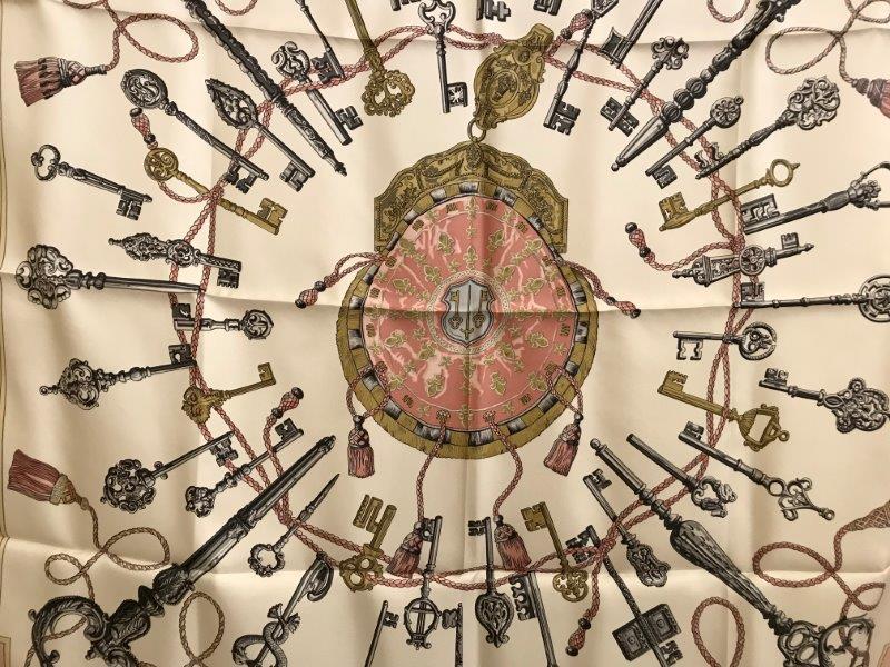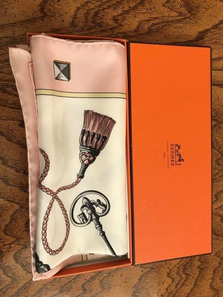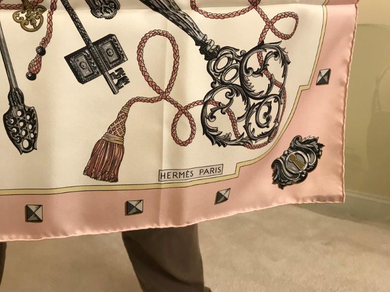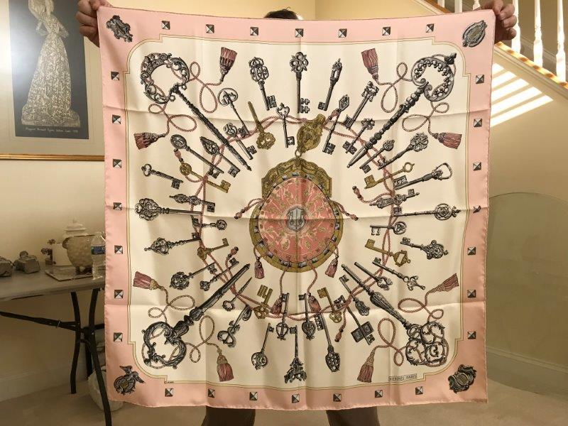 Lot 58-Hermes Paris Scarf in Box- Les Cles (The Keys) in Pink