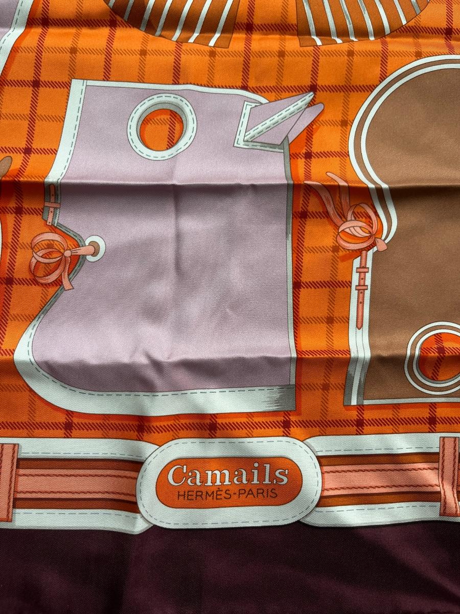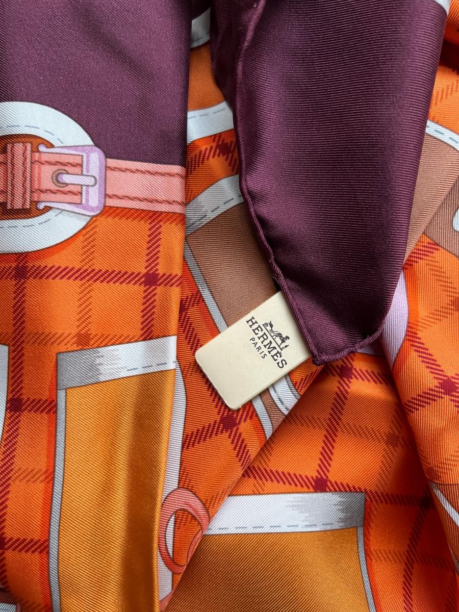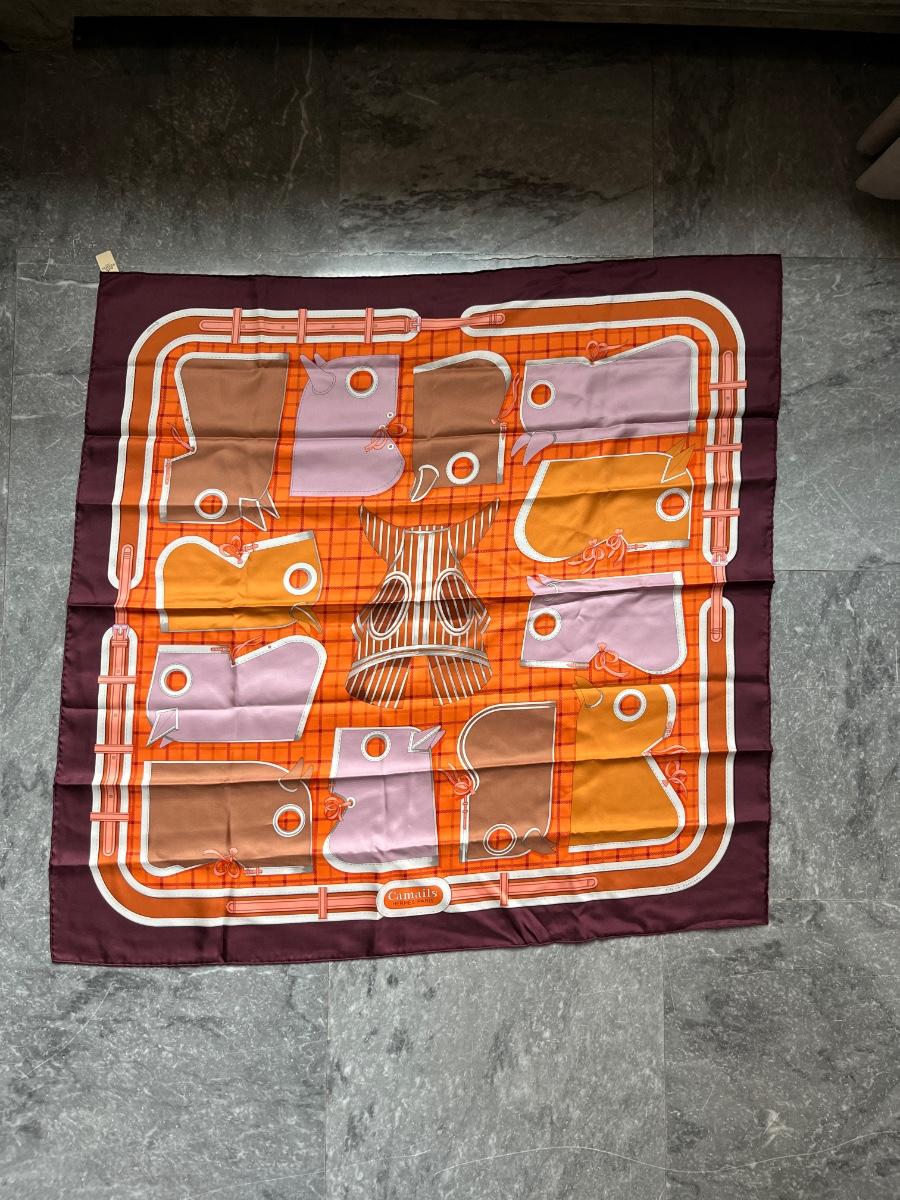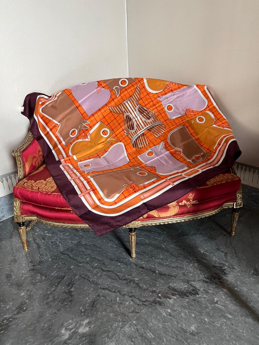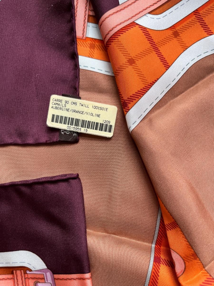 Hermes scarf, Camails by Francoise de la Pierre, aubergine, orange and brown color-way on a orange and wine plaid ground, silk twill with hand rolled edges, 36”x36”, never worn, new with tags