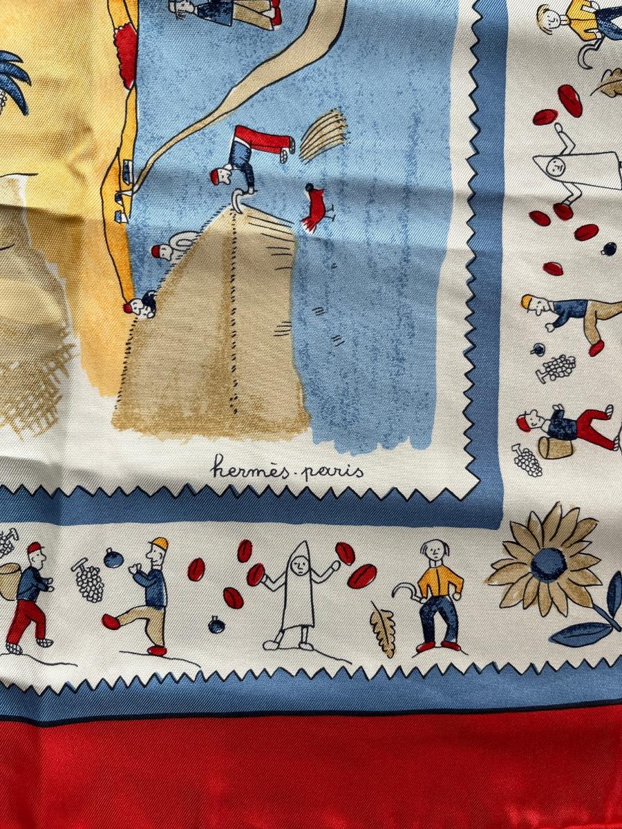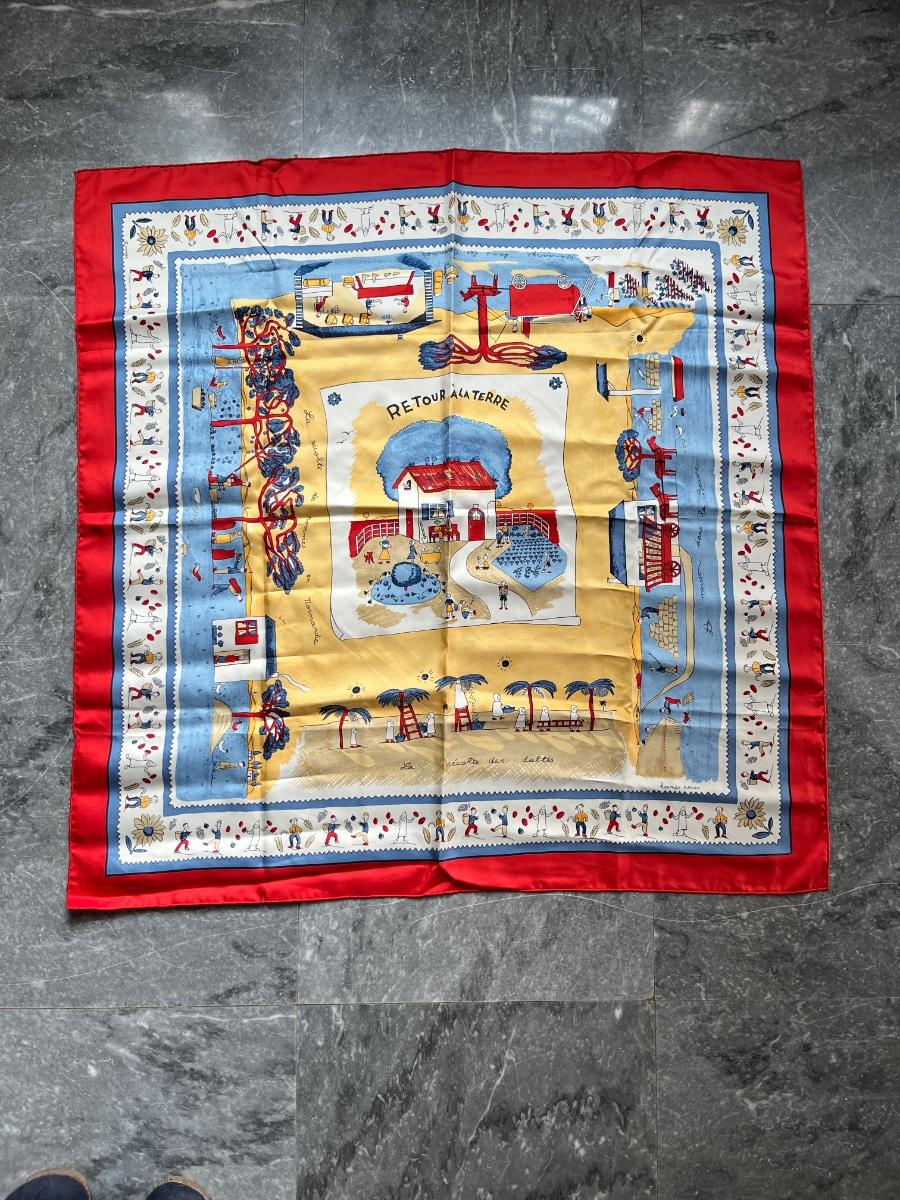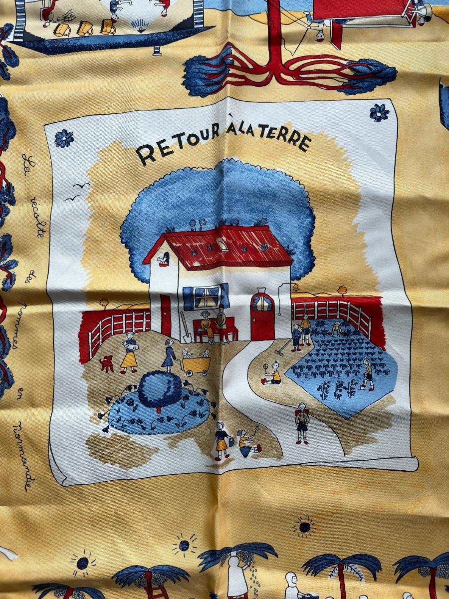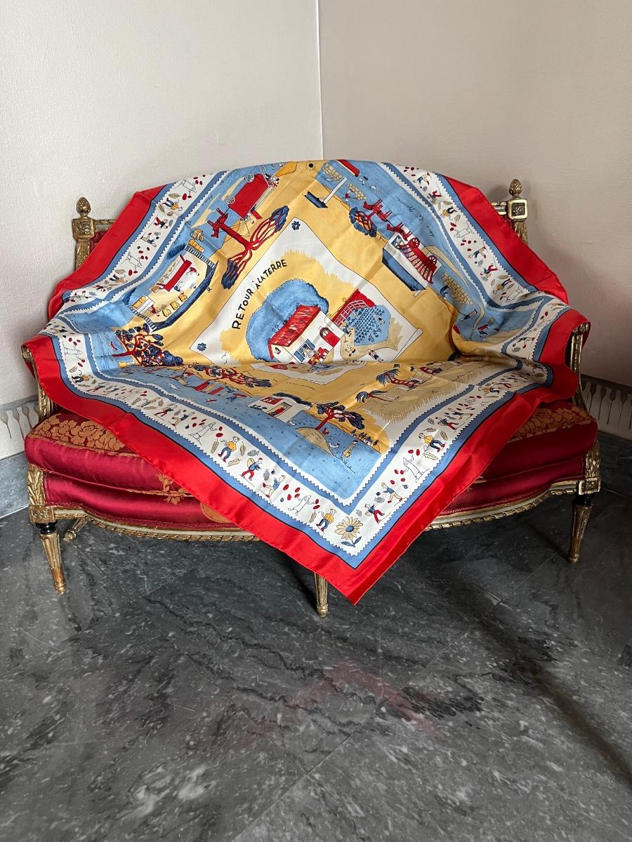 Hermes scarf, Retour de la Terre by Oliver Dumas, originally released in 1942 and re-released in 1998, a cheerful and whimsical scene in red, white, blue and yellow of happy days playing on the beach in Normandy (perfect for your next trip to Florida, Cape Cod, the Hamptons or Block Island), silk twill with hand rolled edges, 36”x36”, hardly worn, almost new