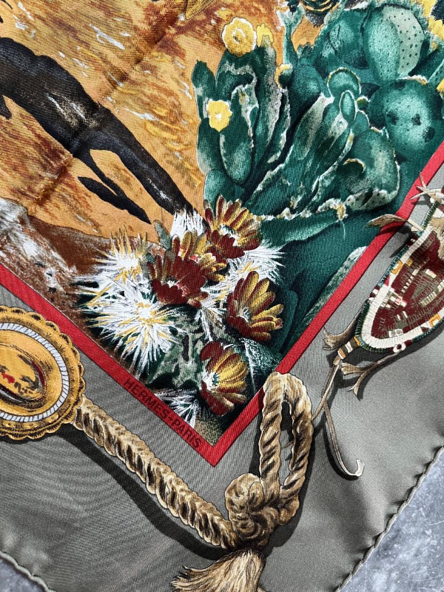 Hermes scarf, Pony Express by Kermit Oliver, released in 1993, The Pony Express was one of 17 designs that Oliver made for Hermes. Oliver was a well known African-American artist in Texas and came to Hermes on the recommendation of Lawrence Marcus of Neiman Marcus in 1980. Oliver’s southwestern themed designs are some of the most sought after in the realm of Hermes scarves. A naturally colored landscape is bordered by sage green, silk twill with hand rolled edges, 36”x36”, hardly worn, almost new