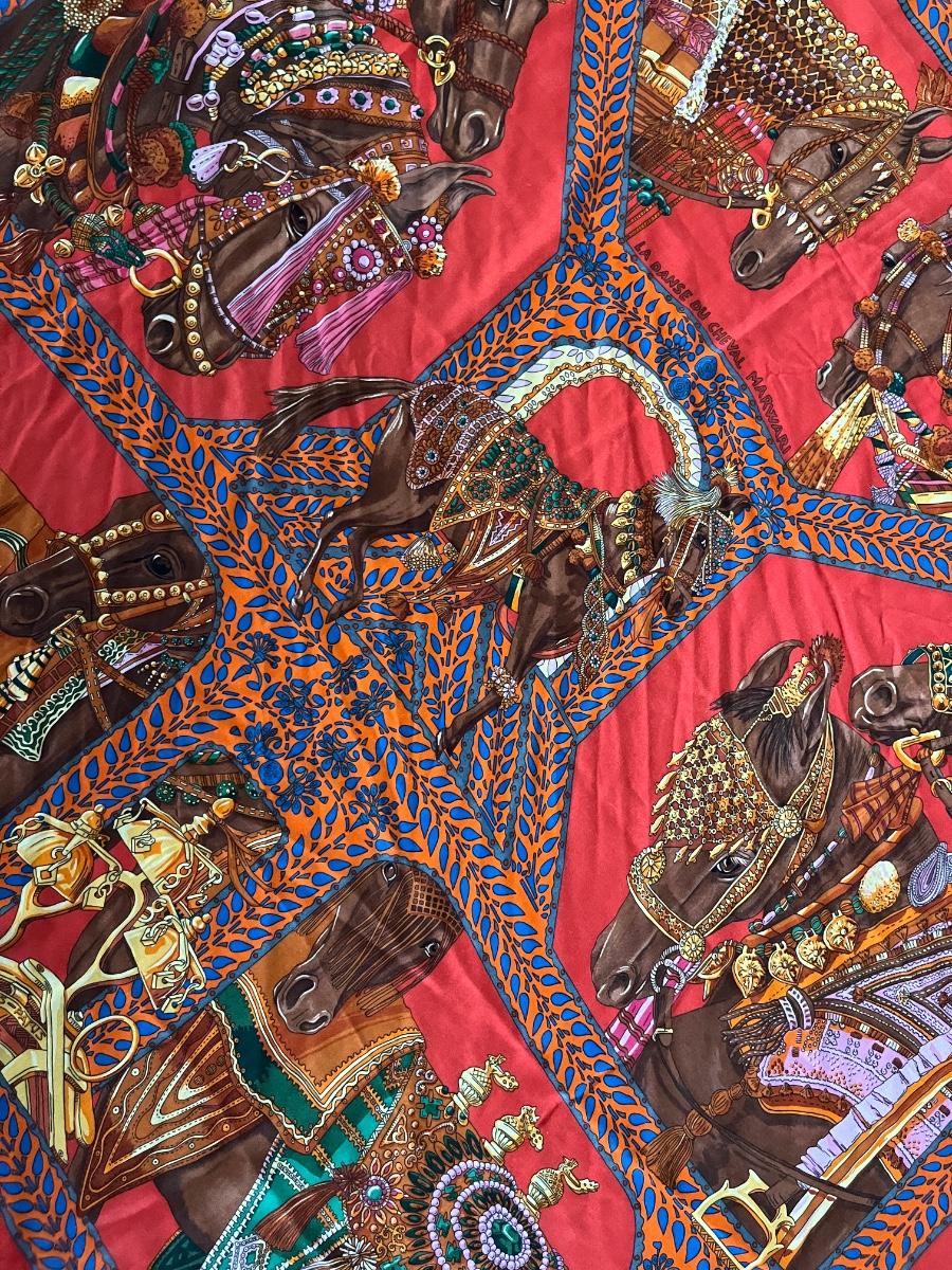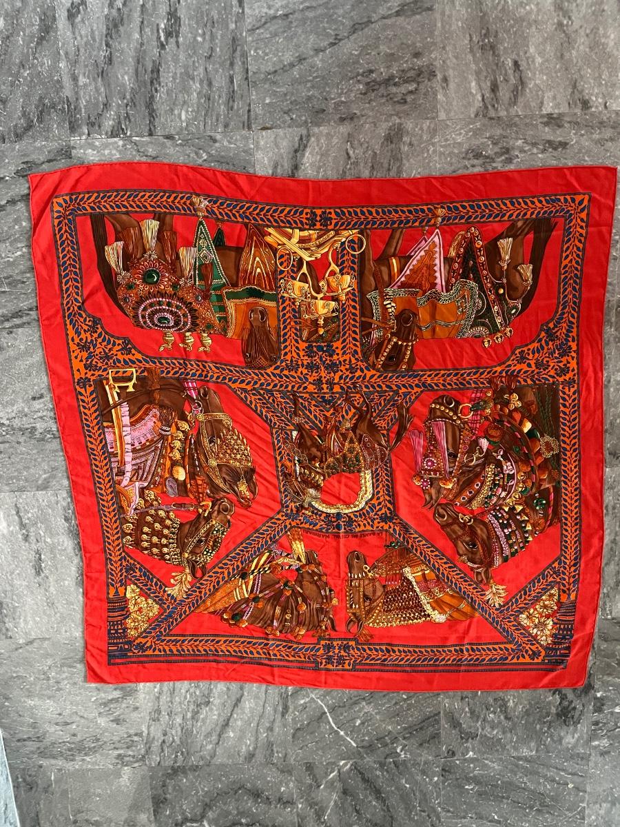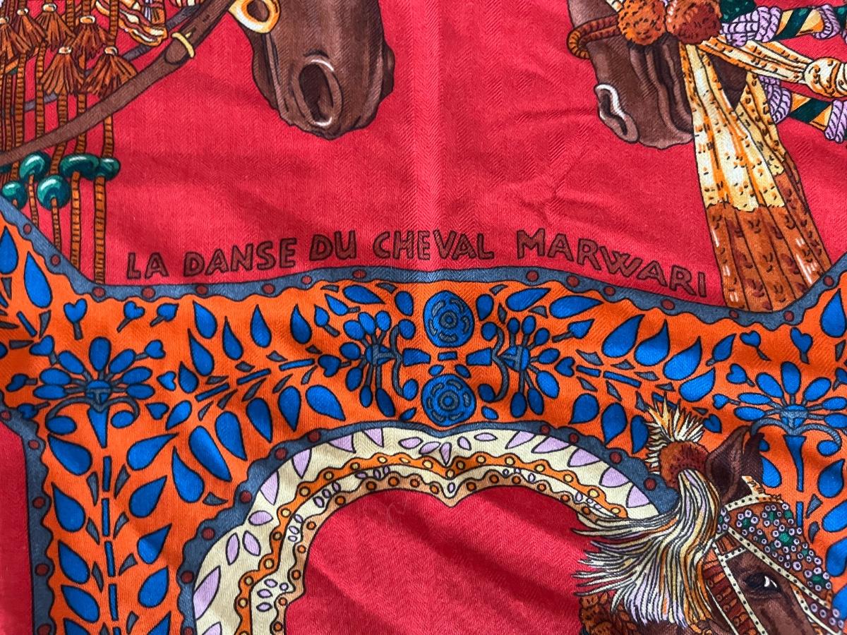 Hermes shawl, La Danse du Cheval Marwari by Annie Faivre, elegant Arabians dance across this shawl, all bedecked in North African finery. The rich color palette recalls the spice markets of the east with saffron, chili red, pomegranate, cobalt and emerald green. Silk and cashmere blend with hand rolled edges, 52” x 52”, hardly worn, almost new