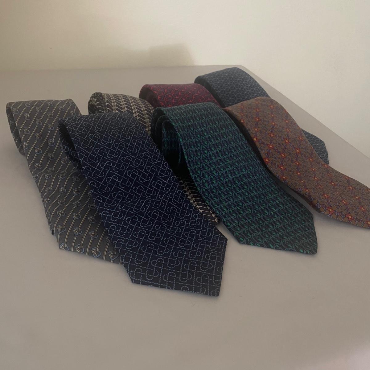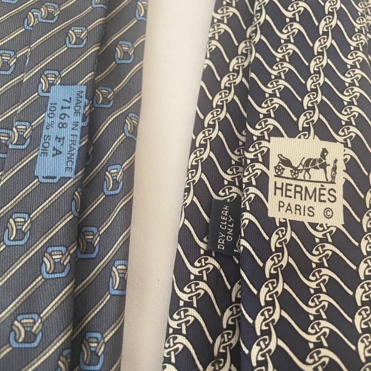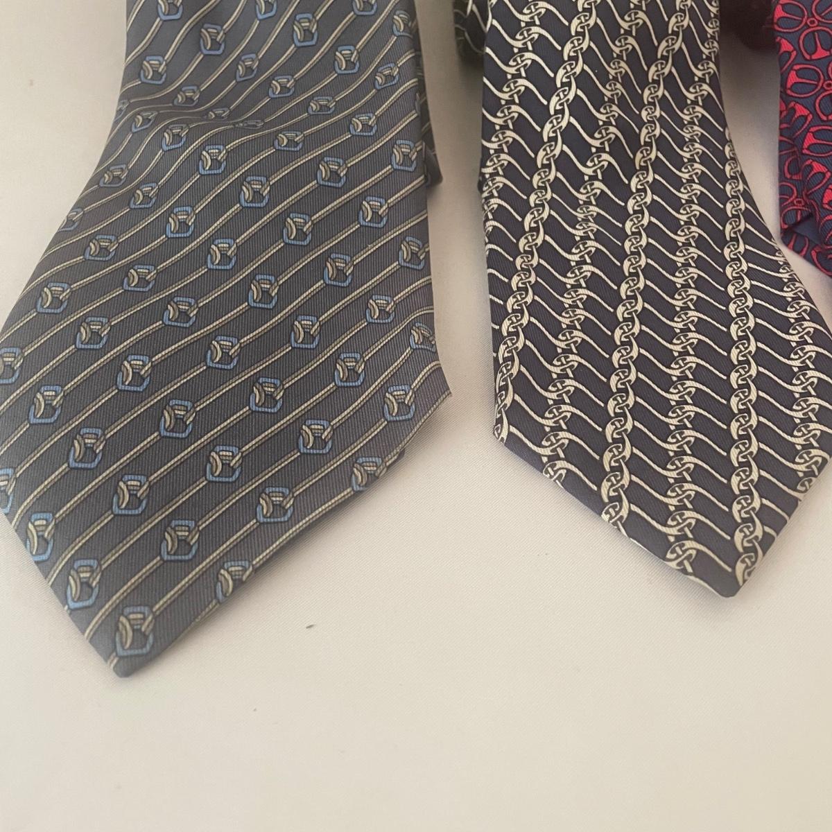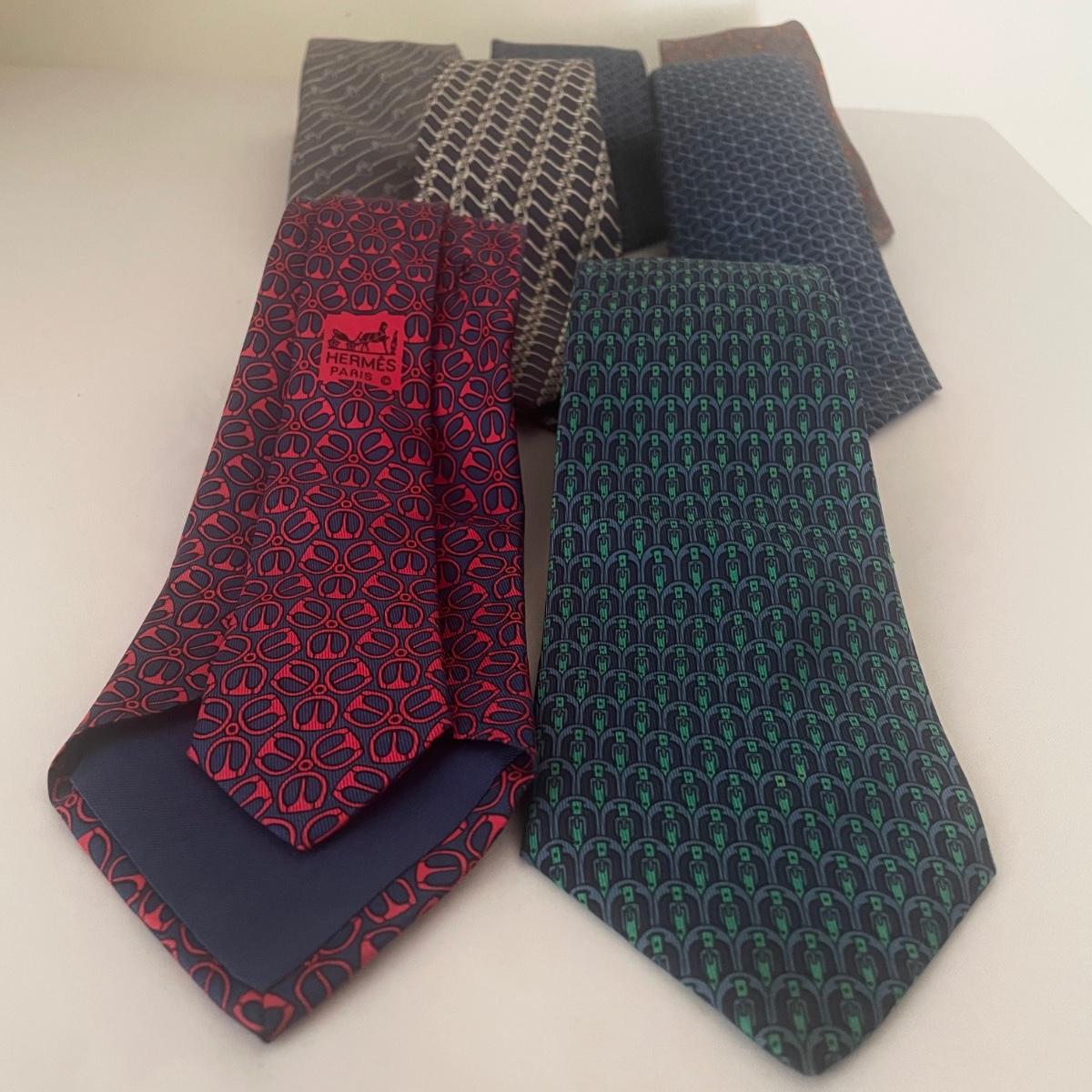 Six of these seven silk ties are labeled Hermes and are 100% silk; the grey tie is also 100% silk and has a matching Made in France tag but is missing the Hermes tag. It is most likely a Hermes as well. All ties are in excellent condition and measure 3.25” wide (widest point) x 54” long.