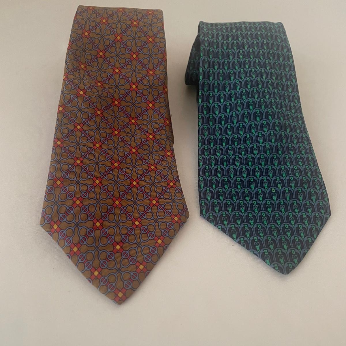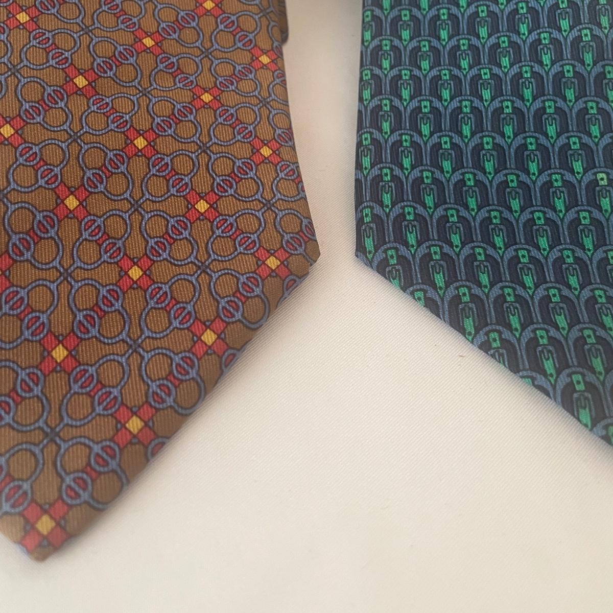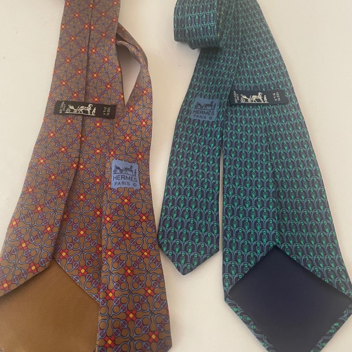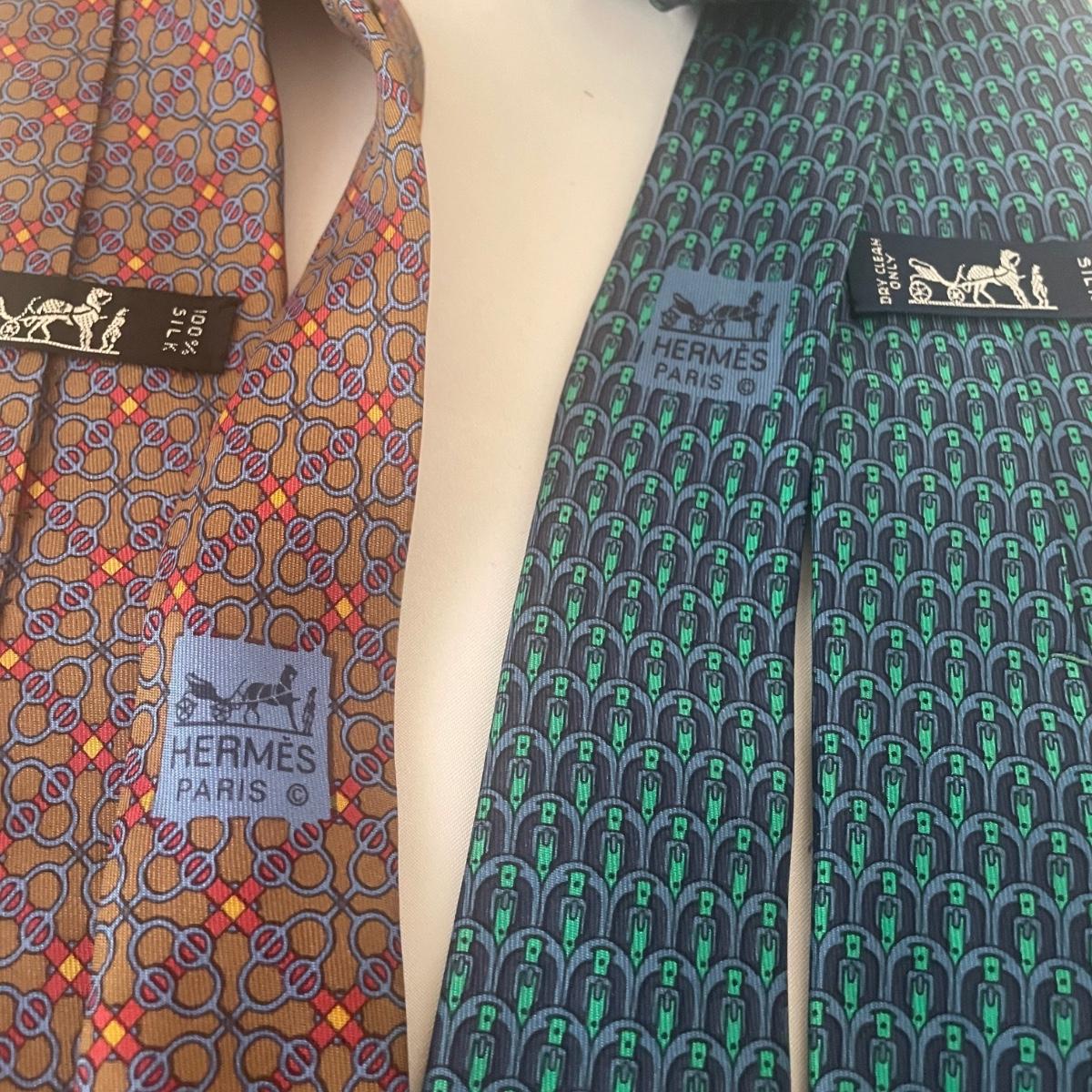 Six of these seven silk ties are labeled Hermes and are 100% silk; the grey tie is also 100% silk and has a matching Made in France tag but is missing the Hermes tag. It is most likely a Hermes as well. All ties are in excellent condition and measure 3.25” wide (widest point) x 54” long.