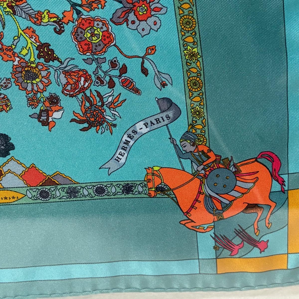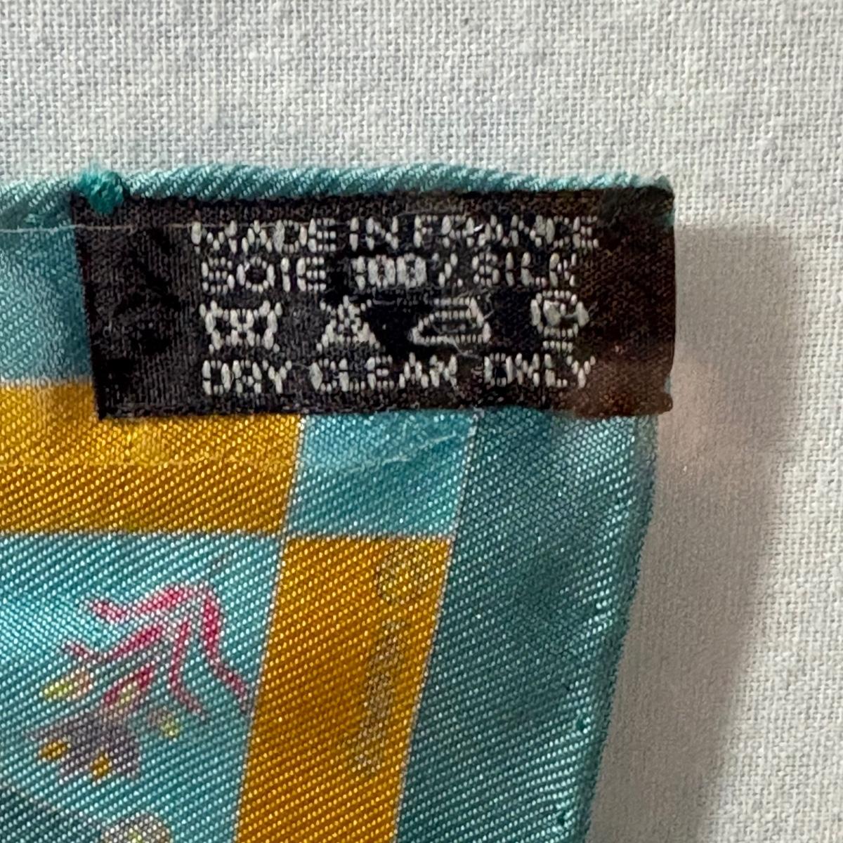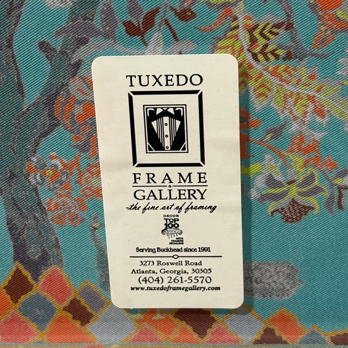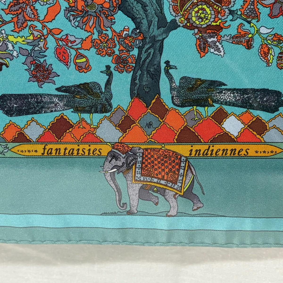 Gorgeous square scarf with tag that says 100% silk. It appears to be made by luxury brand Hermes in the ‘Fantasies Indiennes’ pattern. It is marked made in France. Actual scarf measures 16.5” x 17”. Acrylic display frame is 22.75” x 23”. Possibly produced in early 2000s. Please see photos for details.