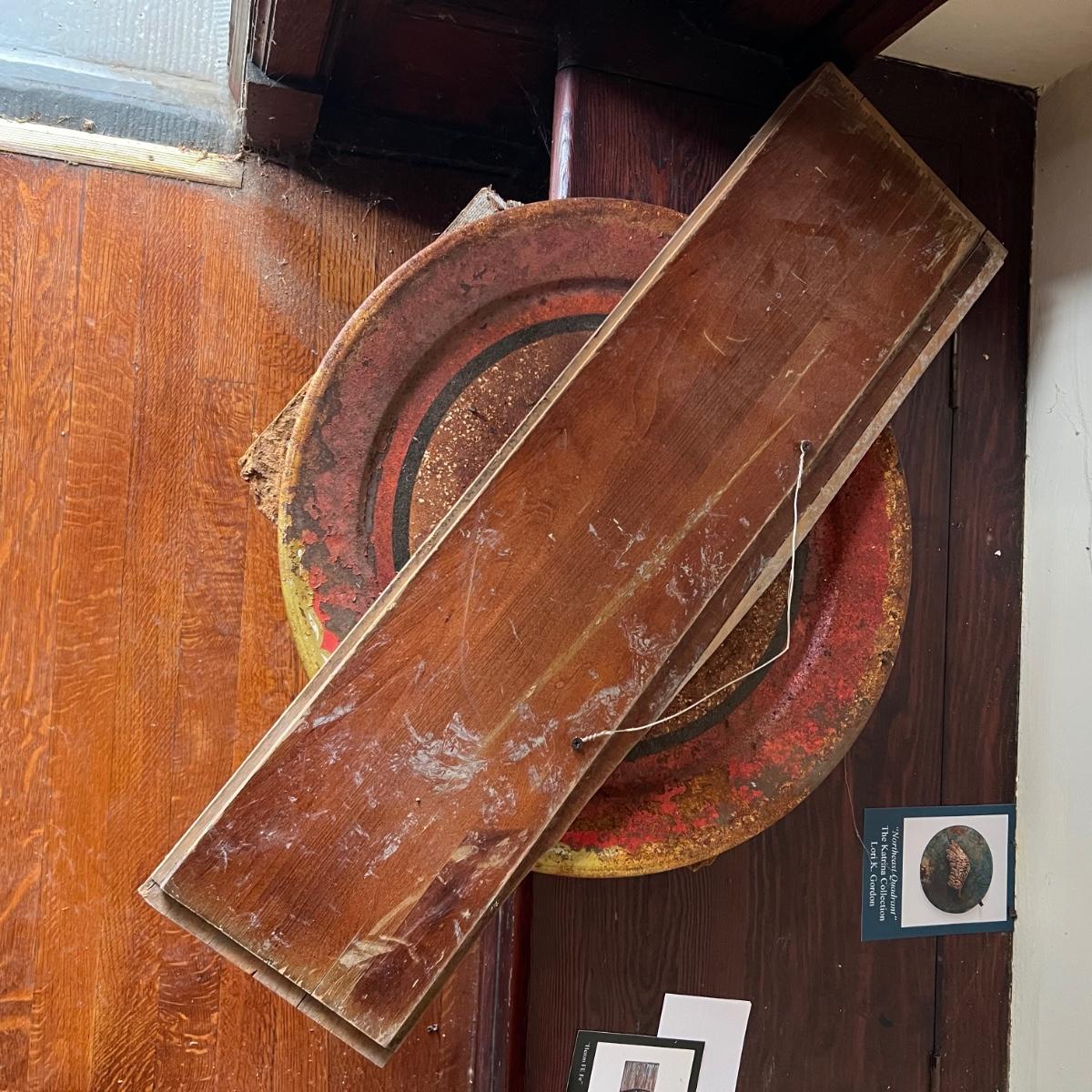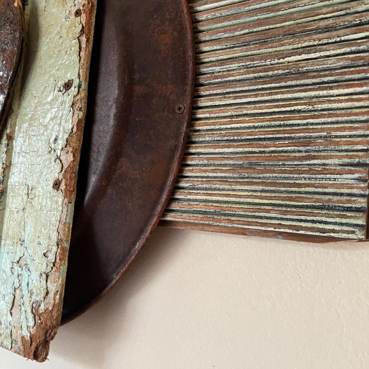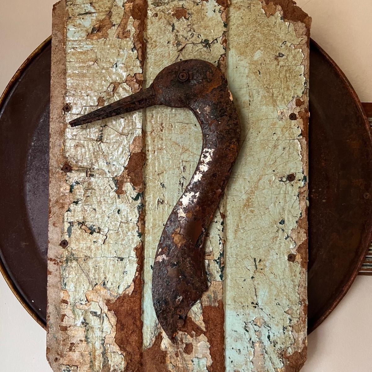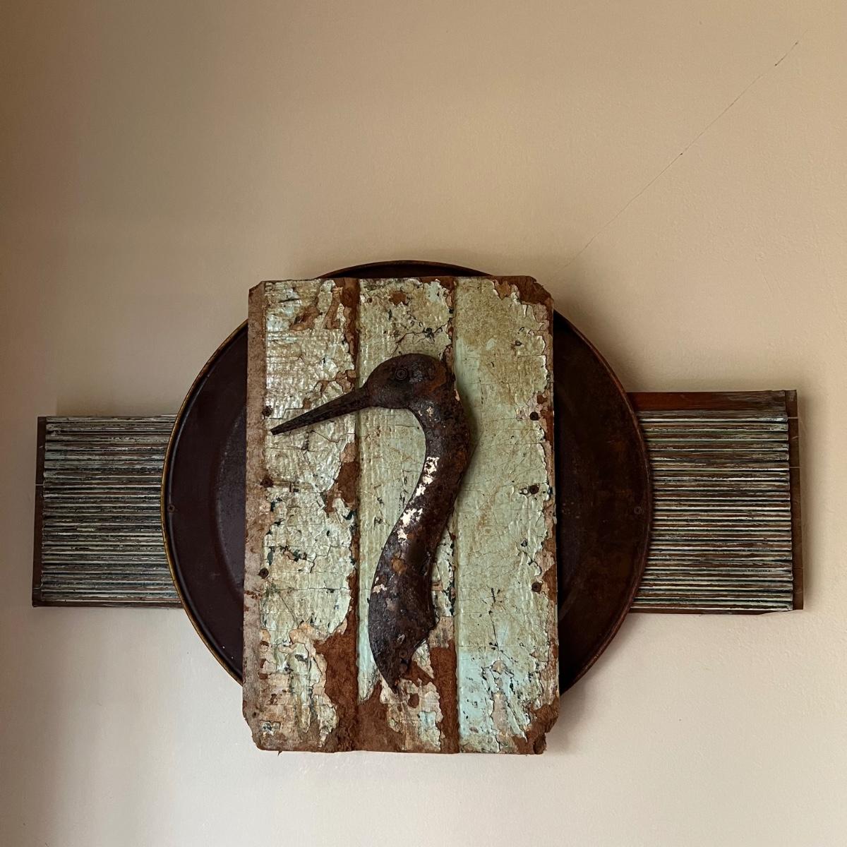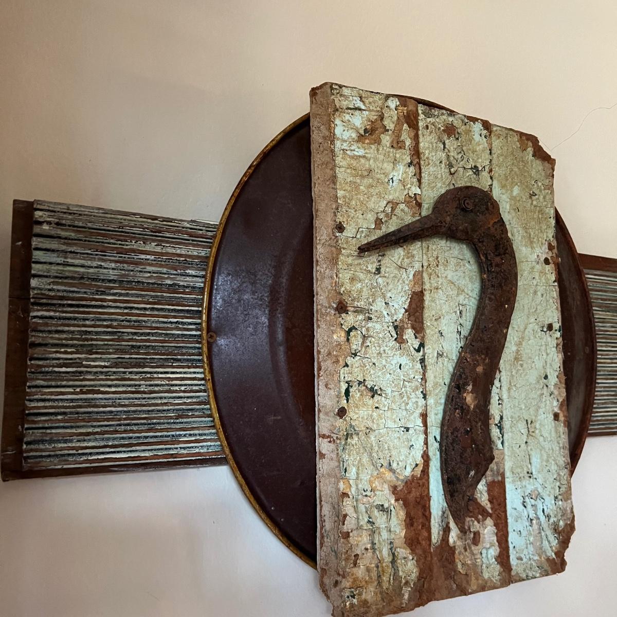 Stunning piece of multi media art titled “Heron FE Fe” by Lori K. Gordon from the Katrina Collection. See image of accompanying information card. Materials are storm debris from Katrina and include metal and wood.