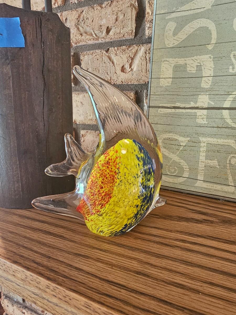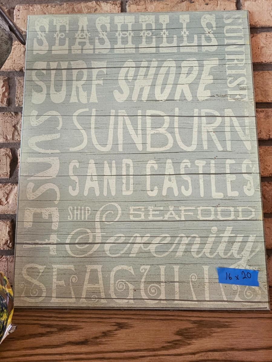 Heron vase-15", wood covered vase-12.5" with pink flowers, glass candy dish, Sea shells sign 16x20", handblown glass fish, wooden carved pelican 22"
