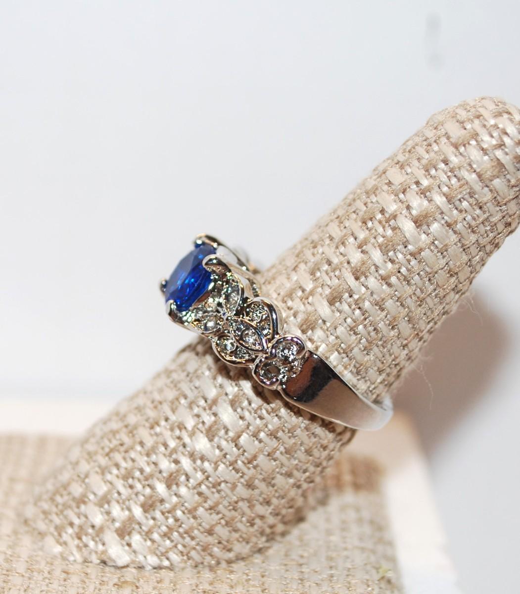 Hexagon Blue Gemstone on Silver Tone Setting Made of Brass Size 8 1/2