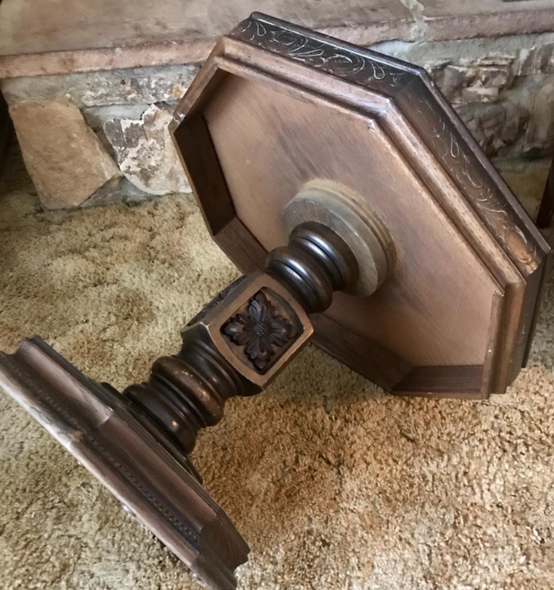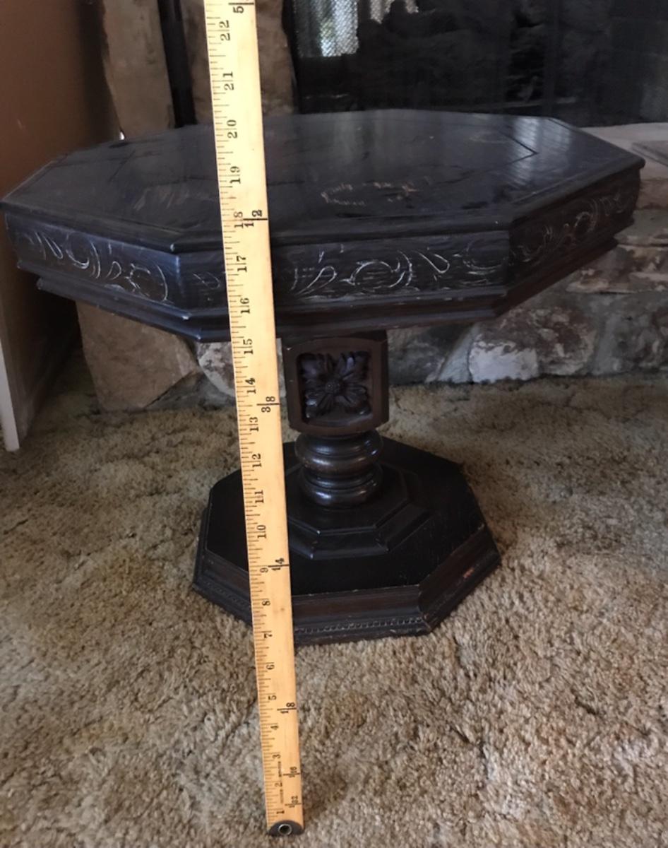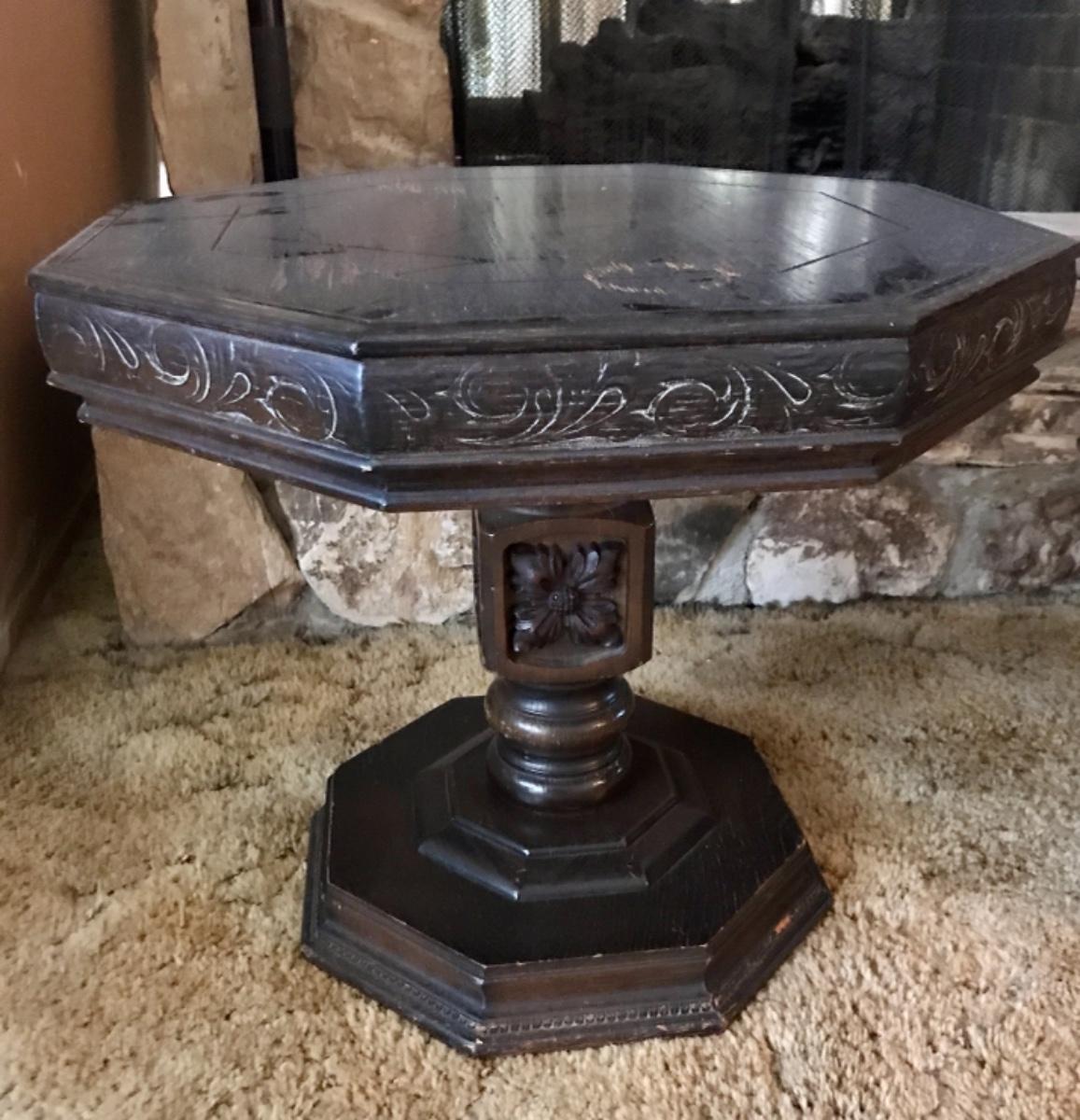 Hexagon end table coffee table Spanish gothic Revival, dark carved wood