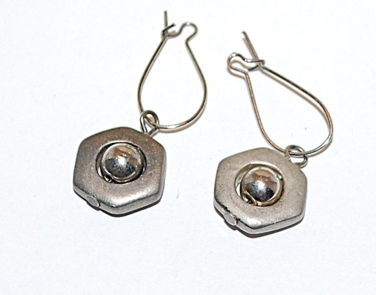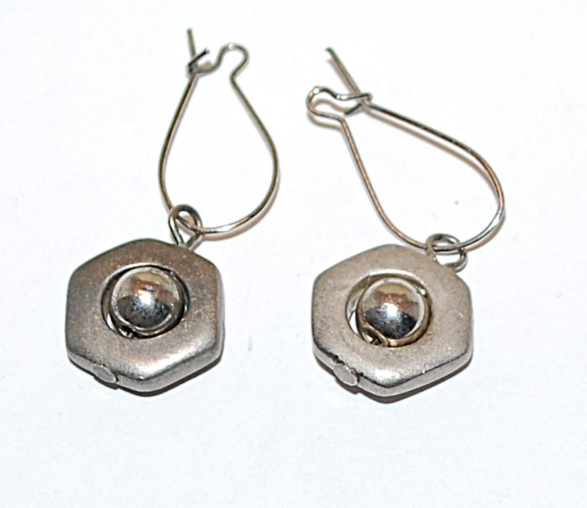 Hexagon Silver Colored EARRINGS Set with MOVEABLE Inner Globe and WIRE SNAP-HOOK Clasp