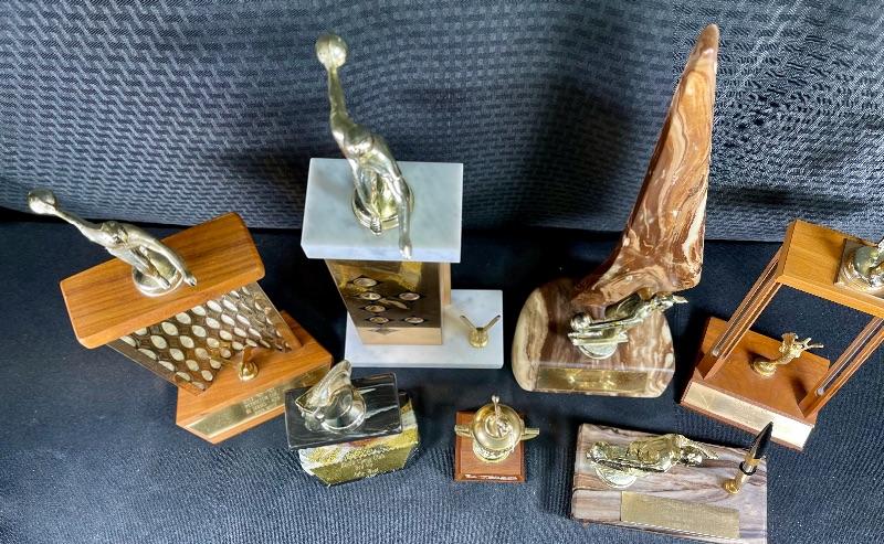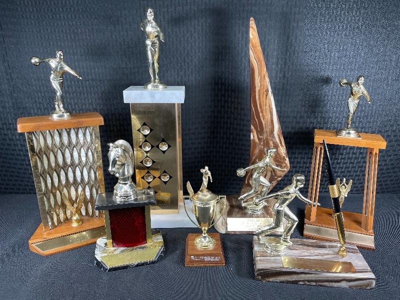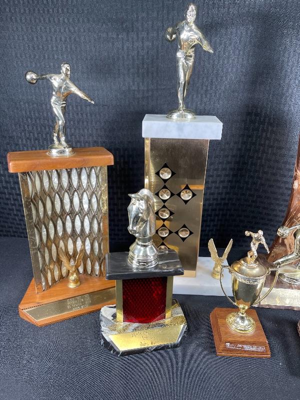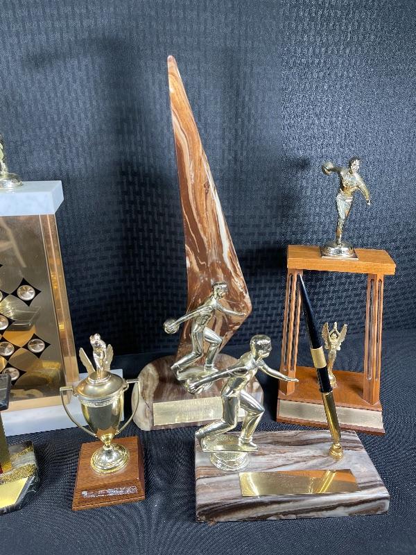 Lot of vintage bowling trophies. Great for added vintage decor or props.