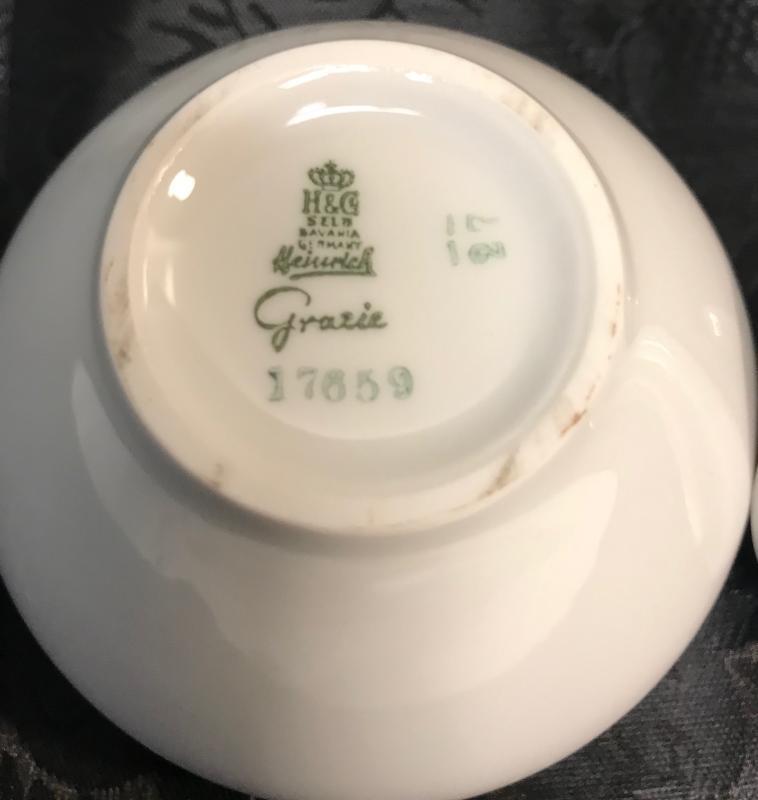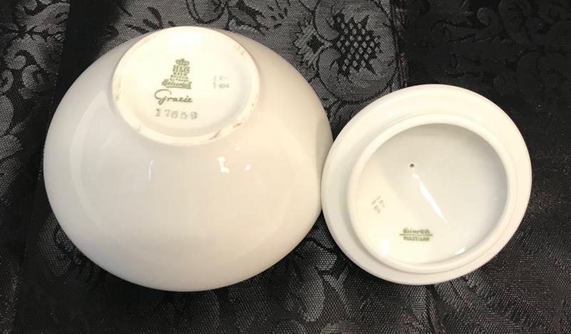 Description: H &G Selb stamped "Gracie" small sugar bowl & lid numbered 17659. Measurement approximate: 4 H X 3 W. Material: Porcelain. Shipping cost:$ 15 Excluding California, Alaska & Hawaii.