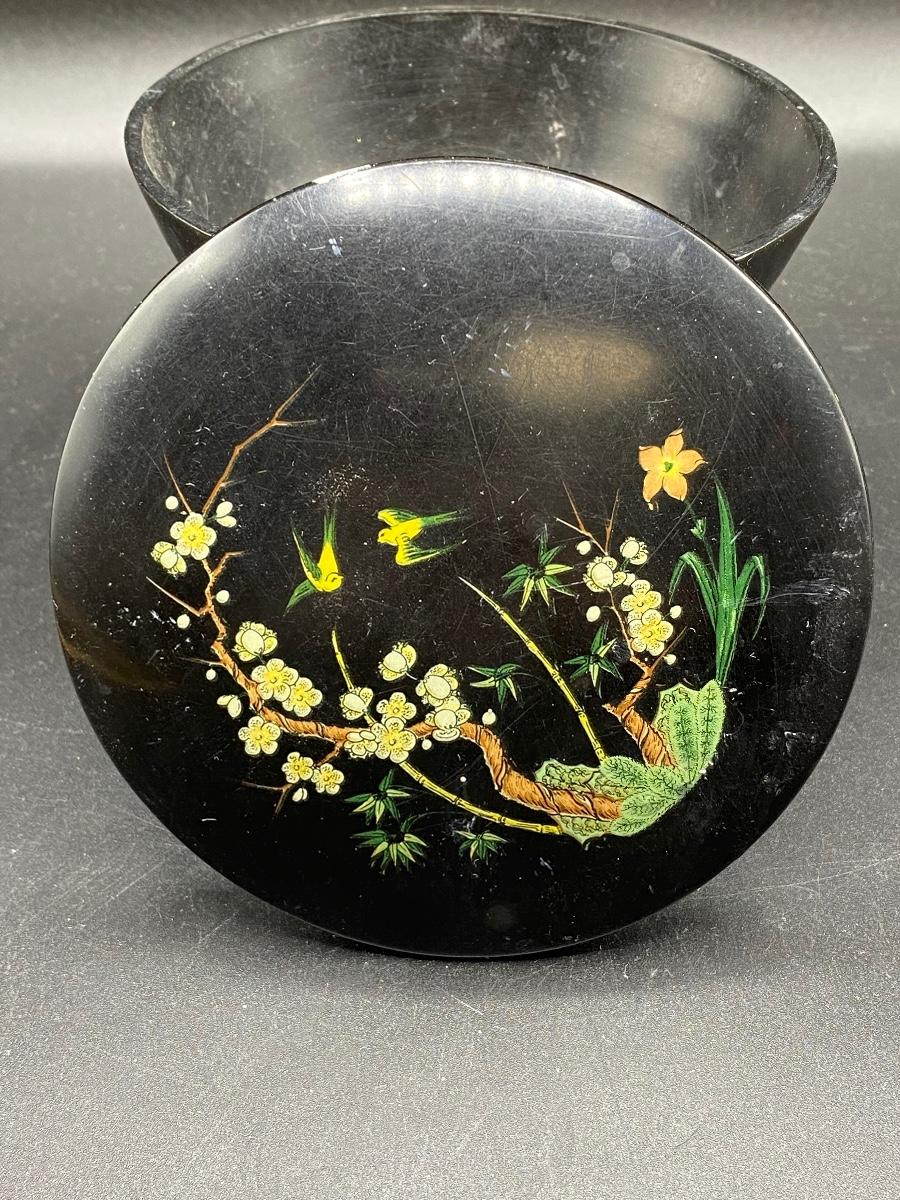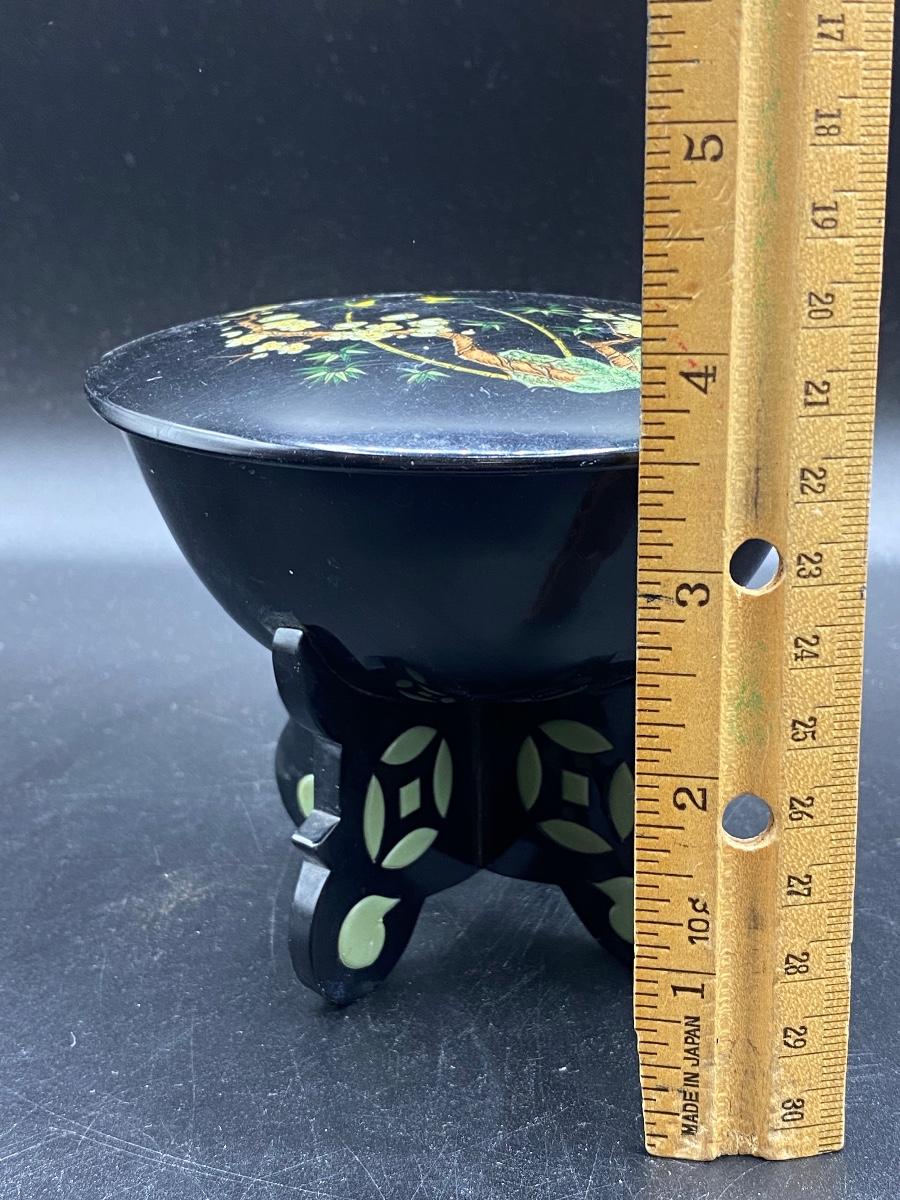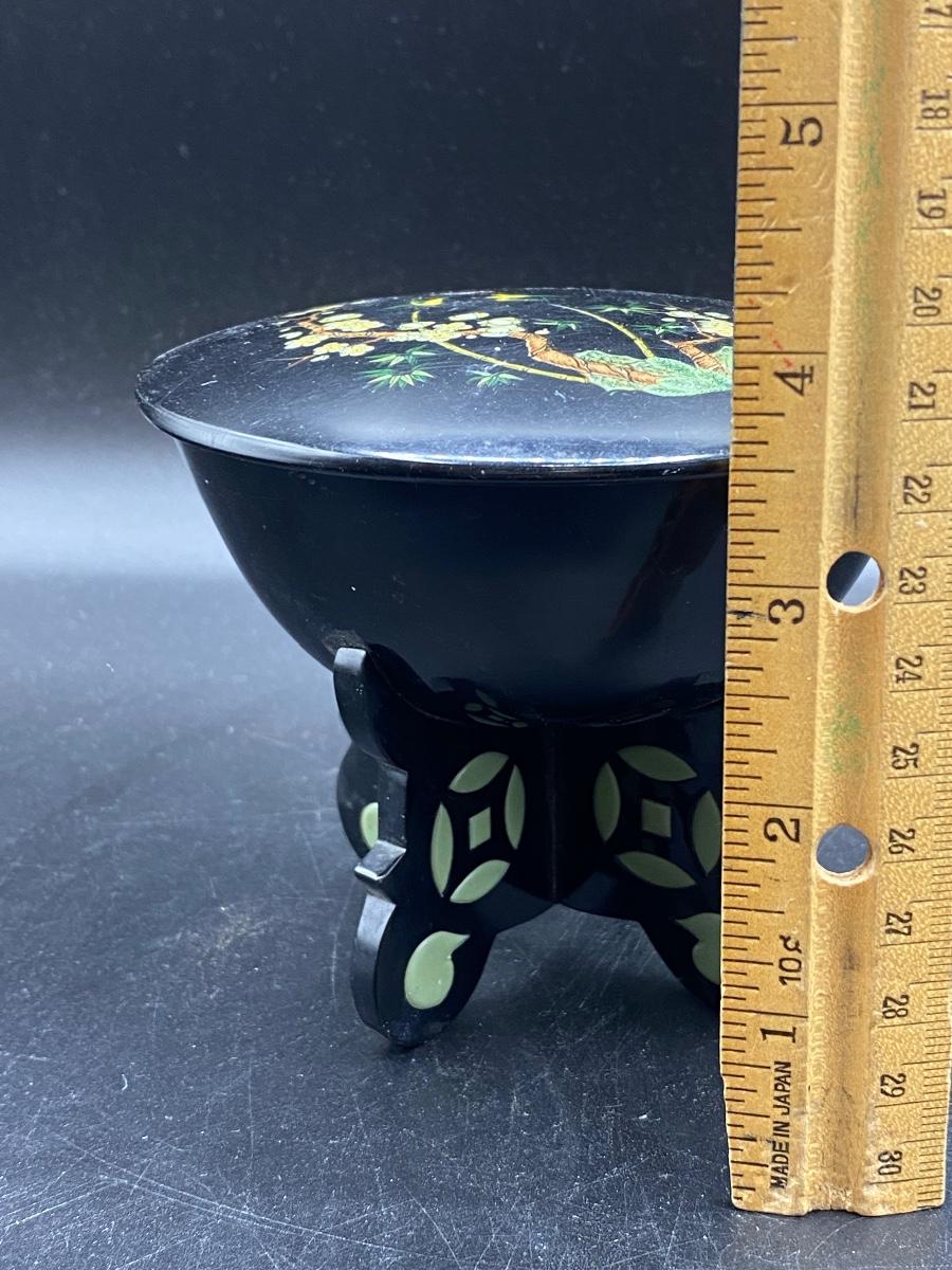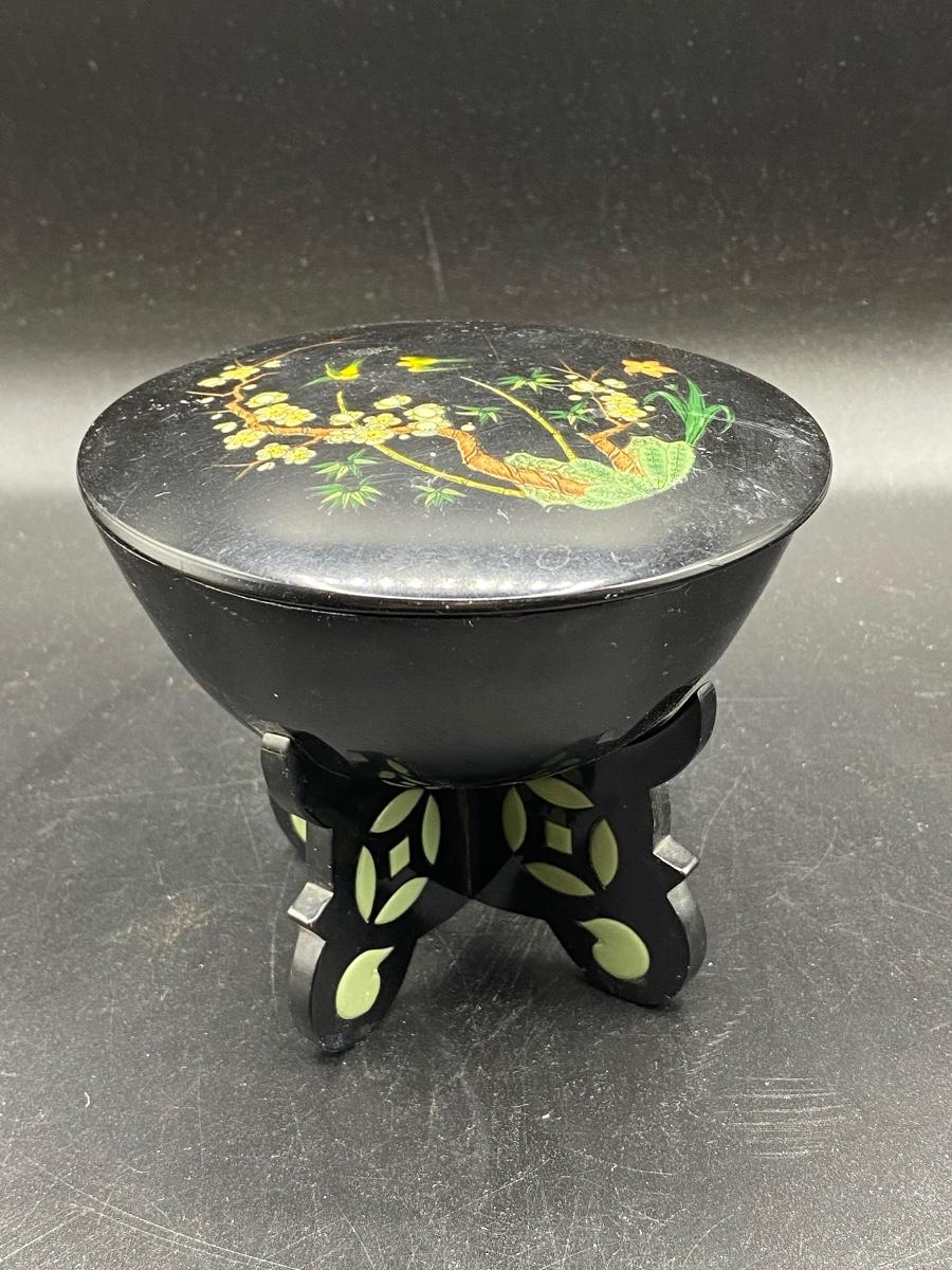 Small footed plastic trinket dish. Asian style design. Flowers and swallows on the lid. Does have signs of age and use.