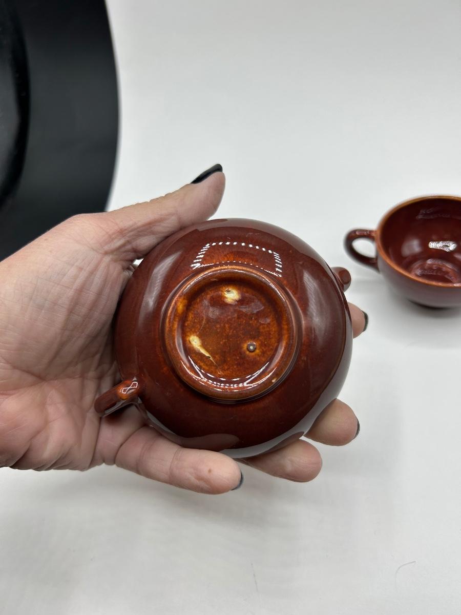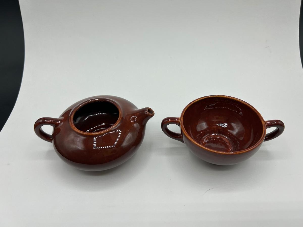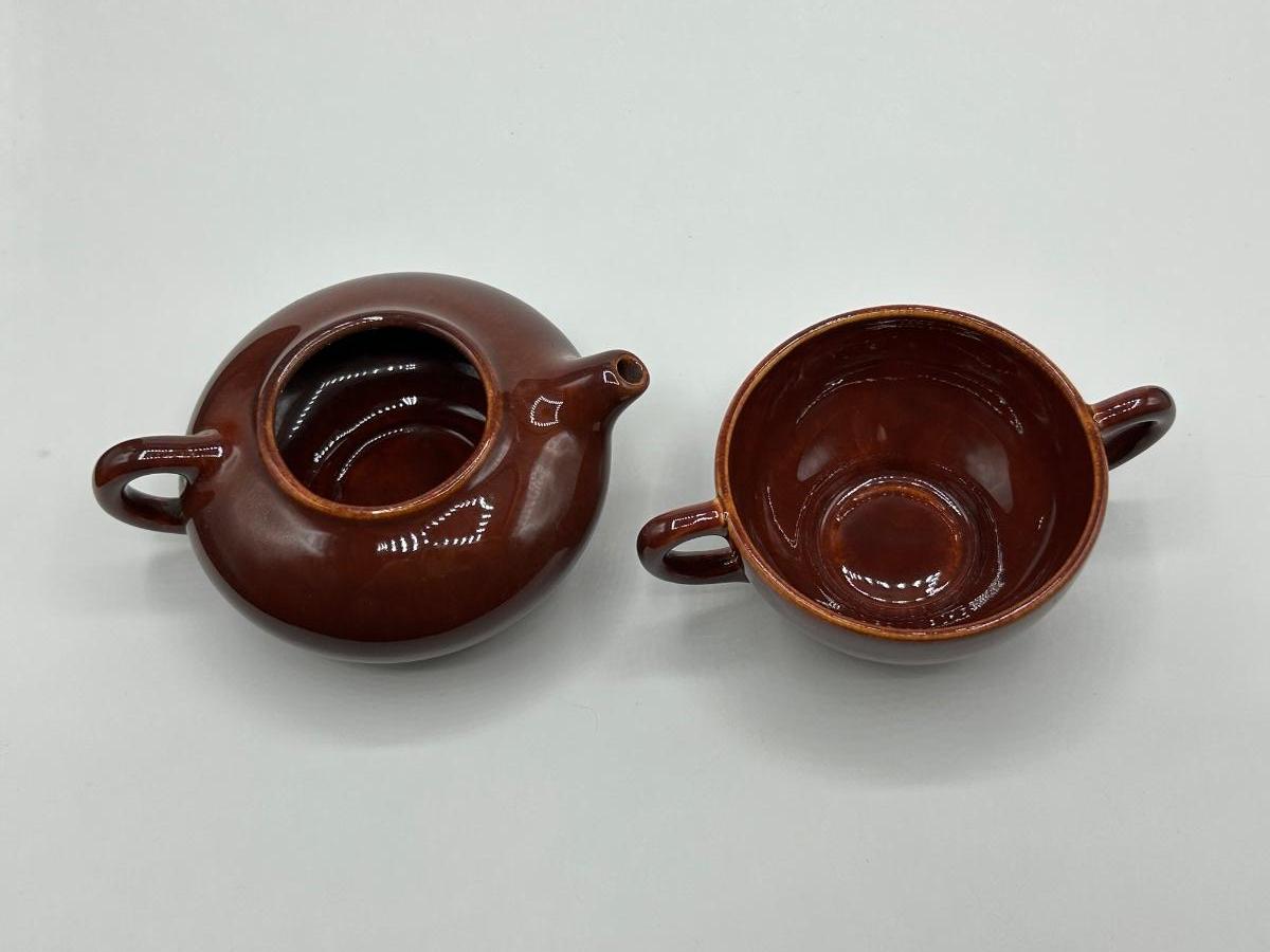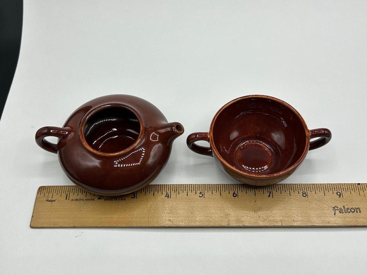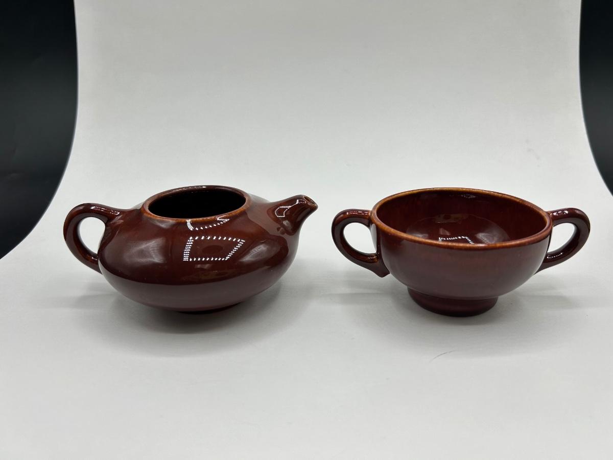 Vintage Deep Brown California Pottery Personal Teapot and Double Handle Open Sugar Bowl. Great for display. In good condition. Teapot is same size as bowl, no lid but looks good as is.