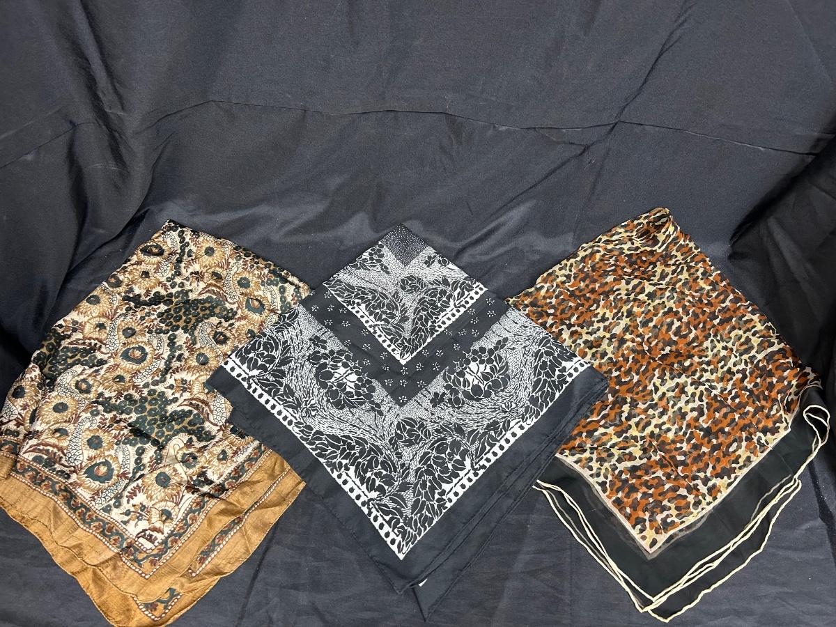 Lot of Three Black and Brown Tone Silk Polyester Scarves Head Neck Scarf