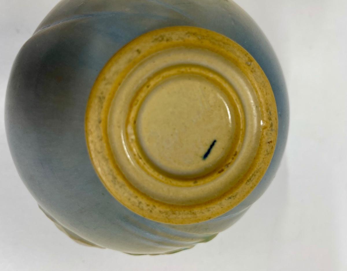 We could not detect a mark on the bottom, but shape & color appear consistent with Roseville. In good vintage condition.