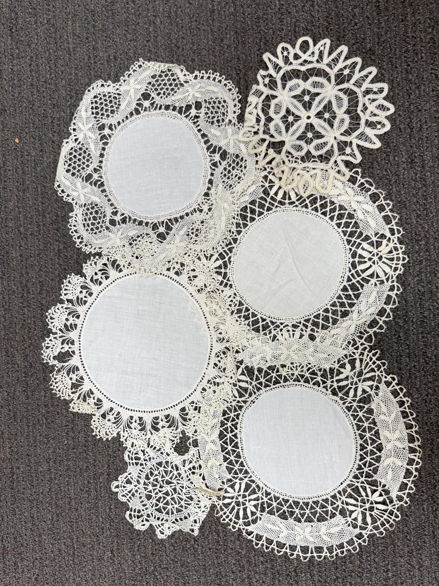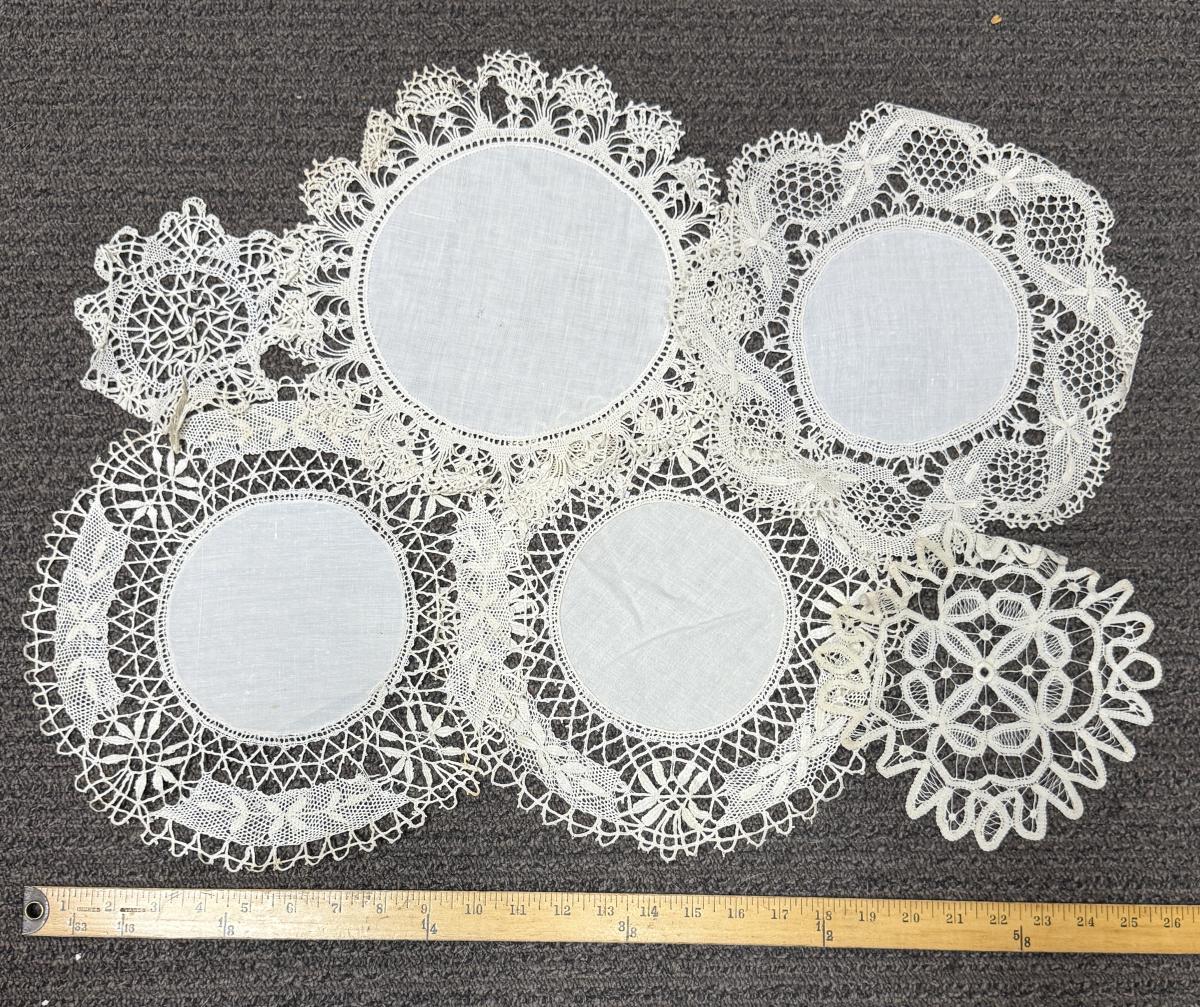 Handmade Antique Vintage Linen Lot - 6 Table Round Doilies white cream