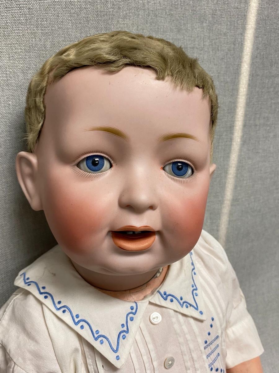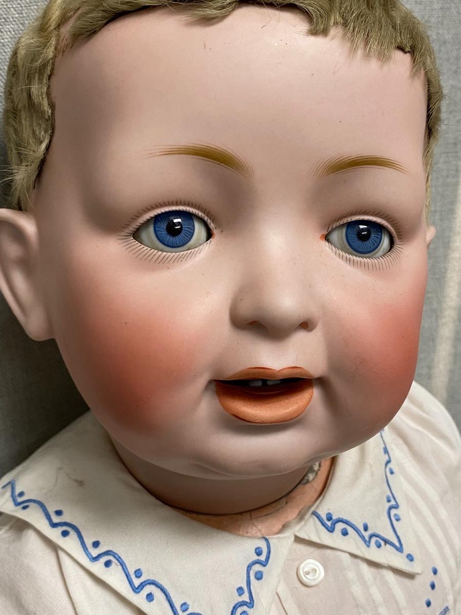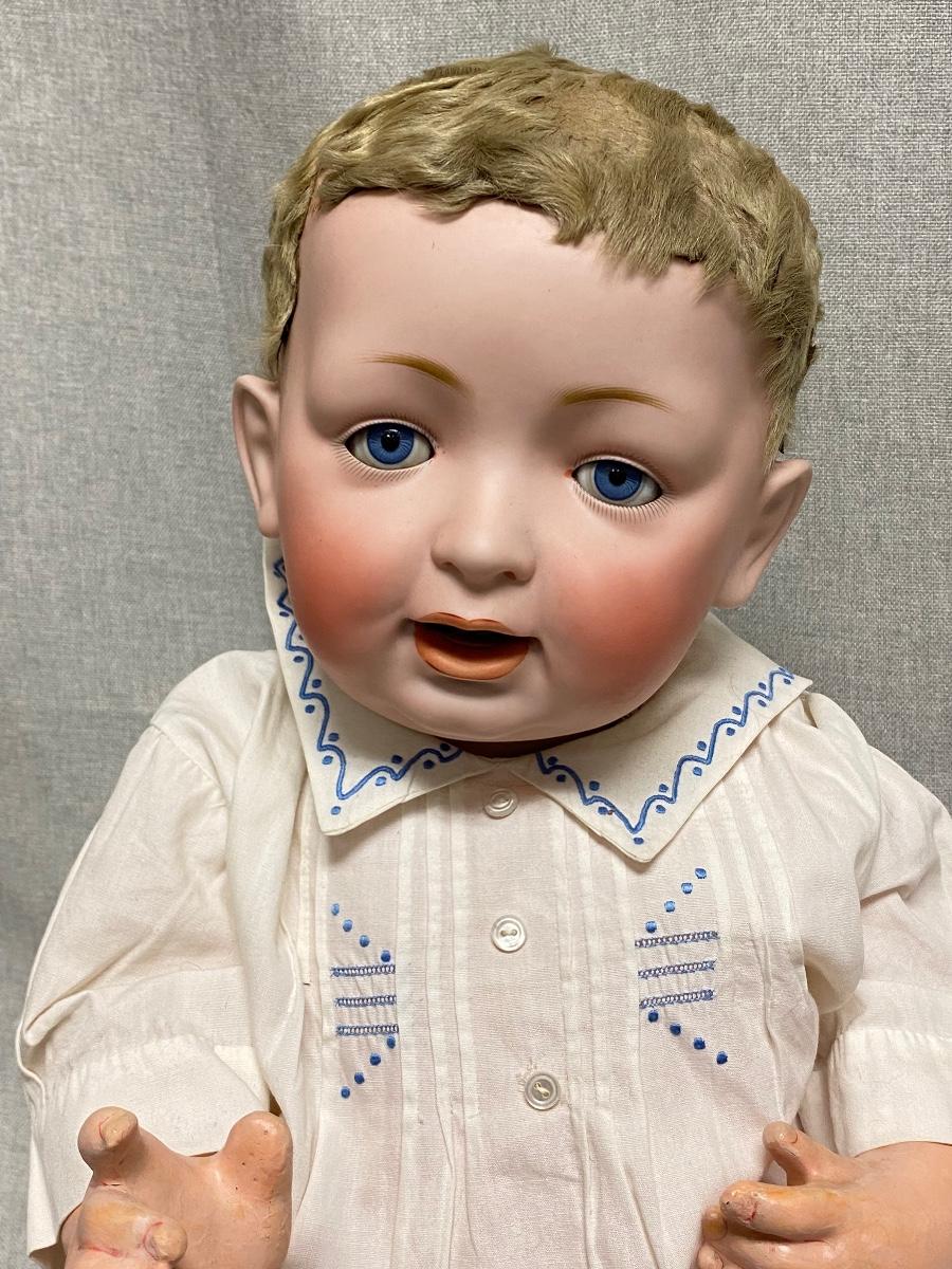 Antique Bisque & Composite Boy Baby Doll. Bright blue eyes, open mouth with bottom teeth. Hair is glued on to head, can only make out part of the marks on back, believe it is a JDK 211 "Sammy" character doll, In good antique condition.