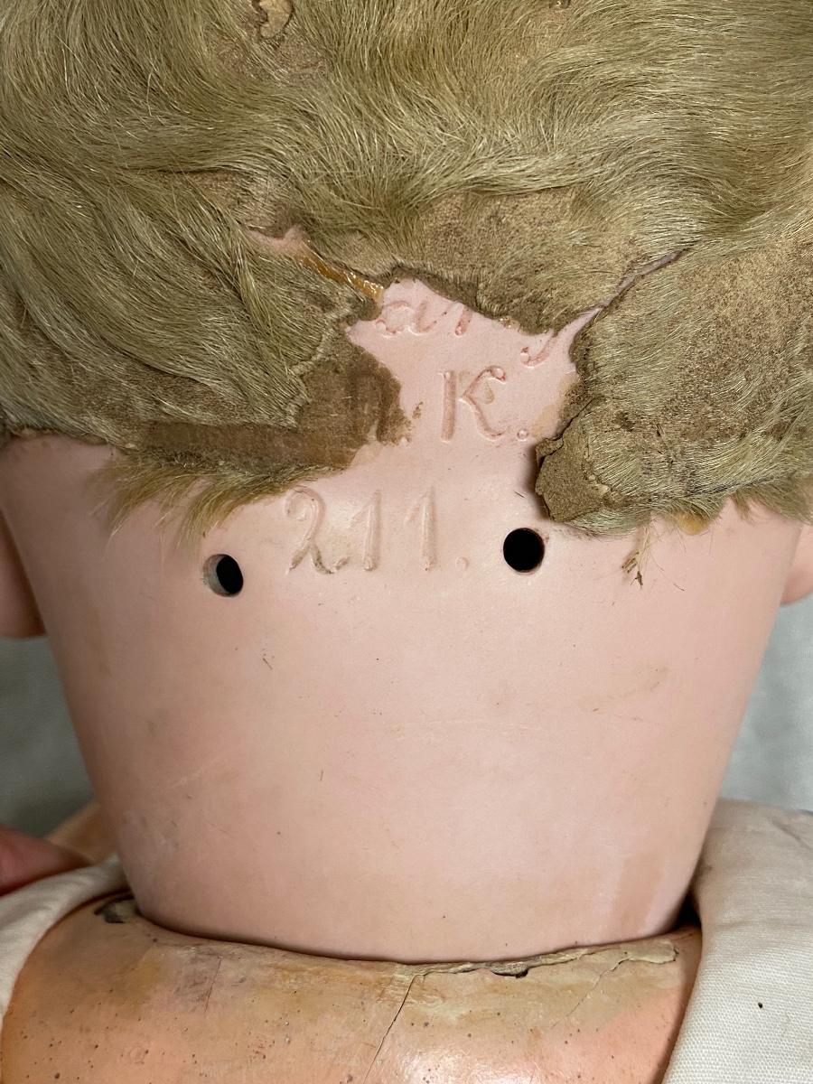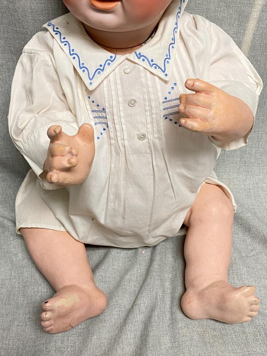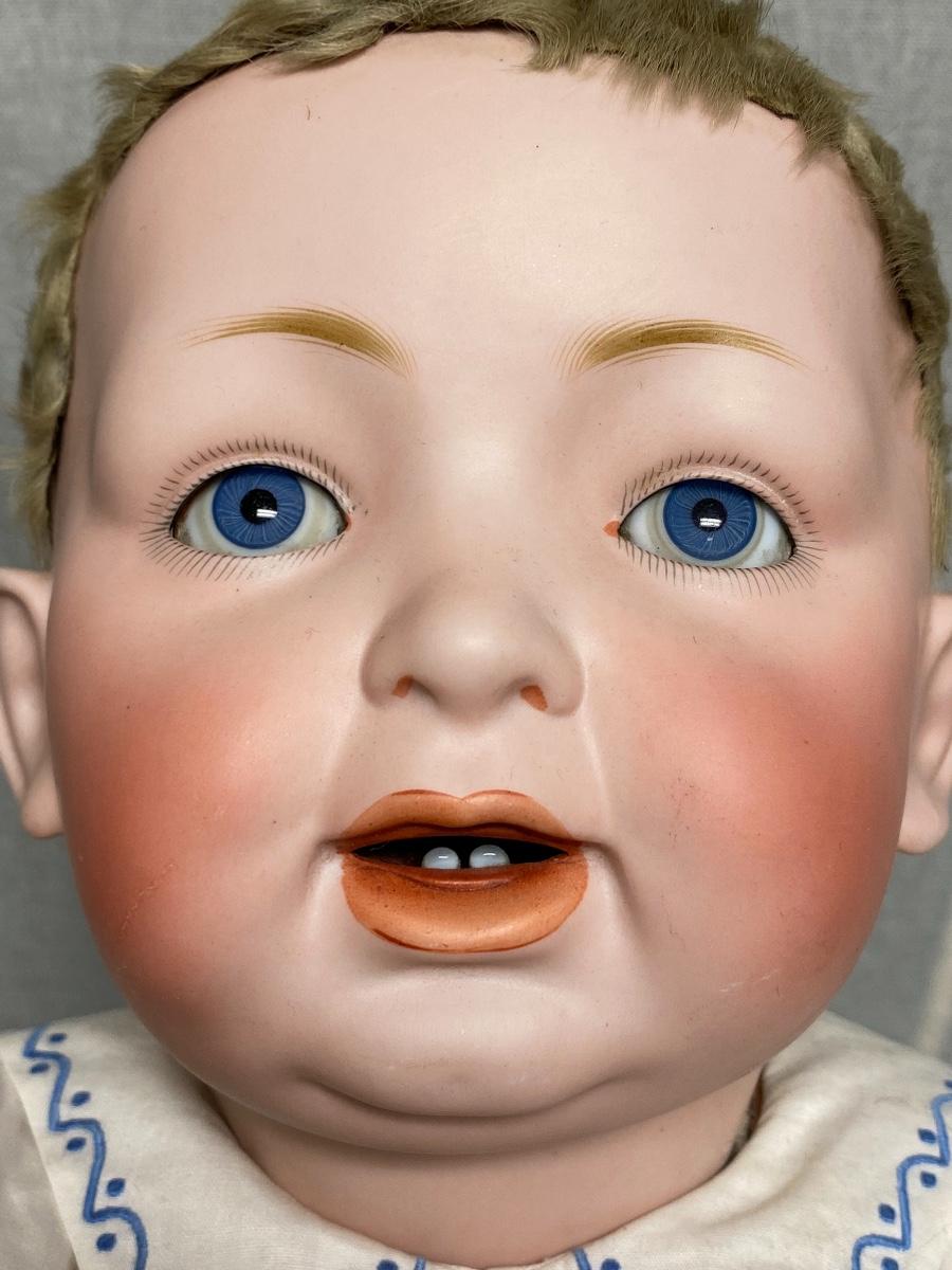 Antique Bisque & Composite Boy Baby Doll. Bright blue eyes, open mouth with bottom teeth. Hair is glued on to head, can only make out part of the marks on back, believe it is a JDK 211 "Sammy" character doll, In good antique condition.