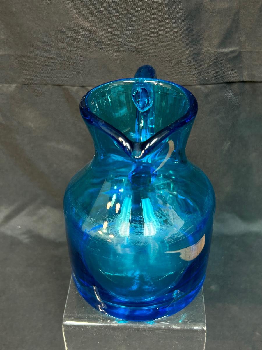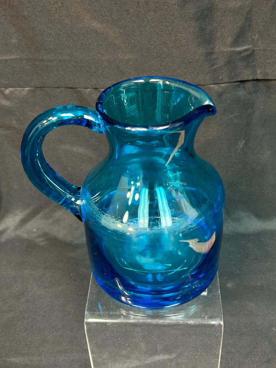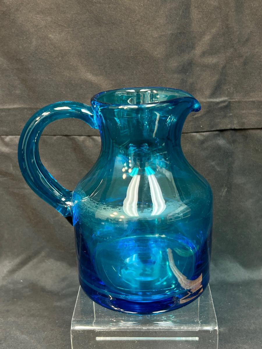 Turquoise Blue Blown Art Glass Small Pitcher. In good condition. Unsigned. About 6" tall. Great for display or use.