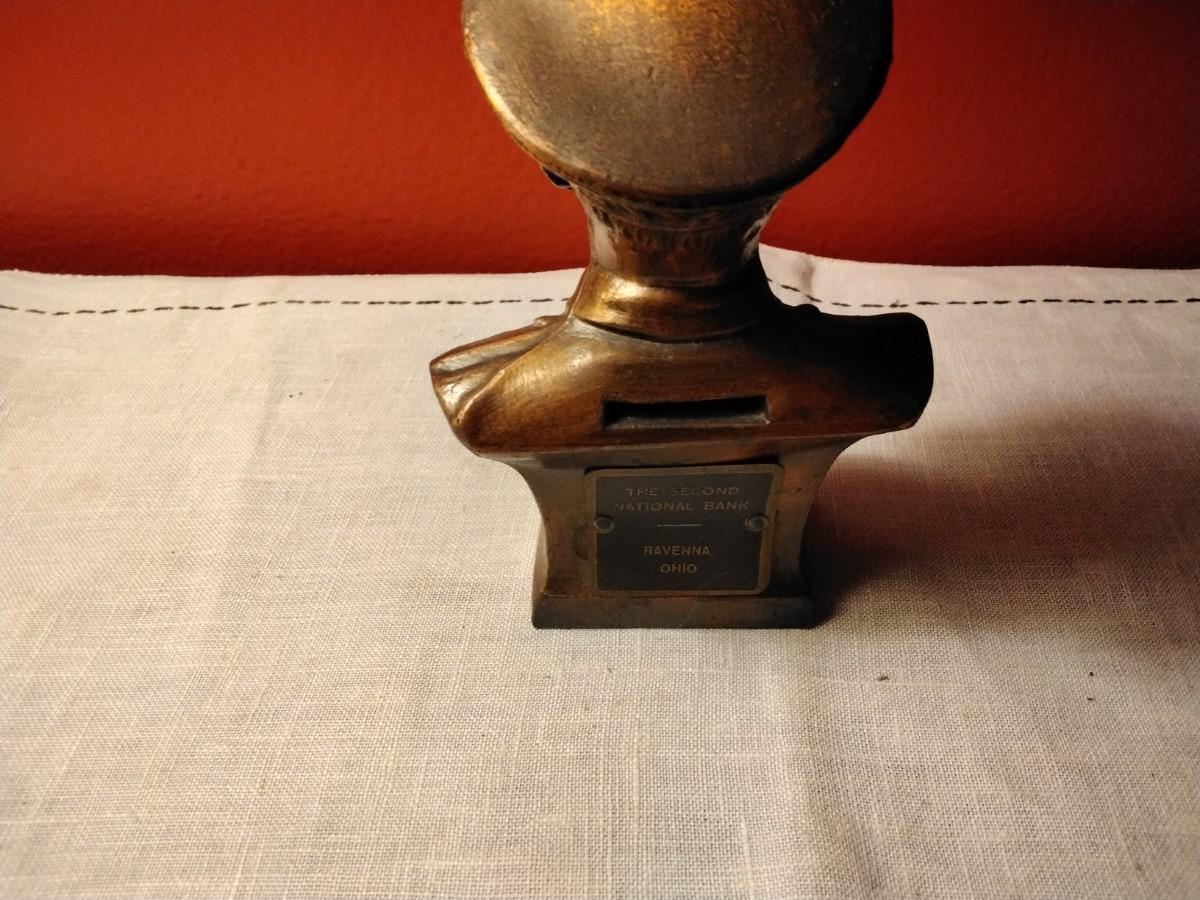 AC Williams was located in Ravenna Ohio and made metal slot banks. This one is a promotion piece for the local bank and is a composite brass colored piece..